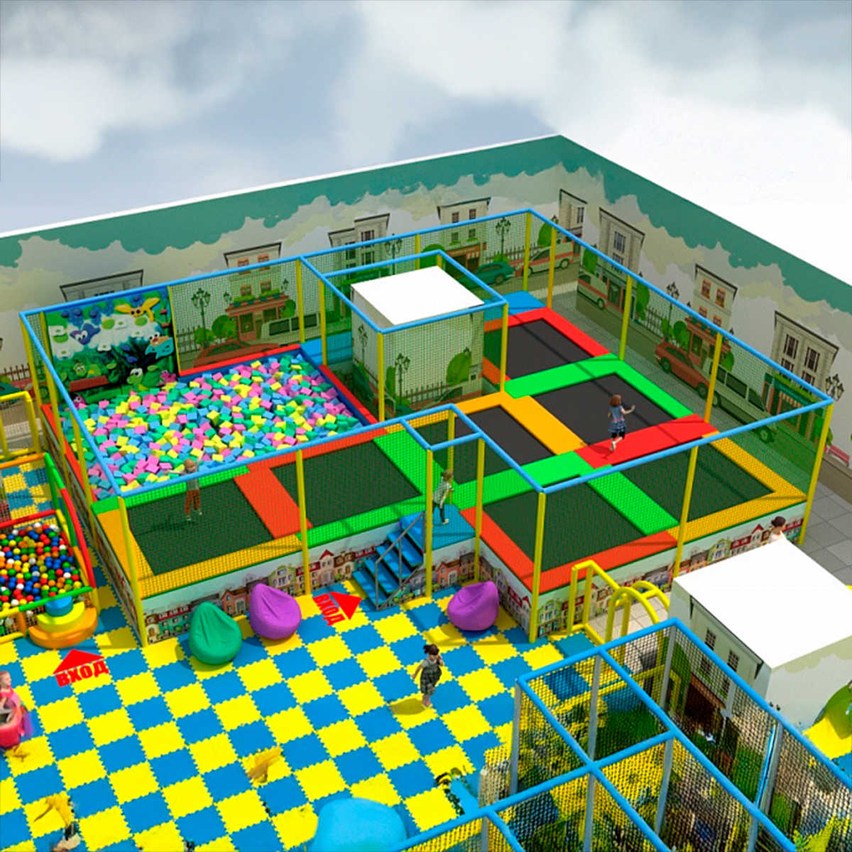 Размеры: 11,3 × 9,4 м — это оптимальное пространство, позволяющее детям свободно перемещаться и играть одновременно в нескольких зонах.