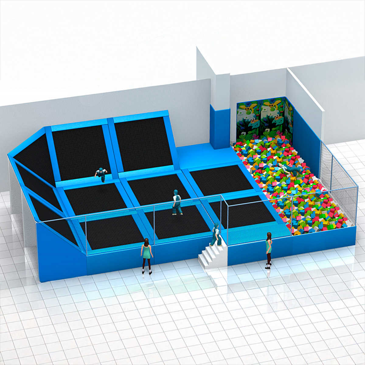 Батутная арена включает в себя всё необходимое для безопасных и увлекательных развлечений: 11 батутных секций, включая наклонные поверхности, большую поролоновую яму с разноцветными мягкими кубиками, защитное сетчатое ограждение и удобную лестницу для подъёма.