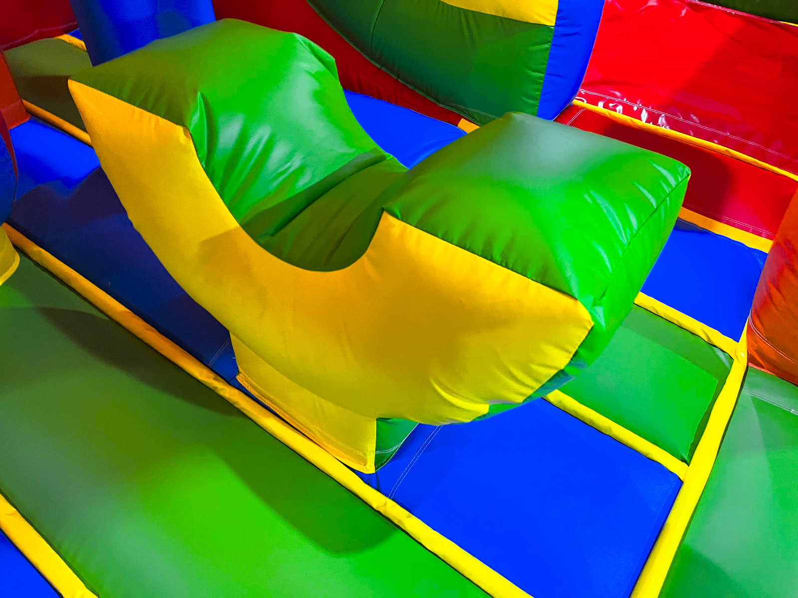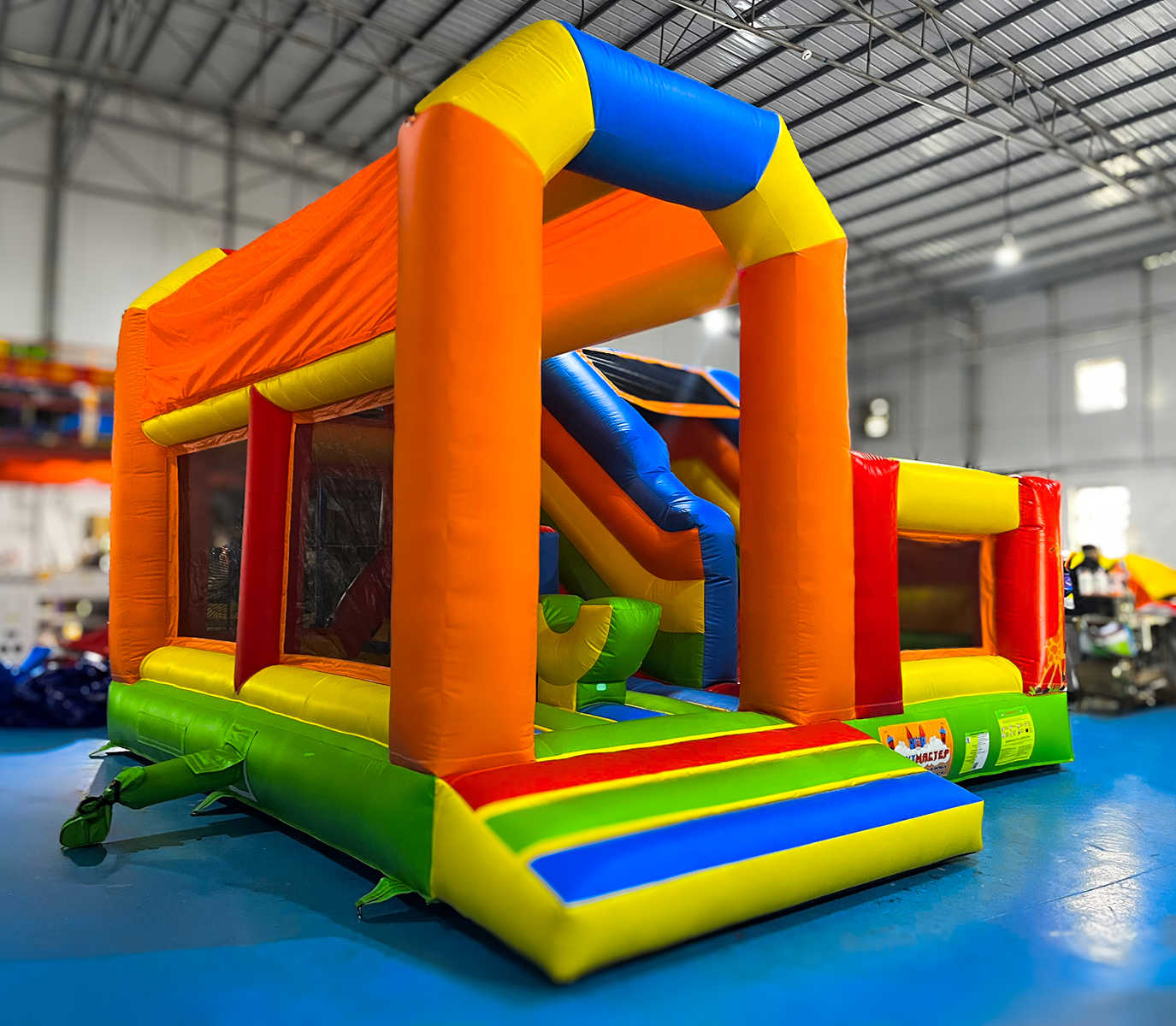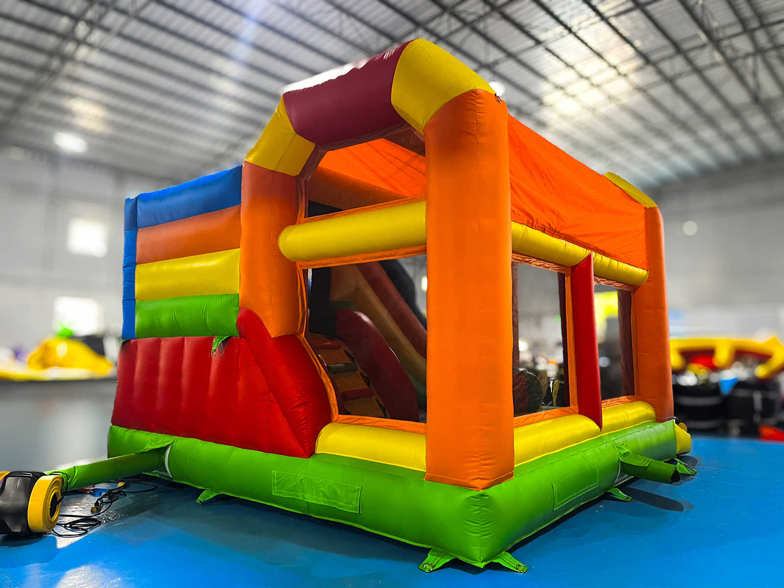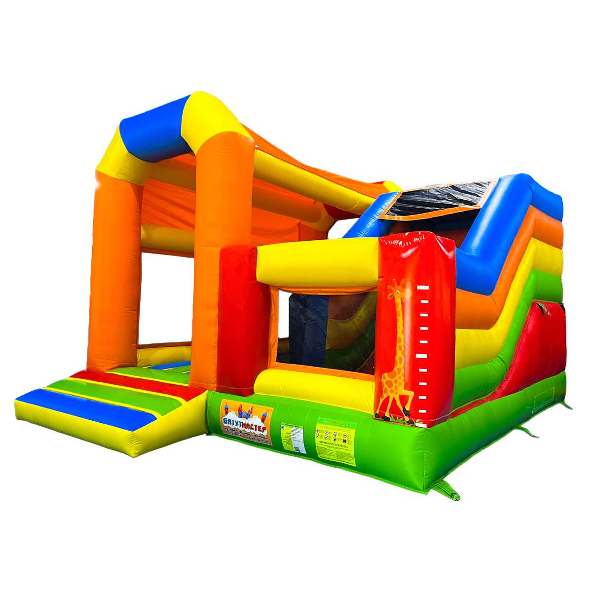 Коммерческий надувной батут «Радужный» с крышей, размерами 5,9x5x3,5 метра, создан для активных и увлекательных игр детей в возрасте от 3 до 11 лет. Его яркий, многоцветный дизайн мгновенно притягивает внимание, а продуманная структура обеспечивает максимальную вовлечённость детей в игровой процесс. Батут включает в себя горку с высотой от земли 1,5 м, пандус-ступень, арки и препятствия — всё, что нужно для подвижных, весёлых и безопасных игр.