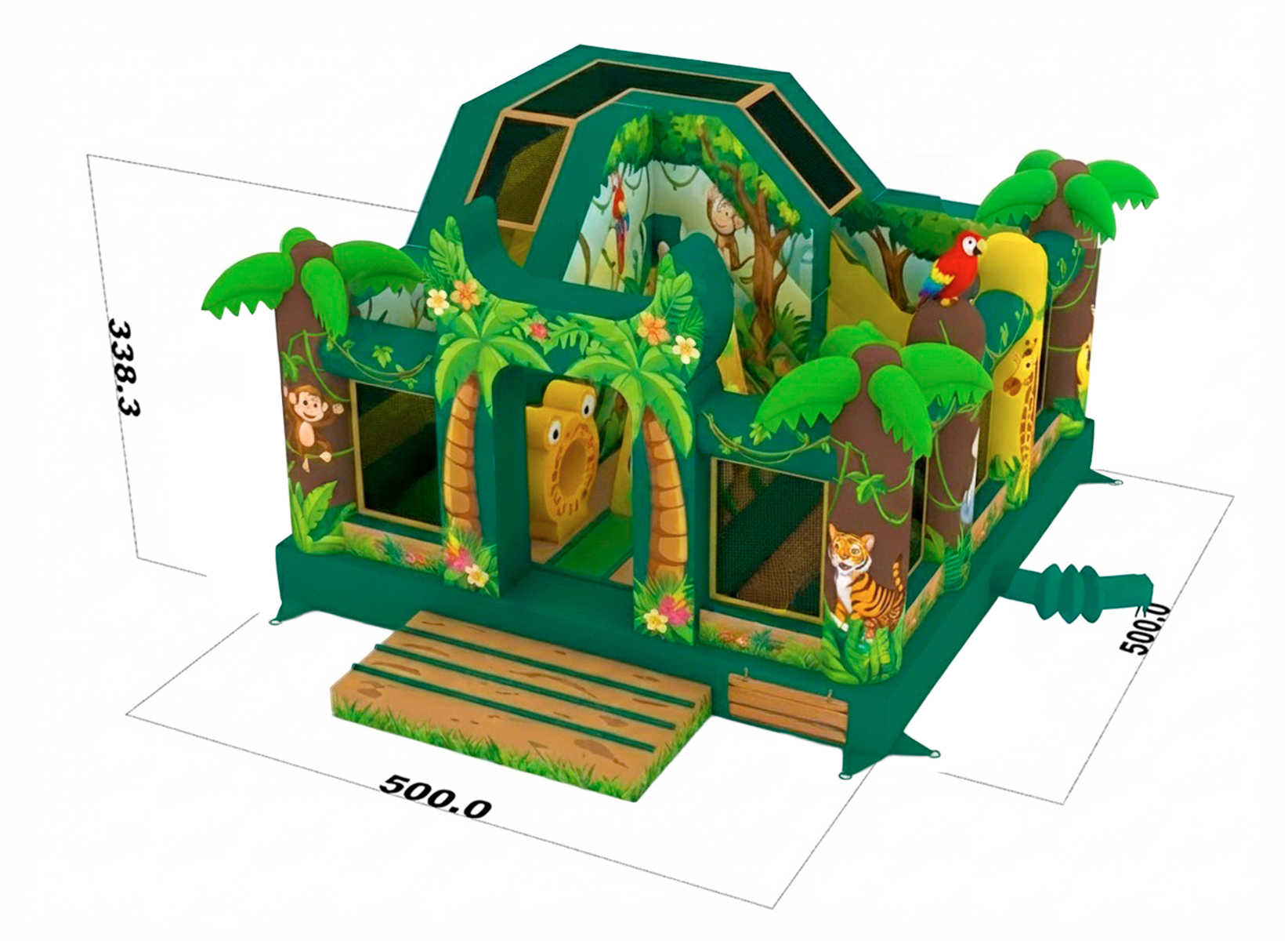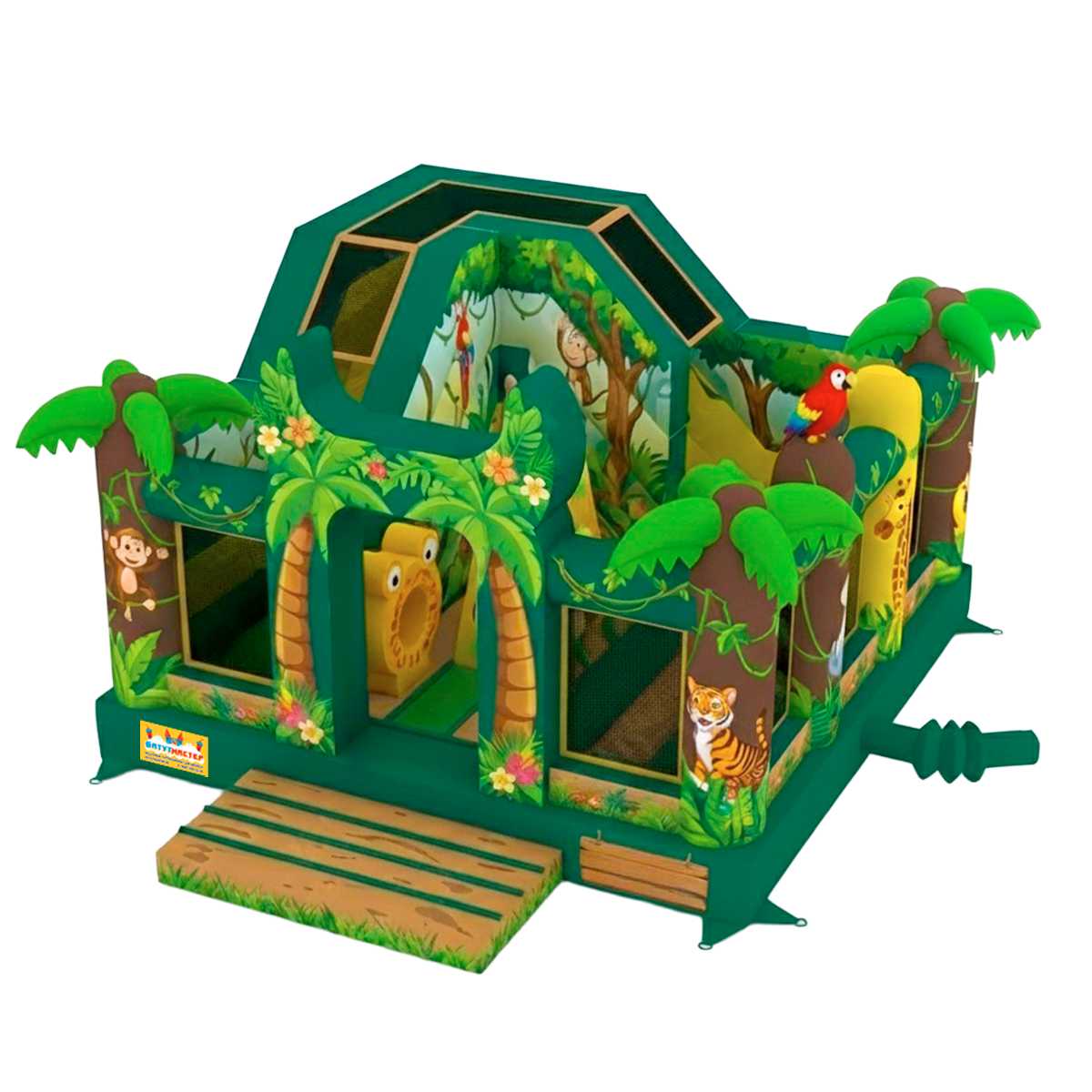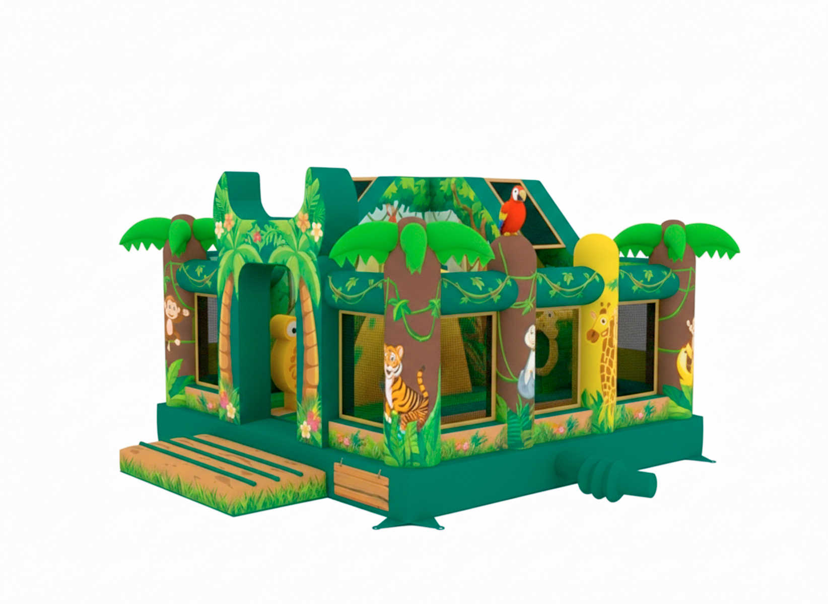 Этот батут — словно портал в волшебный тропический мир, где обитают тигры, попугаи, жирафы и обезьянки. Все элементы выполнены в насыщенной, сочной гамме зелёного, жёлтого и коричневого цветов, что усиливает эффект присутствия в настоящих джунглях.