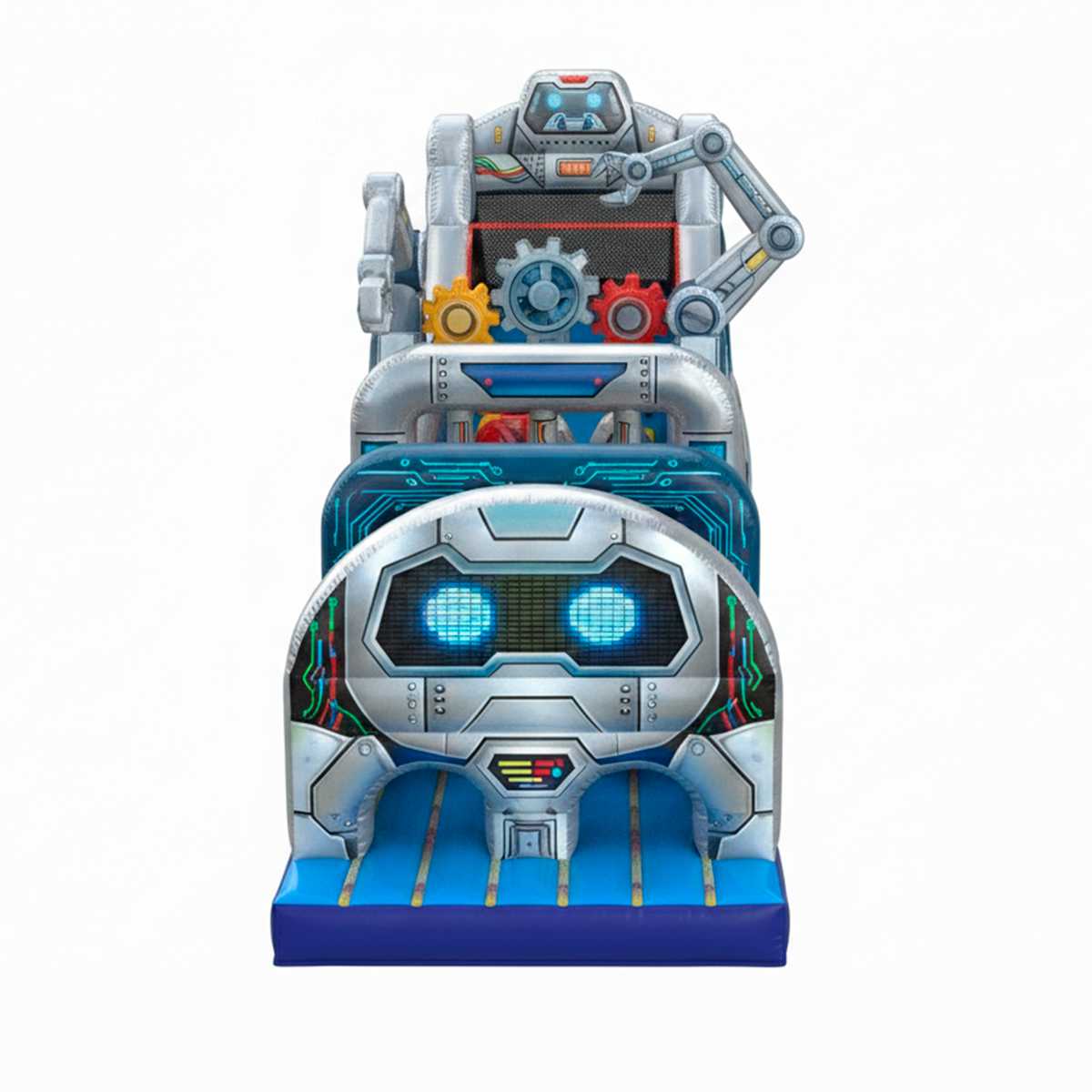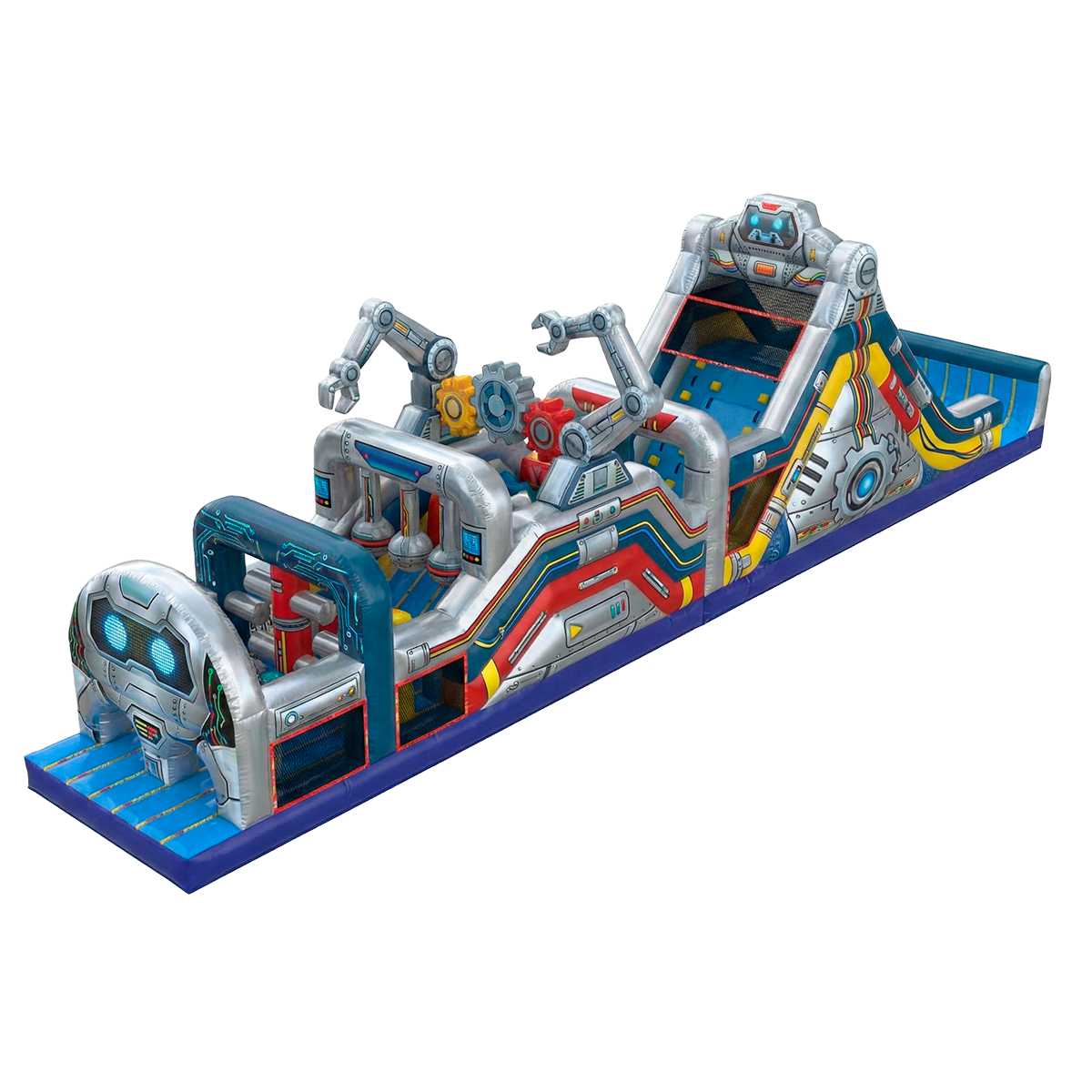 «Город роботов» — это не просто полоса препятствий, а целая технологическая вселенная, погружающая участников в атмосферу фантастического будущего. Дизайн оформлен в стиле высокотехнологичного завода, где движущиеся робо-руки, стилизованные трубы, провода, арки и шестерёнки создают антураж научной лаборатории. Визуально аттракцион выглядит как оживший завод роботов, и это неизменно вызывает восторг у детей и подростков.