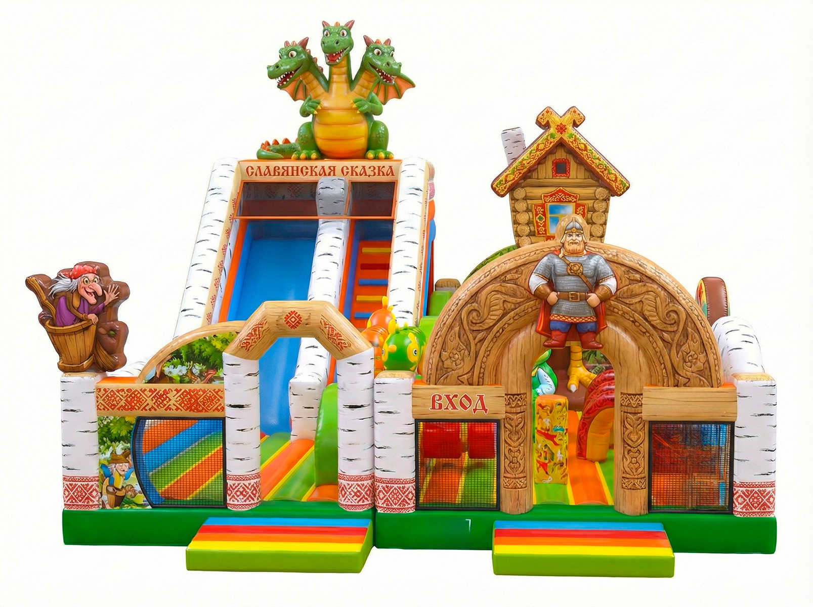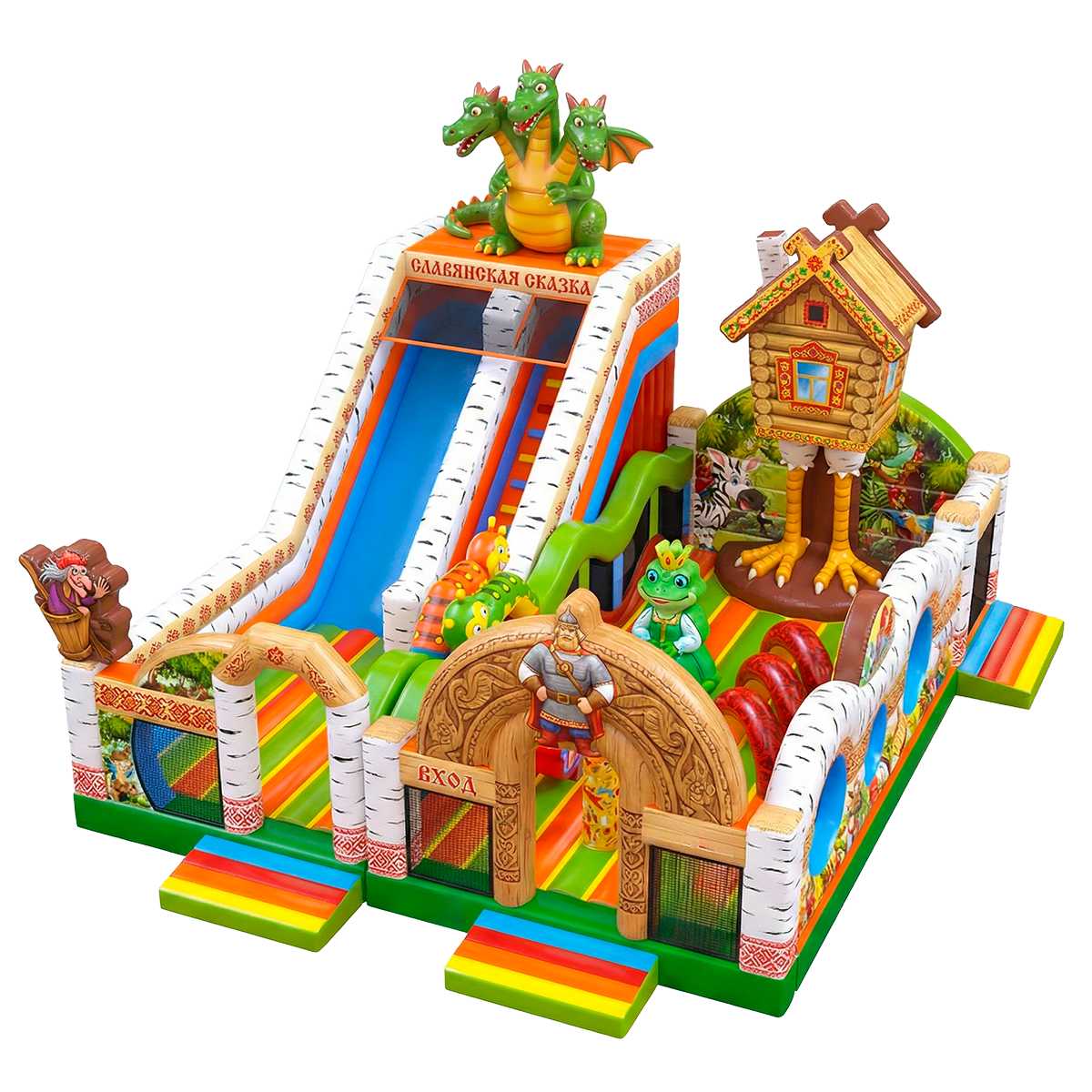 Коммерческий надувной батут «Славянская сказка» — это тематический аттракцион, выполненный в стиле любимых русских народных сказок. Он моментально притягивает внимание детей и родителей: