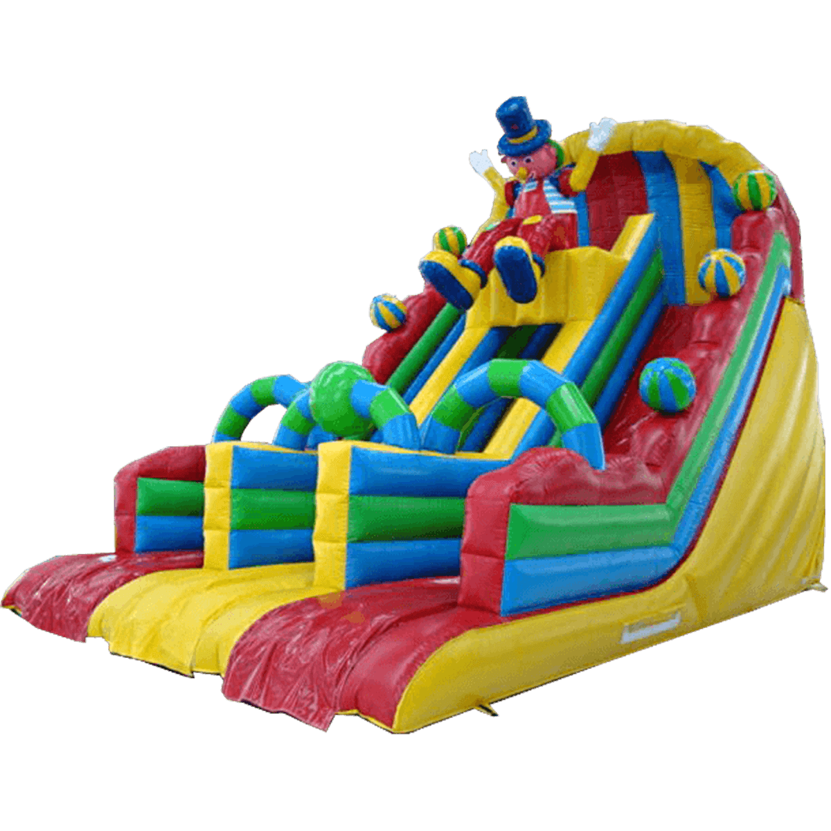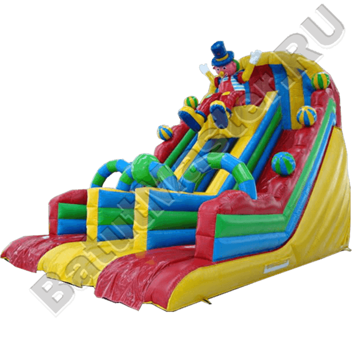 Детский надувной батут-горка «Скоморох» состоит из трёх больших горок, средняя горка является подъёмом. В верхней части горки расположена большая надувная фигура скомороха. Бортики батута украшены надувными мячиками. Нижнюю часть горок обрамляют арки, на которых можно написать приветствие или текст, по выбранной вами тематике. Задняя часть батута закрыта стенкой, необходимой для безопасной игры детей.