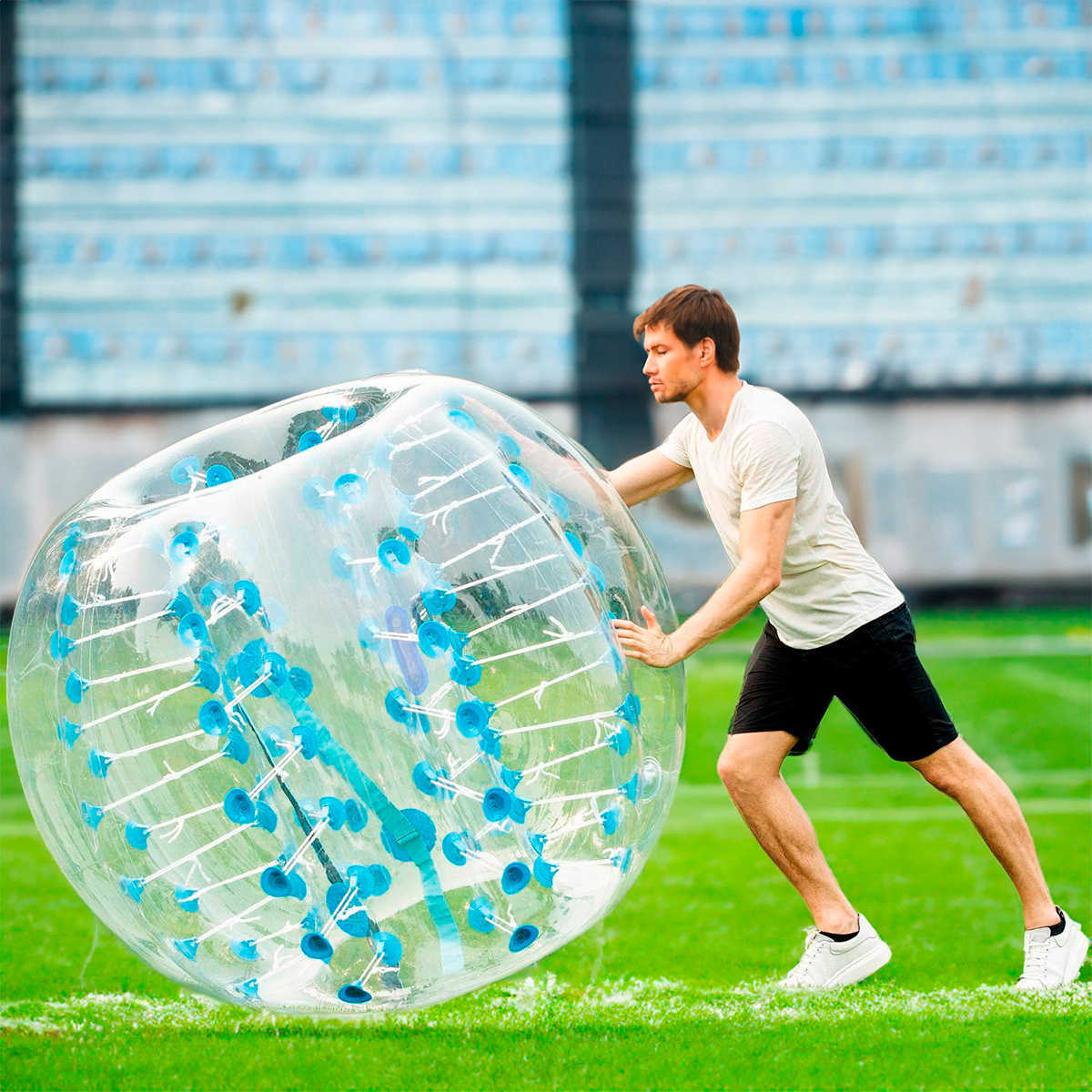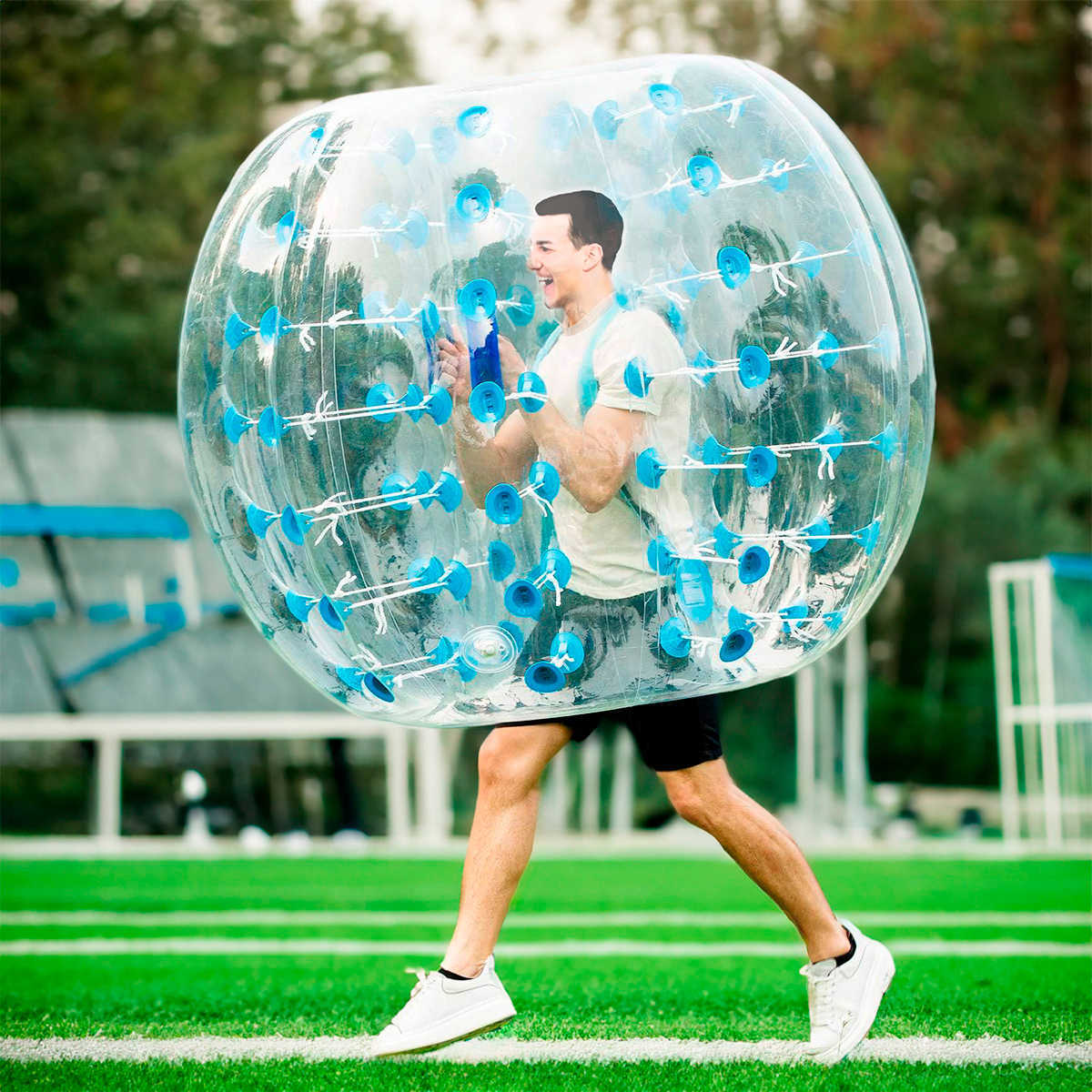 Зимой: снежные площадки, катки с мягким покрытием, ледовые арены (с подложкой), горнолыжные курорты, зимние парки развлечений, новогодние ярмарки. Бампербол отлично подходит для игр на снегу — столкновения мягкие, падения безопасные, а прозрачная сфера с синими элементами ярко выделяется на белом фоне.