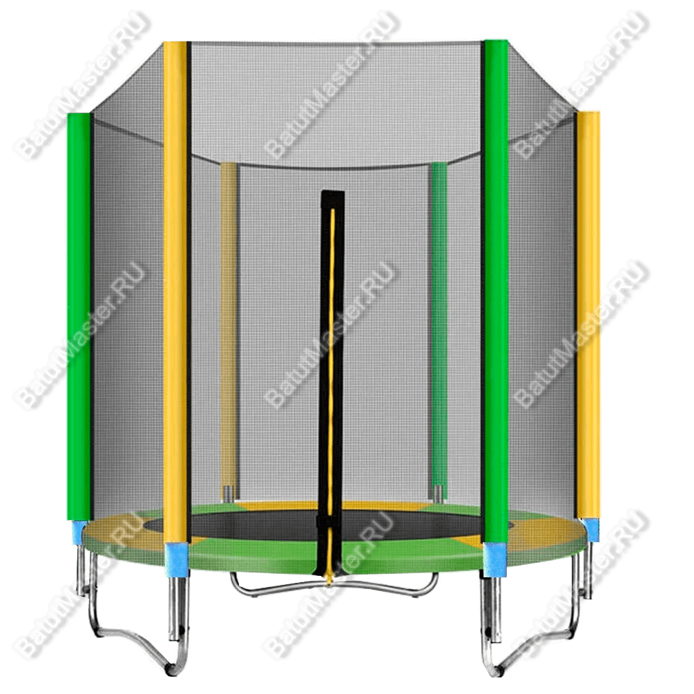 Конструкция каркасного батута выглядит привычно – металлический остов, монтирующийся снизу вверх, полотно из полипропилена и защитная сетка из нейлона с уникальным размером ячейки, который не дает пропустить через себя руки и ноги посетителей. Над полотном в высоту 1.8 проходят металлические колонны, обернутые в мягкий рукав и ПВХ желтого и зеленого цвета. Точно такой же материал застилает пружинный блок площадки. В центре (с фасадной стороны батута) вмонтирована молния-застежка для входа. Для стабильности внизу ножки выполнены в форме буквы П.