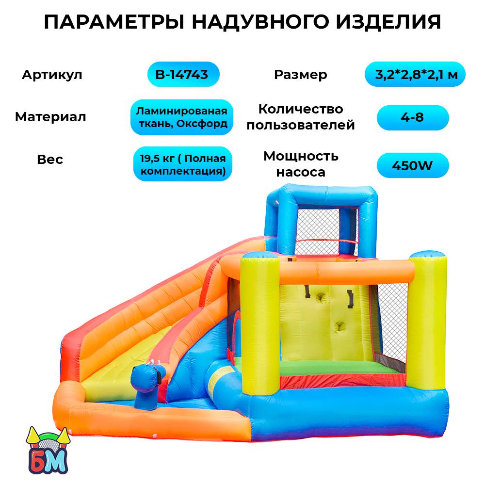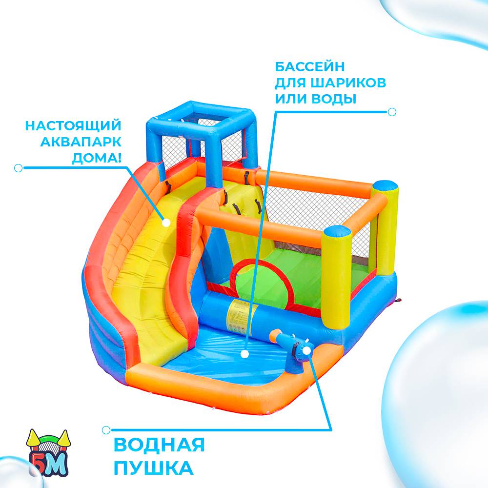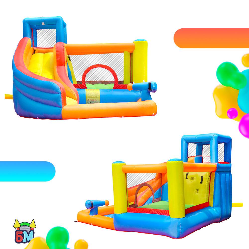 Один может скатываться с горки, а второй ребёнок должен стоять у пистолета, направлять его и стрелять водной струёй. Этот элемент у аттракциона вызовет больше всего восторга у малышей. К тому же этот пистолет выделяет надувной батут «Малыш» среди остальных.