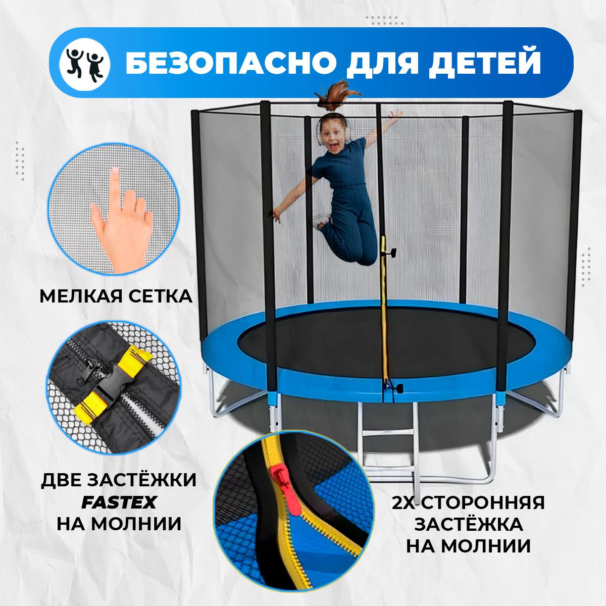 Каркасный батут с защитной сеткой безопасный и простой снаряд для тренировок и просто для развлечений. Благодаря не растягивающейся сети выпасть наружу просто невозможно; кроме того, она оснащена двусторонней молнией и дополнительными пластиковыми фиксаторами.