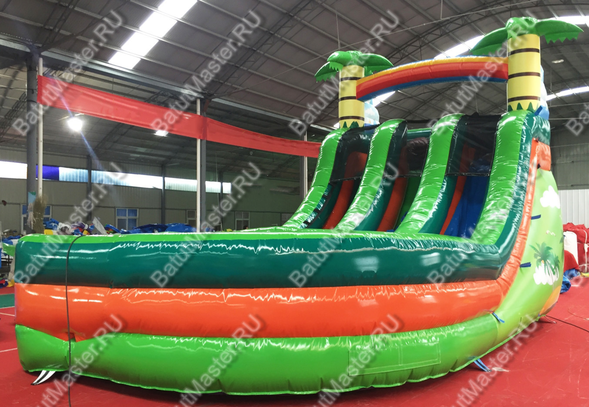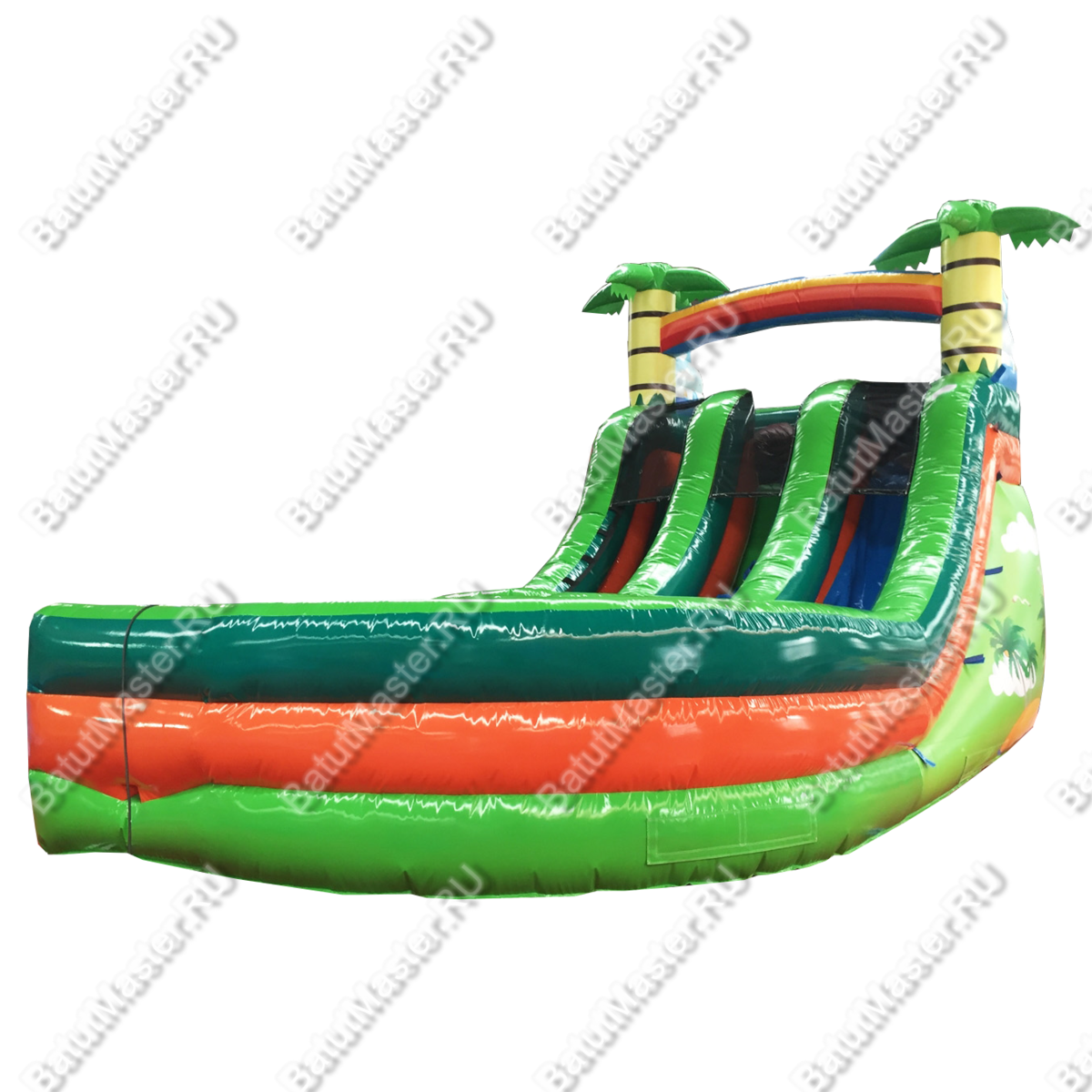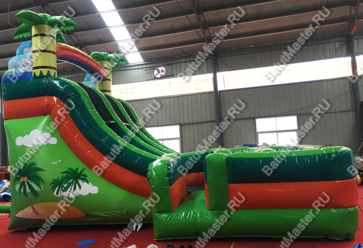 Батут-горка, сделанный в виде небольшого зелёного острова, поразит воображение детишек. Увидев такой красочный и сочный аттракцион, многие не удержатся и захотят прокатиться с него. И это неудивительно, потому что приятные цвета, общий дизайн и прорисованные элементы, которые свойственны острову, точно понравятся детишкам.