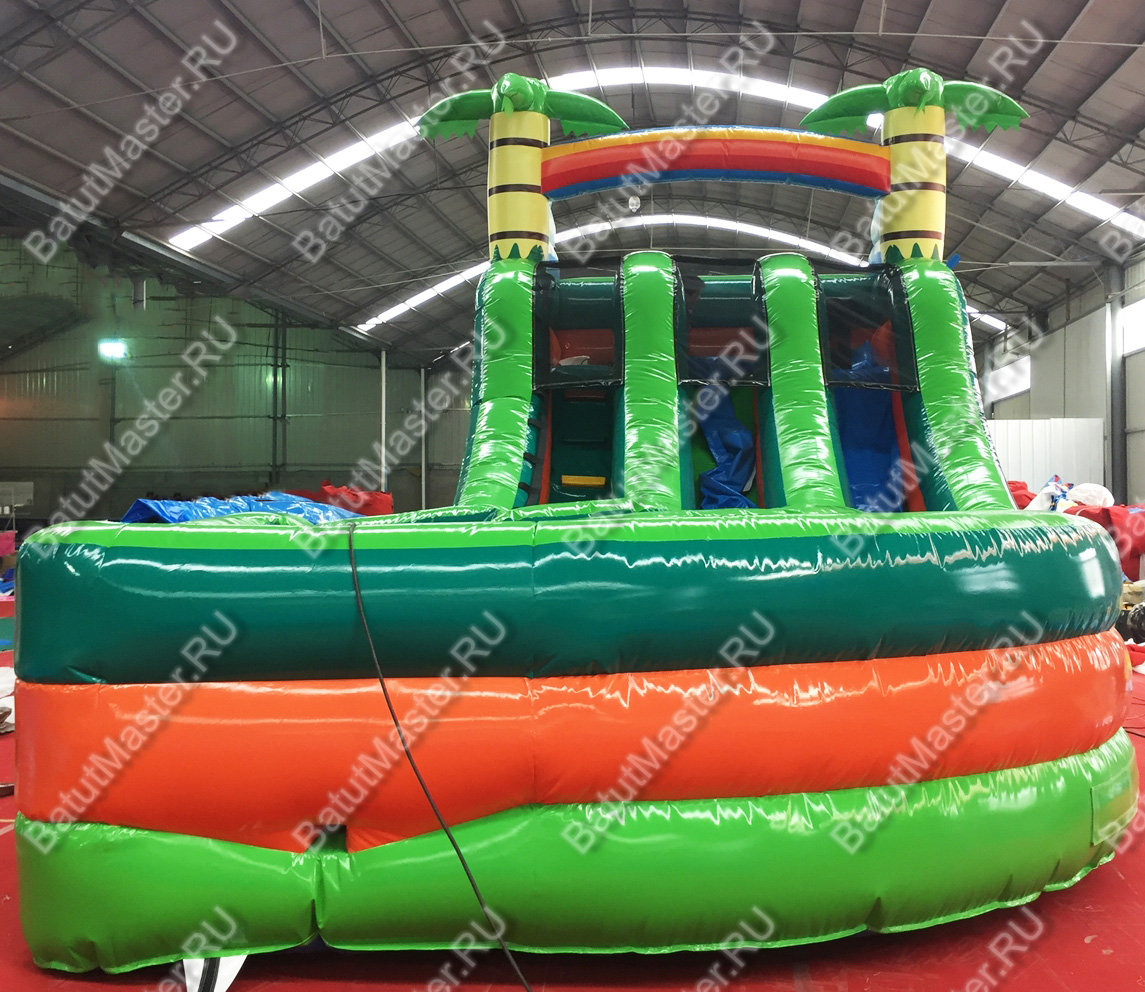 Наверху возвышается две пальмы, а снизу есть зона, куда дети приземляются после катания с горок. Также там найдётся место для тех, кто просто хочет попрыгать на батуте.