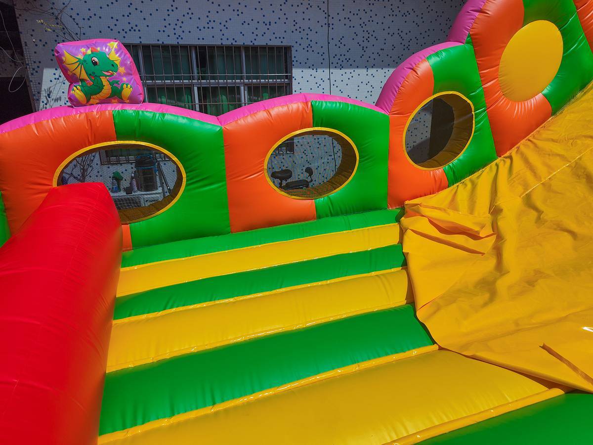 Коммерческий батут - горка сделан в ярких цветах, что сразу привлечет внимание издалека. Основа такой конструкции - качественный и высокоплотный поливинилхлорид. Изделие не растягивается и не меняет цвет под действием ультрафиолета. Кроме того оно прекрасно выдерживает минусовую температуру.