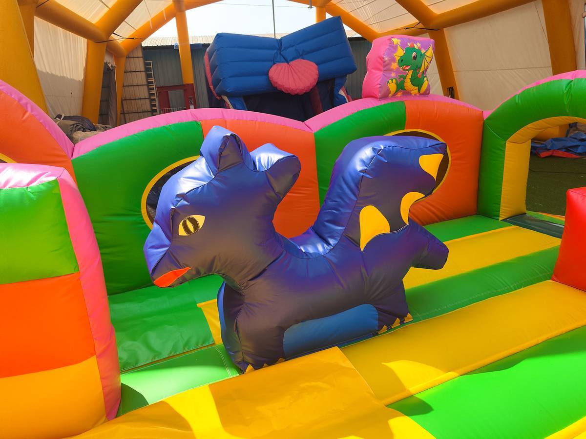 Коммерческий батут - горка на самом верху оснащен забавной фигуркой, а именно головой дракона. Боковые борта сделаны в имитации хвоста дракона с его клыками. Стоит отметить, что спереди имеется достаточно места для торможения. Прочная сетка на передней стенке позволяет видеть, как резвятся дети.