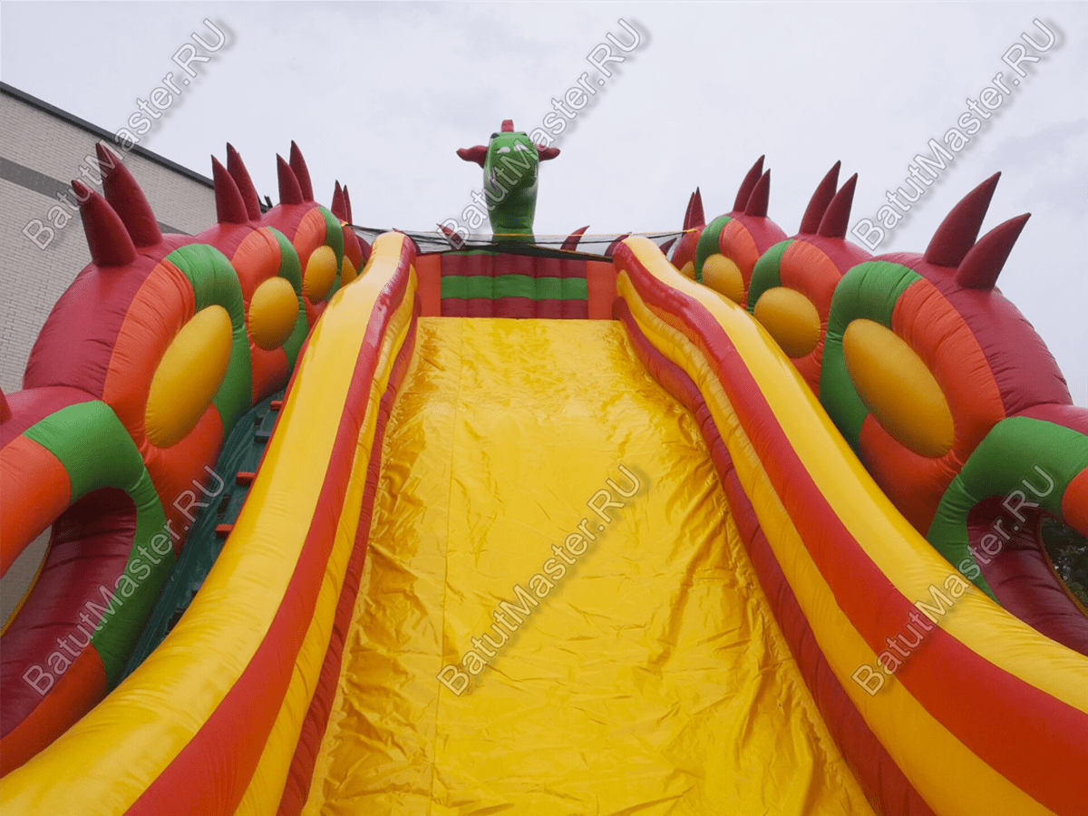 Левая и правая стены батута – это барьеры безопасности, созданные в виде колец: будто закрученный хвост дракона. Формы колец разноцветные и вверху украшены рядом белых надувных клыков. Вдоль стен справа и слева установлены лестницы с мягкими поручнями. По ним дети могут подняться на стартовую площадку, над которой размещена надувная голова дракона. Центральное место зоны горки занимает широкий желтый спуск, отделяемый от лестниц надувными барьерами.
