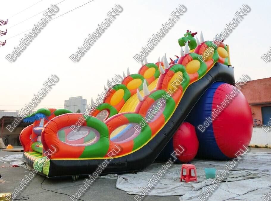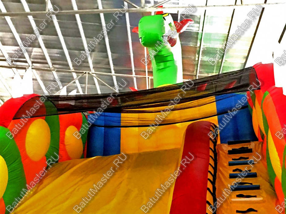 Коммерческий батут из ПВХ в виде высокой яркой горки с забавным драконом над стартовой площадкой – увлекательное развлечение, которое сделает ваш бизнес действительно успешным. Начинается батут с небольшой подушки у входа, за порогом для детей предусмотрена подготовительная зона, где дети готовятся преодолеть лестницу, а после спуска с горки оказываются именно здесь.