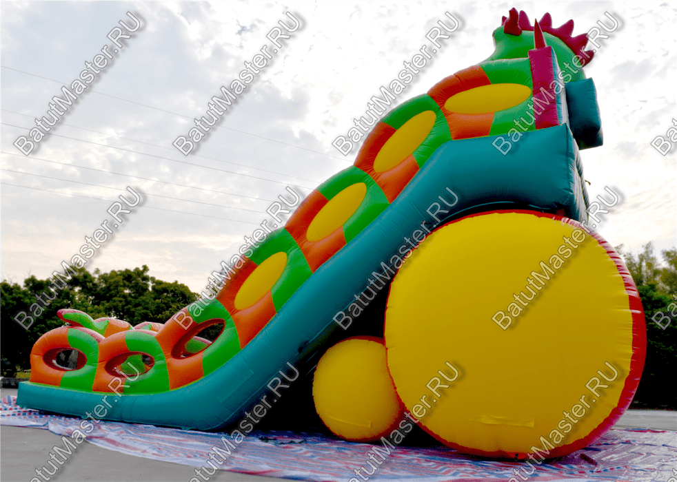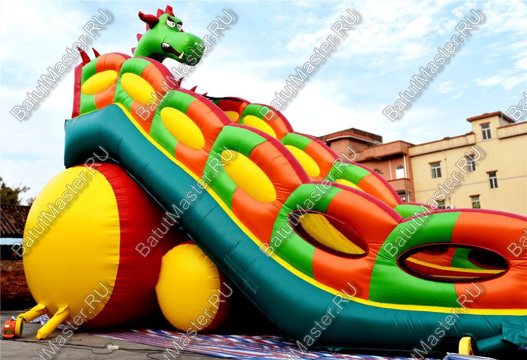 Надувной батут для бизнеса имеет мощную опору под горкой, а сверху красуется большая голова забавного дракона. Забираться наверх можно по двум сторонам, а катиться с горки дружной компанией одновременно. Море радости подарит такой аттракцион.