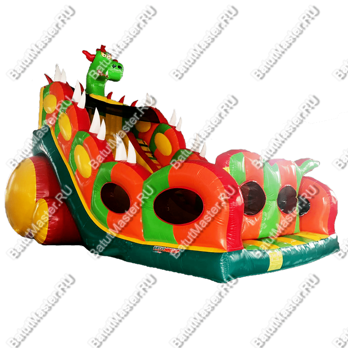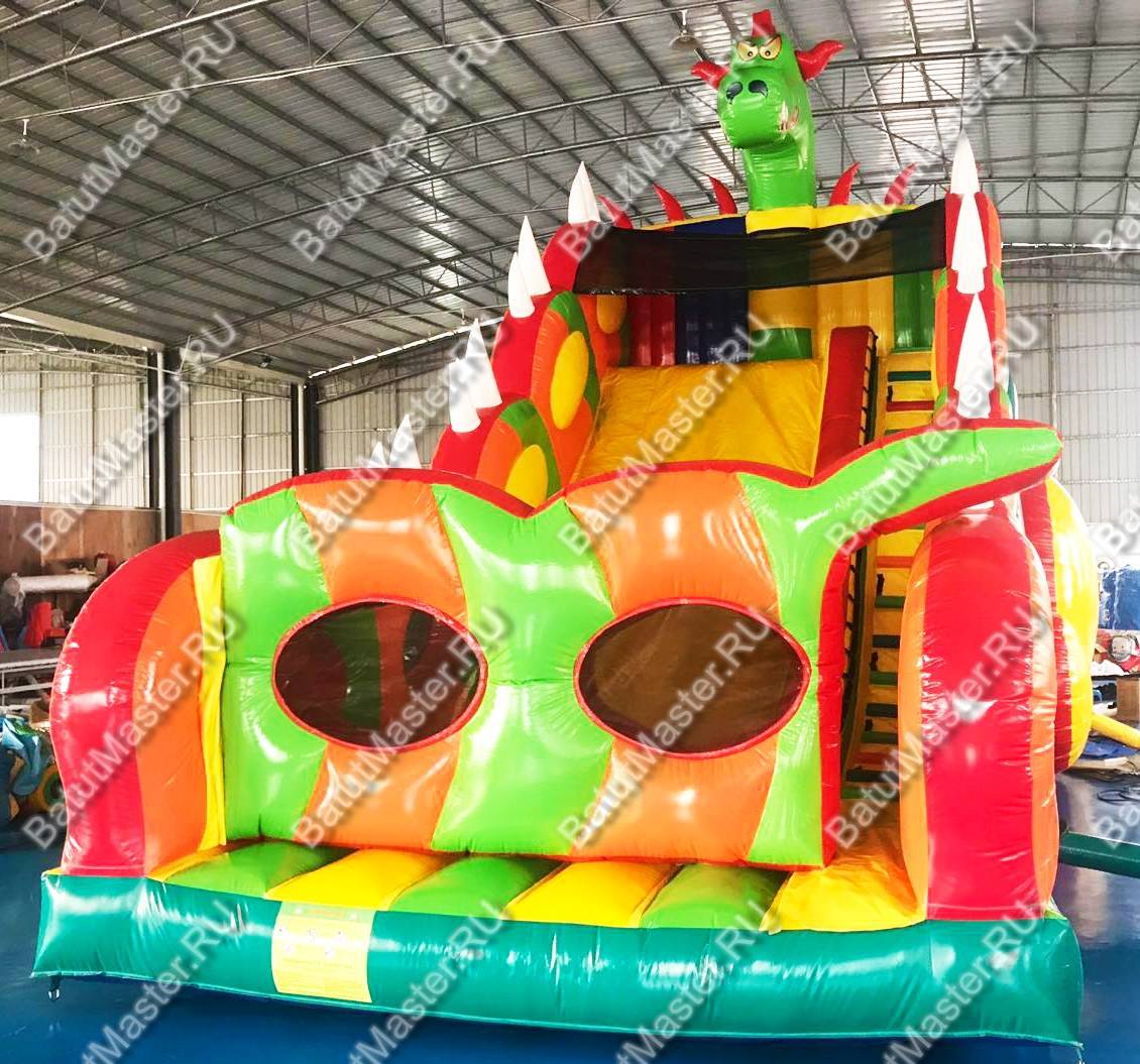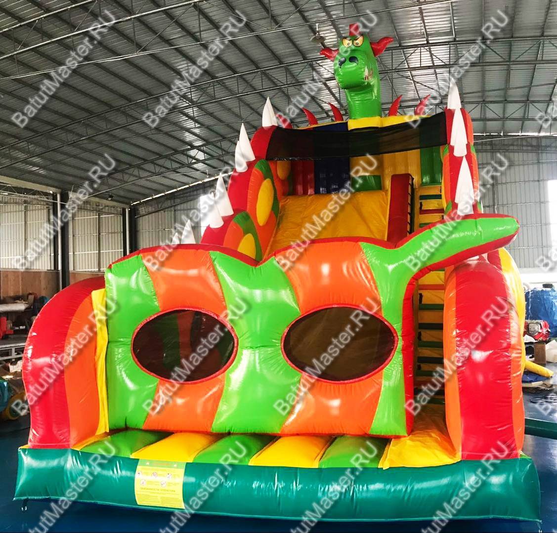 Надувной батут - горка батут представляет собой большую арену для самых веселых игр и прыжков. Вначале комплекса имеется зона для прыжков, где юным непоседам обязательно захочется попрыгать. Прямо по курсу имеется огромный подъем и спуск, сверху которого размещается голова дракона. По бокам высокие борта украшают шипы, что создает полную имитацию этого сказочного животного. Большая горка рассчитана сразу на несколько детей, ведь веселиться всем вместе намного интереснее. Забраться на горку следует по специальным порожкам в виде мягких модулей. Долгий спуск с высокой горки непременно оценят дети. Надувной батут рассчитан для бизнеса. Станет прекрасным дополнением игровой зоны для детей в торгово-развлекательном центре или на открытой детской площадке. Простой и яркий, имеет локации для физического развития детей, а именно выносливости, координации движения и силы. Коммерческий батут выполнен из прочного ламинированного материала, который не боится солнечных лучей и низкой температуры. Простой и неприхотливый в уходе. Имеет высокий уровень безопасности, кроме того, не имеет жестких элементов. По бокам имеются высокие борта, что предотвращает выпадение детей наружу.
