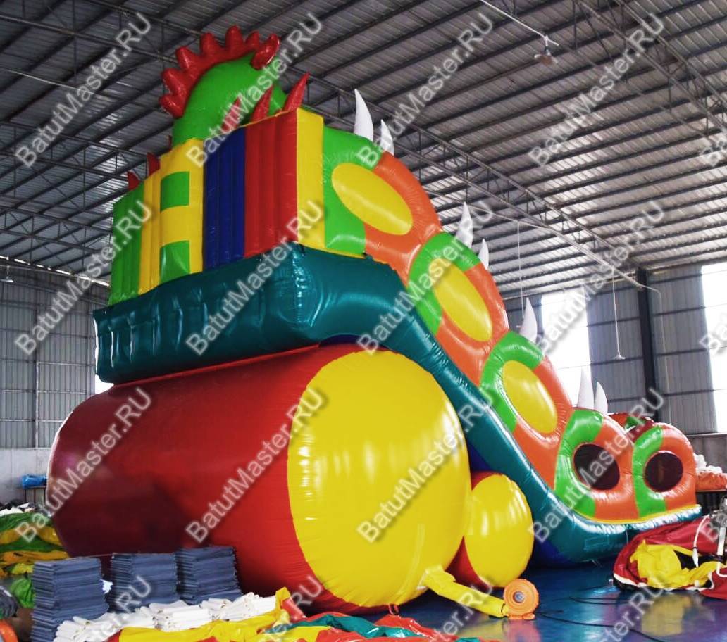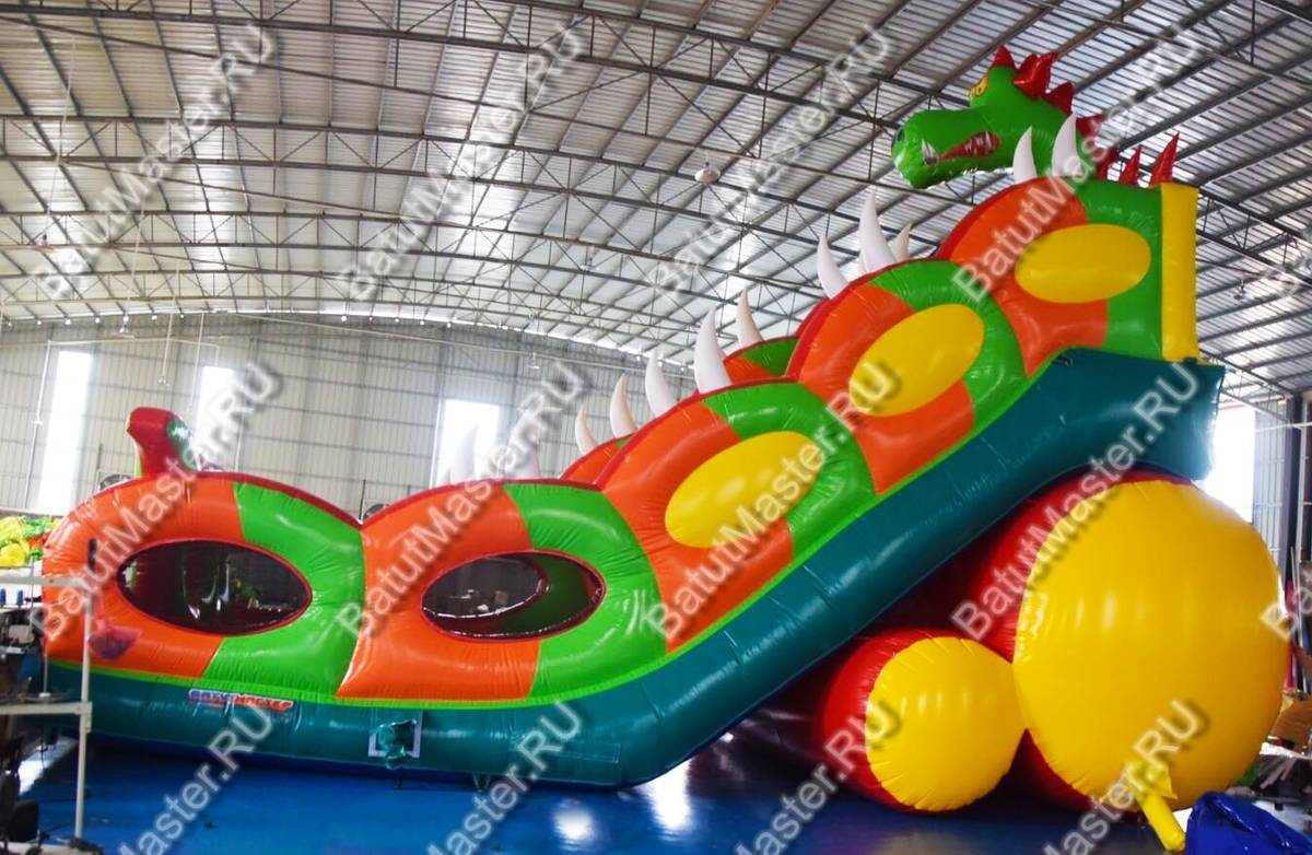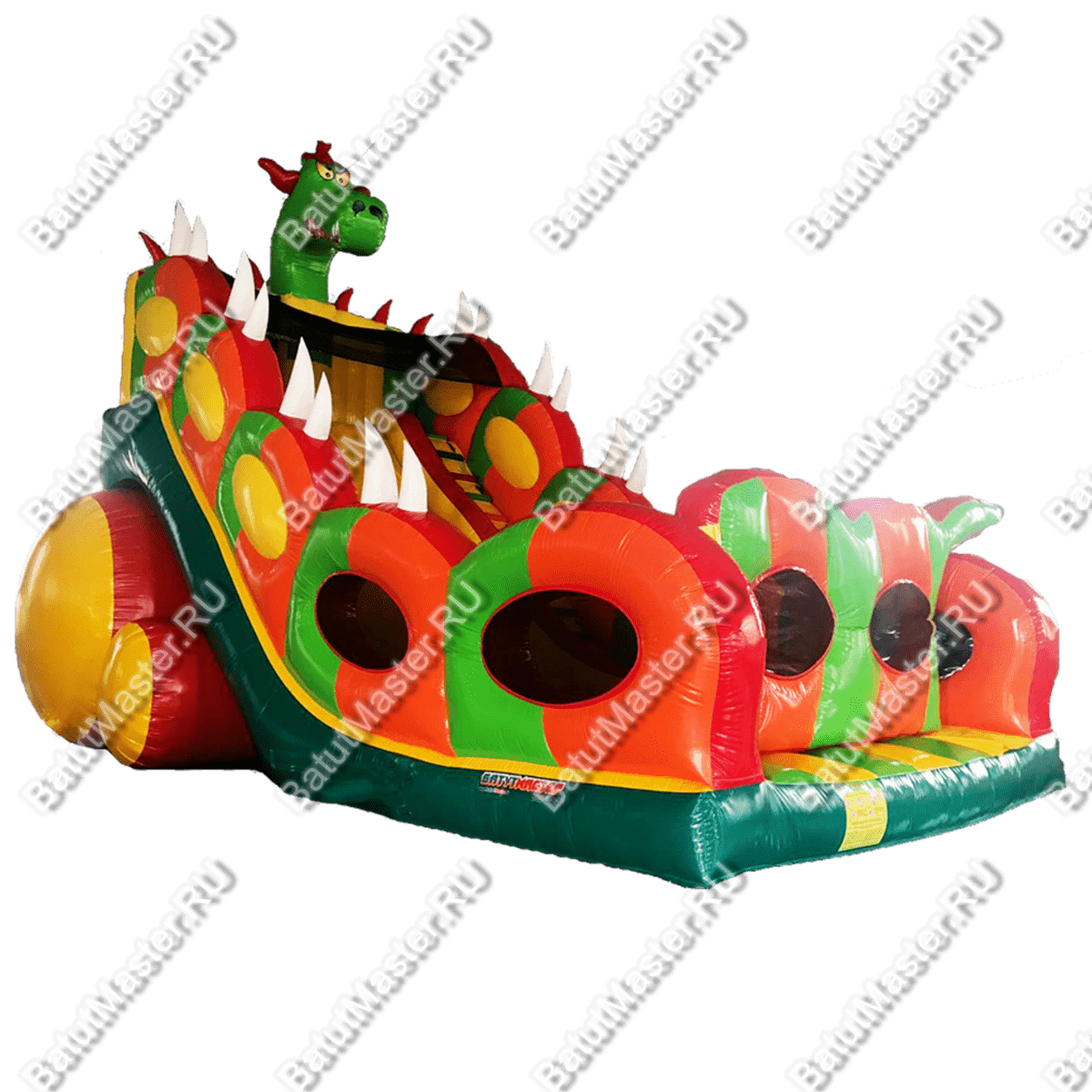 Надувной батут - горка батут представляет собой большую арену для самых веселых игр и прыжков. Вначале комплекса имеется зона для прыжков, где юным непоседам обязательно захочется попрыгать. Прямо по курсу имеется огромный подъем и спуск, сверху которого размещается голова дракона. По бокам высокие борта украшают шипы, что создает полную имитацию этого сказочного животного. Большая горка рассчитана сразу на несколько детей, ведь веселиться всем вместе намного интереснее. Забраться на горку следует по специальным порожкам в виде мягких модулей. Долгий спуск с высокой горки непременно оценят дети. Надувной батут рассчитан для бизнеса. Станет прекрасным дополнением игровой зоны для детей в торгово-развлекательном центре или на открытой детской площадке. Простой и яркий, имеет локации для физического развития детей, а именно выносливости, координации движения и силы. Коммерческий батут выполнен из прочного ламинированного материала, который не боится солнечных лучей и низкой температуры. Простой и неприхотливый в уходе. Имеет высокий уровень безопасности, кроме того, не имеет жестких элементов. По бокам имеются высокие борта, что предотвращает выпадение детей наружу.