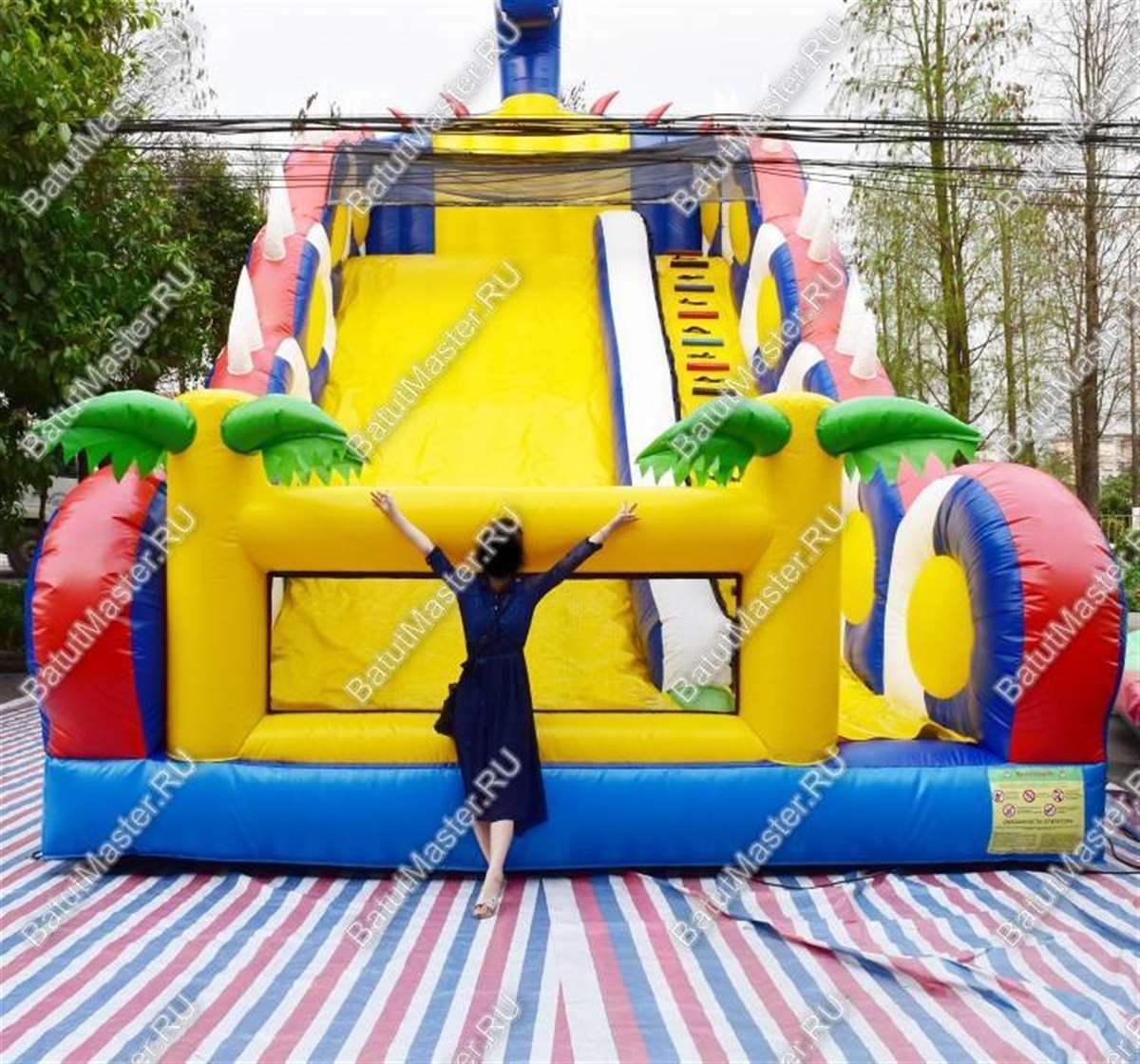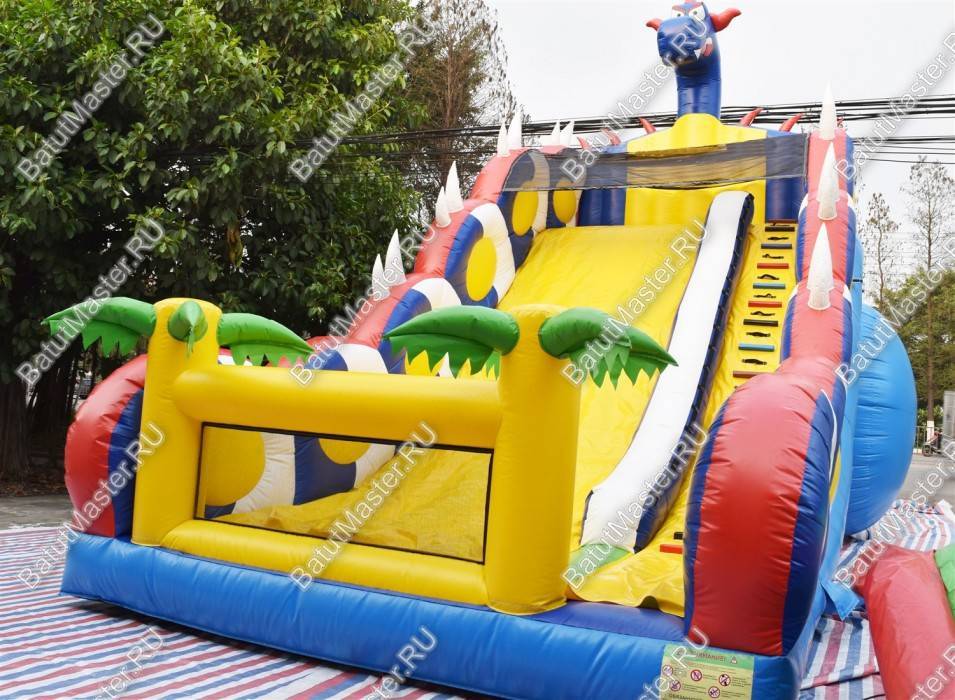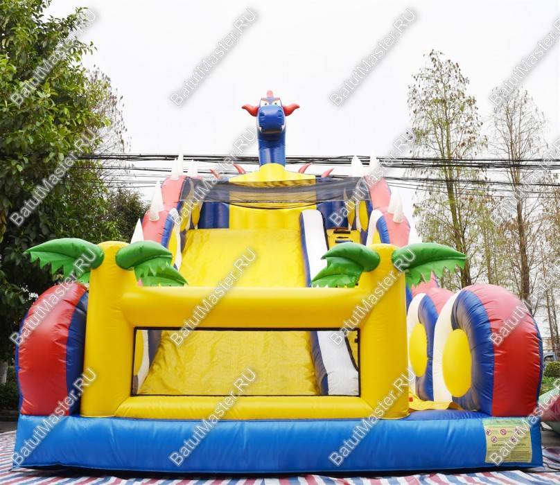 Дизайн надувного батута для бизнеса выполнен необычно и делает его особо эффектным. Такие сложные элементы как имитация огня дракона полностью мягкое, а сверху есть белые громадные шипы. Стоит отметить, что при спуске дети не выпадут наружу, а столкнуться с воздушной стенкой, в которой закреплена сетка. Это еще служит окном, чтобы они могли видеть родителей.
