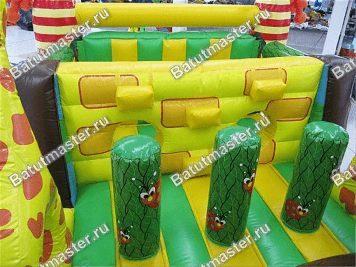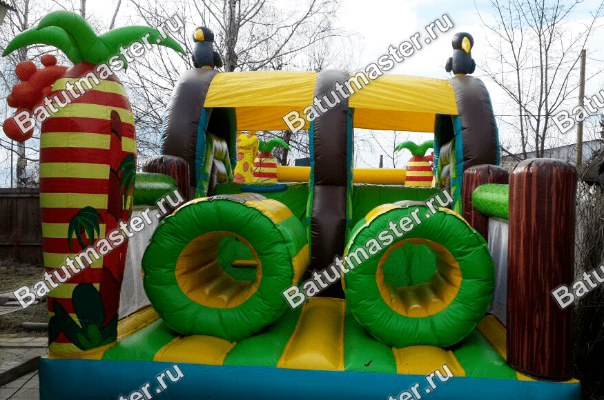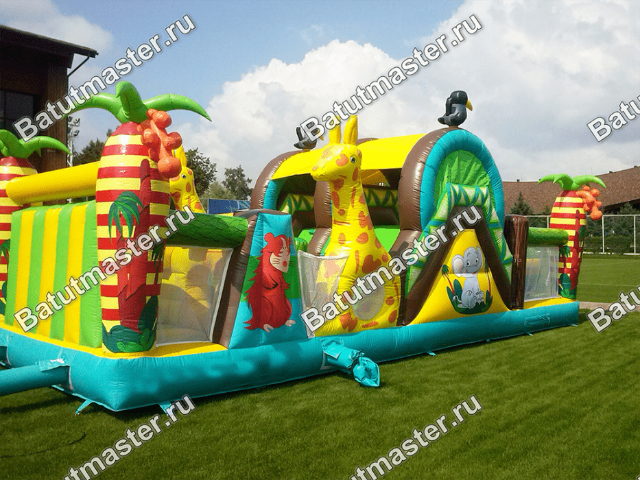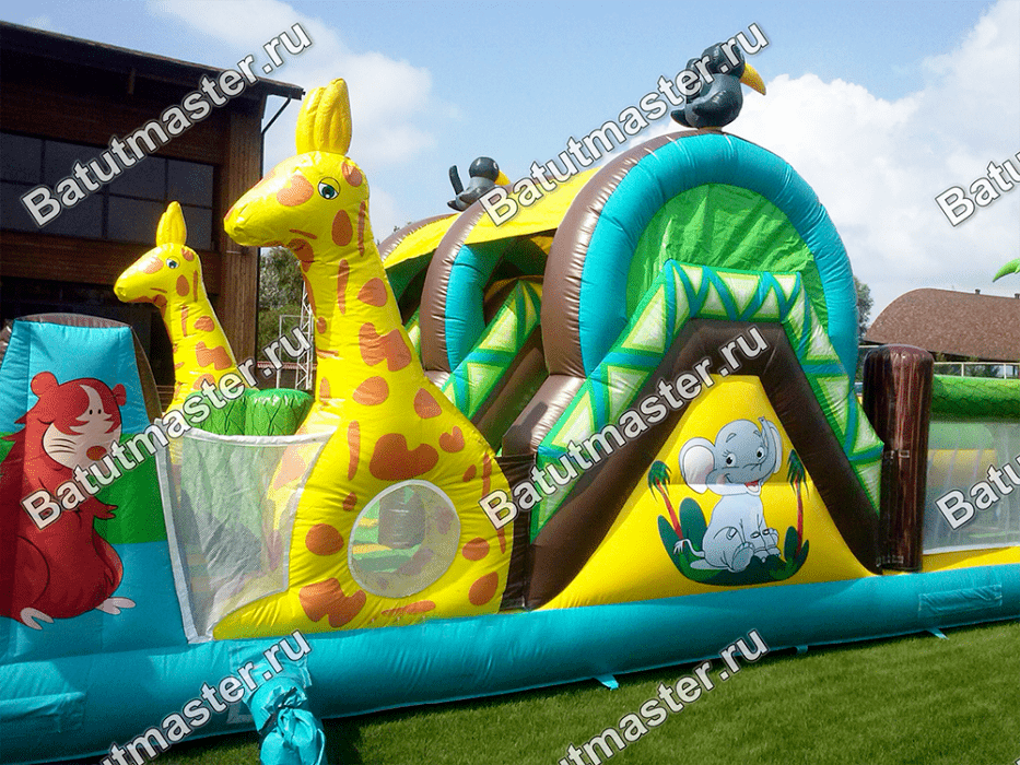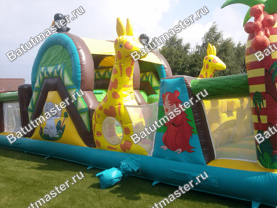 Надувной батут «На прогулке с жирафами» представляет собой необычный комплекс, сочетающий в себе модули не только для развлечений, но и для развития физических данных у детей. Юным непоседам сначала нужно будет проползти по надувным длинным тоннелям и забраться на небольшую горку съехав с которой впереди их ждет стена с большими надувными ступенями. Преодолев одну стену, следом стоит вторая, и третья, с небольшими отверстиями через которые также нужно протиснуться. Комплекс отличается еще тем, что он двухсторонний, в обратном направлении детям удобно будет вернуться в начало батута, преодолев те же модули. Повсюду веселые жирафы, пальмы, птицы и многое другое, все то, что создает атмосферу тропических джунглей, где обитают жирафы.