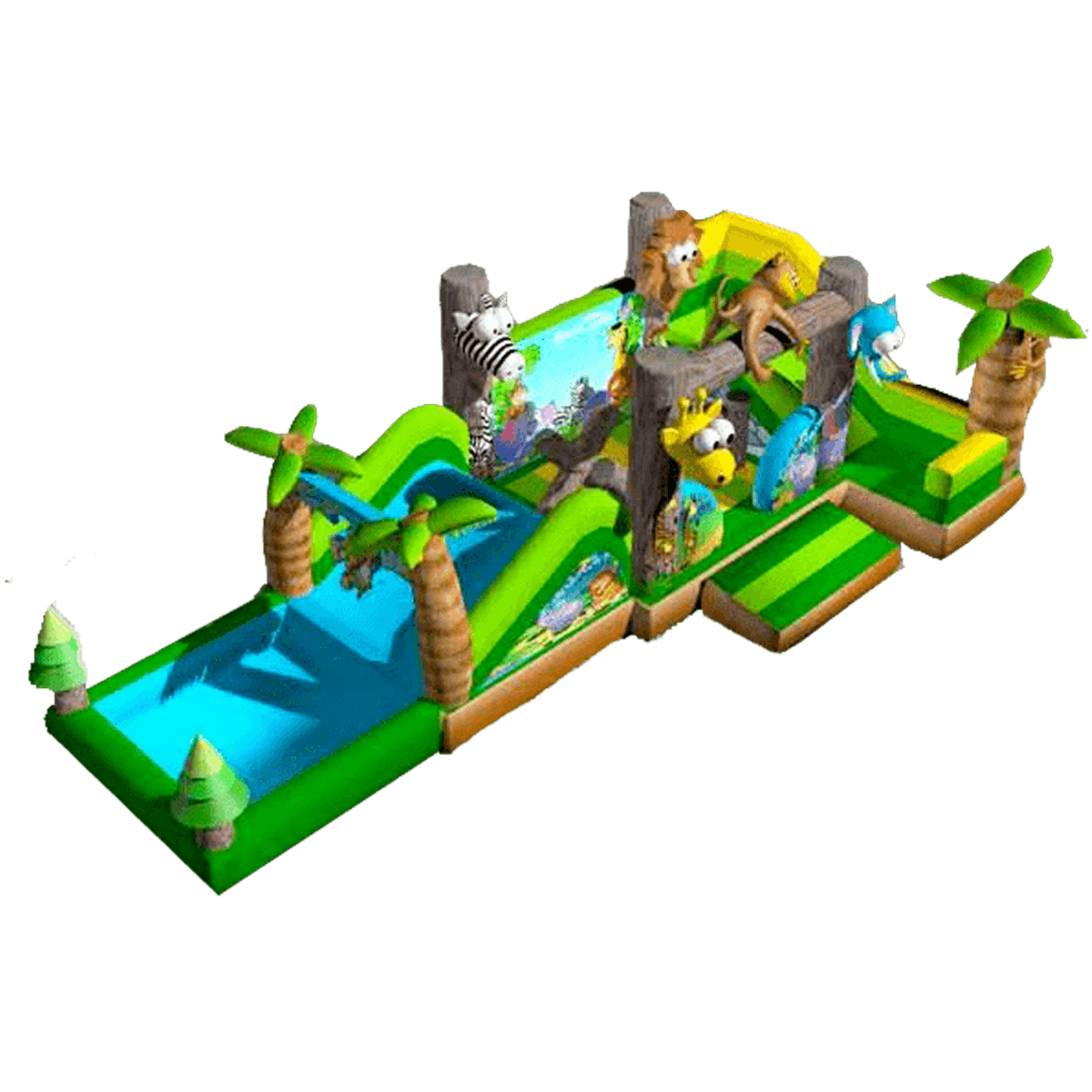 Мальчишкам и девчонкам будет интересно погрузиться в зоомир и сказочно провести время. Такой надувной батут отличается не только великолепным внешним видом, но и еще функциональностью. Для безопасности детей по всему периметру комплекса предусмотрены высокие борта и даже в зоне спуска в бассейн горка также закрыта.