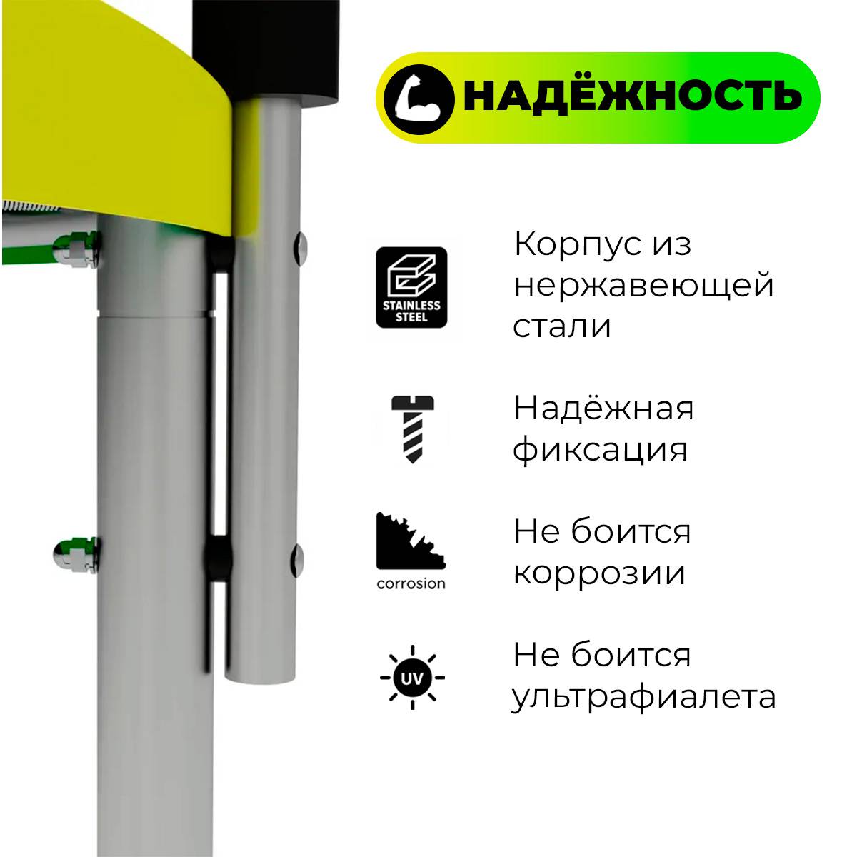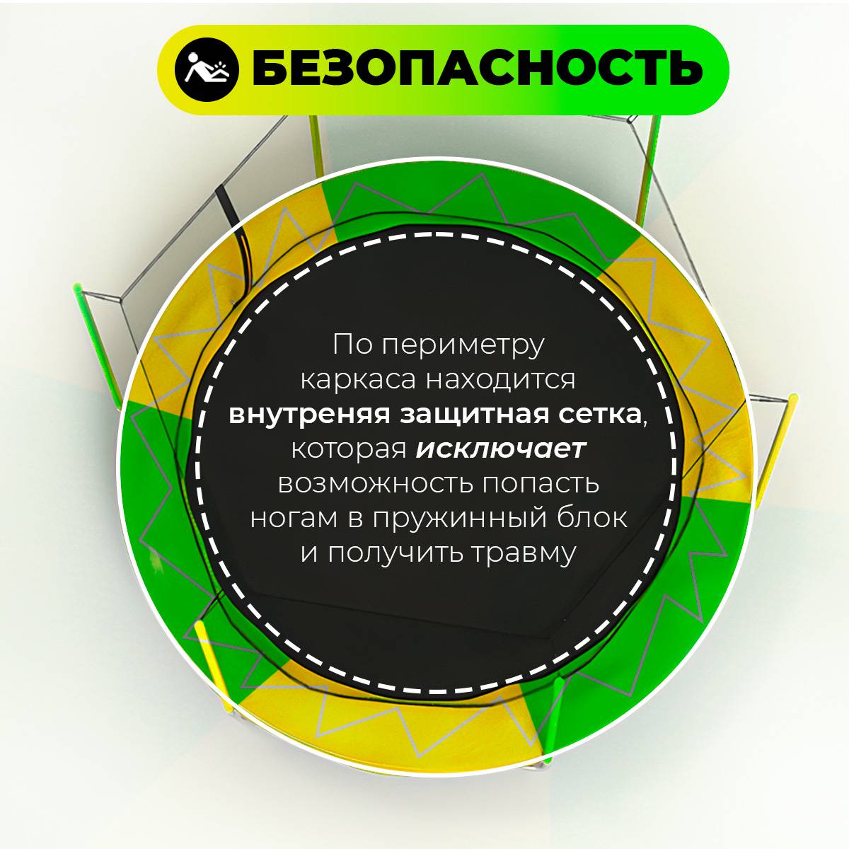 Данная модель выделяется ярким дизайном. При производстве был использован разноцветный ПВХ-материал, что сделало батут насыщенно желто-зеленым. Защитные стойки и кант, закрывающий пружины, изготовлены из того же материала.