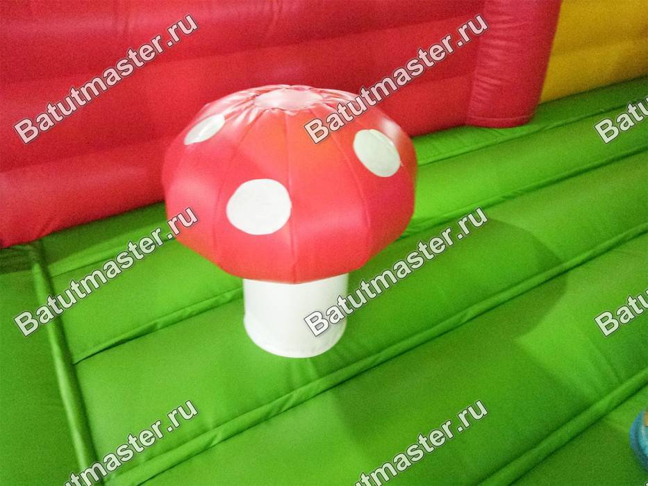 Скалодром, небольшая горка для малышей, арки, яркие столбы размещаются внутри нижней платформы и создают атмосферу целого развлекательного комплекса. Несмотря на габариты батута, аттракцион просто в сборке-разборке, так как верхняя часть (тент) легко отделяется от основной конструкции.