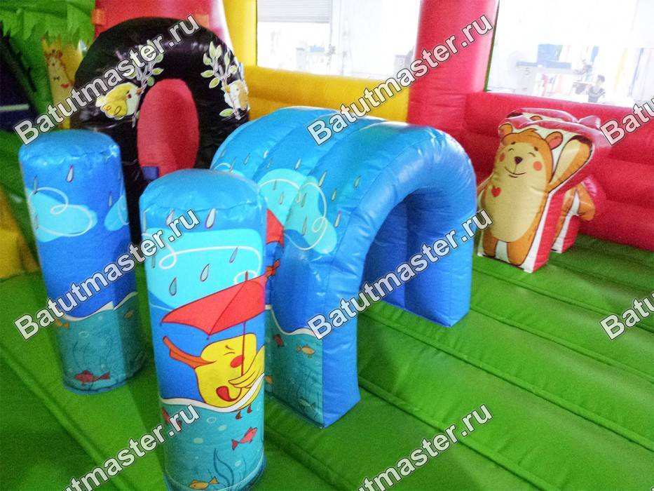 Представленный батут – уникальная коммерческая конструкция, которая независимо от наличия верхнего тента (крыши) остается полностью светлой внутри. Нижняя основная подушка и тент изготовлены из зеленого ПВХ, но соединяют эти 2 части разноцветные высокие арки, одновременно придающие нужную форму аттракциону. Средняя часть стен – полупрозрачный ПВХ, позволяющий пропускать сквозь себя солнечные лучи. Результатом такой конструкции стала абсолютно защищенная со всех сторон мягкая площадка, которой не страшны ни дождь, ни ветер.