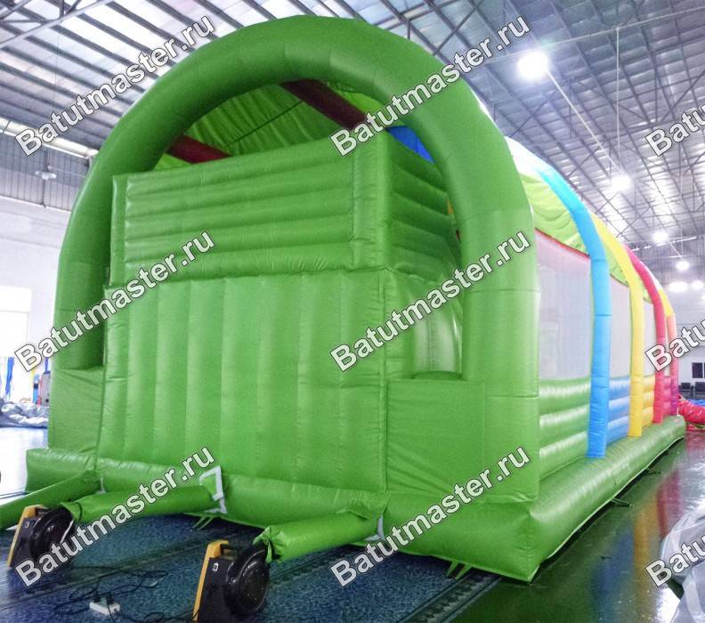Начинается батут для бизнеса с двух арок на фасадной стороне аттракциона: первая обозначает вход на площадку, а вторая – помогает поддерживать верхнюю конструкцию крыши. Внутри детей ожидают интересные игровые формы, модули, а на самой задней стенке – высокая горка из зеленого ПВХ с просторной стартовой площадкой и двумя лестницами (широкий спуск проходит по центру).