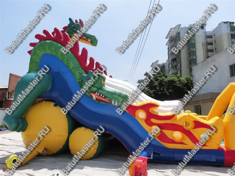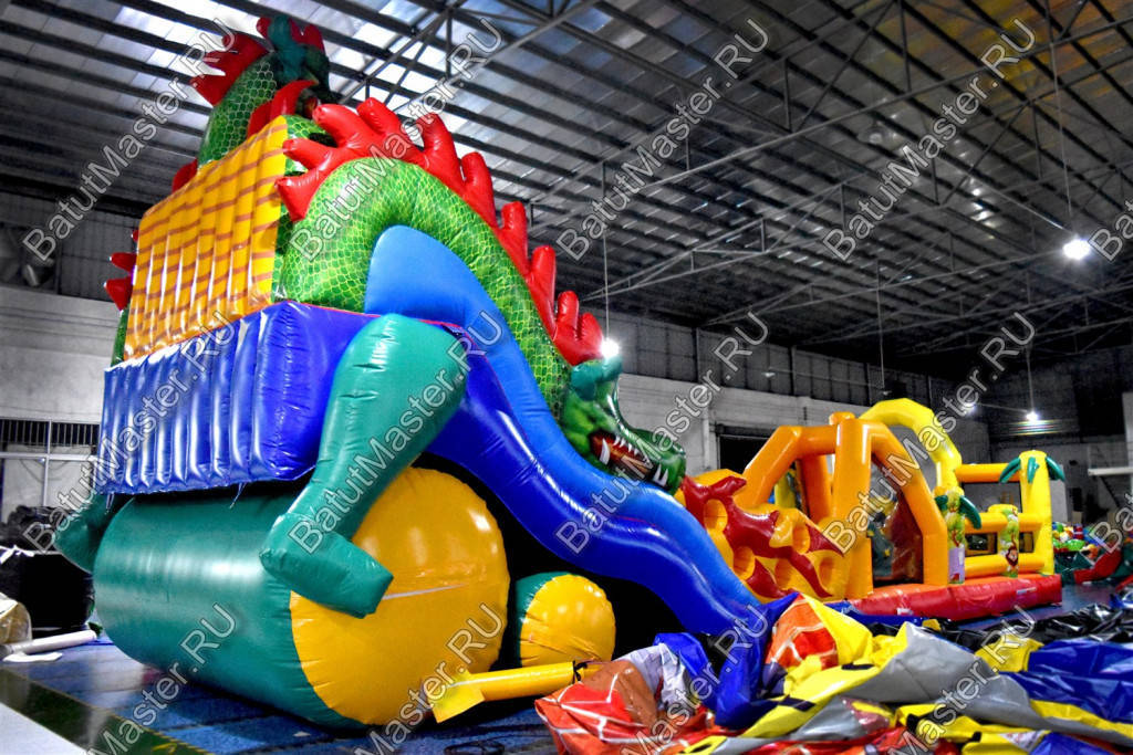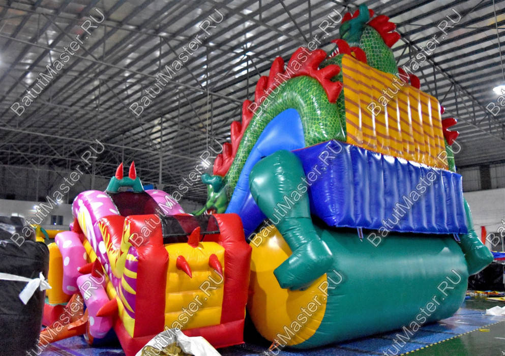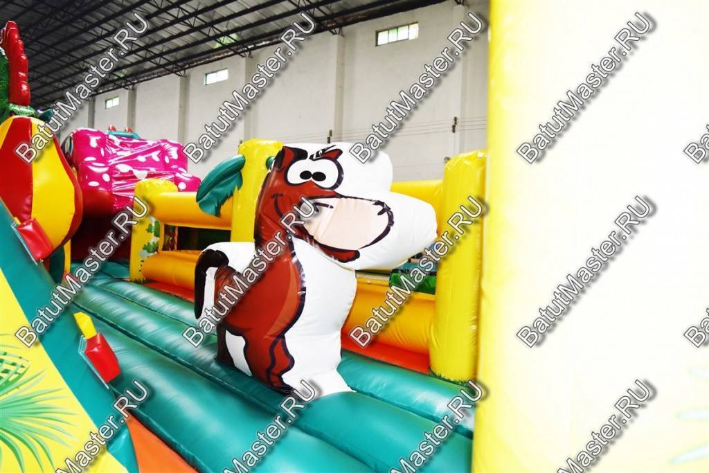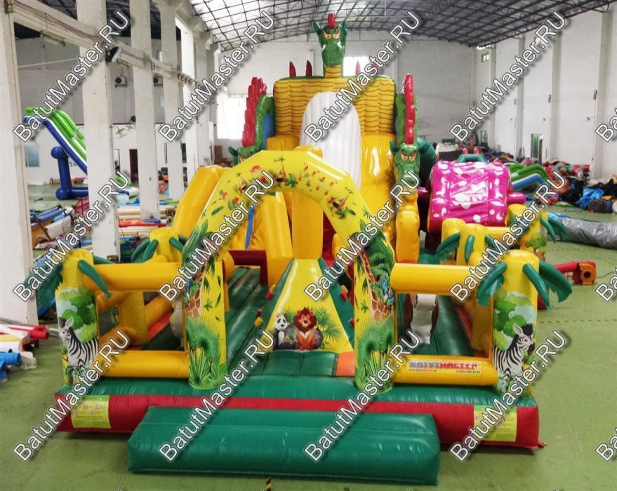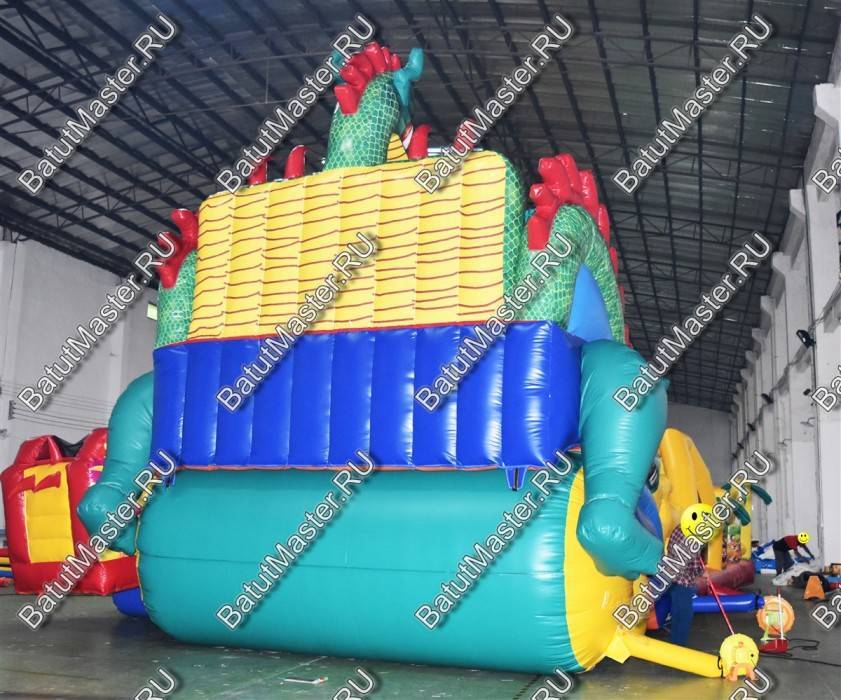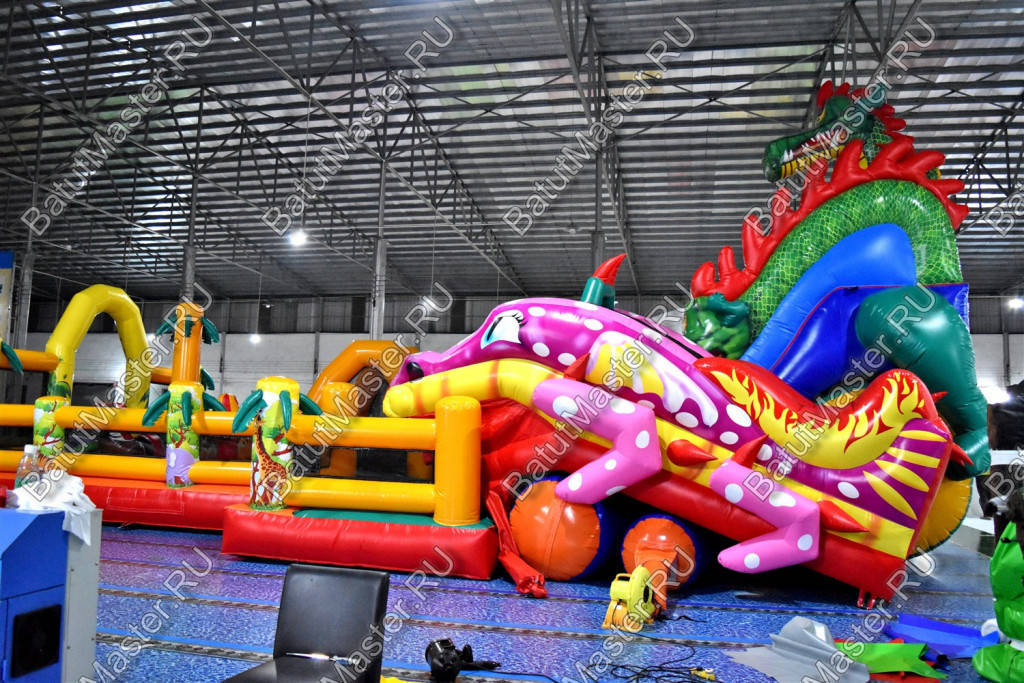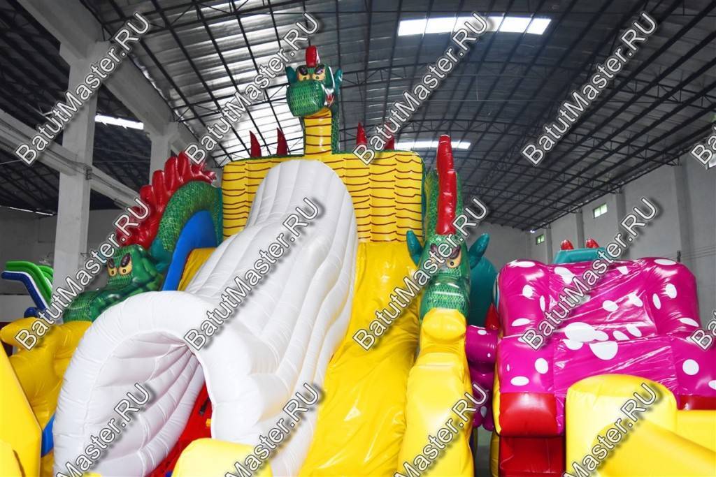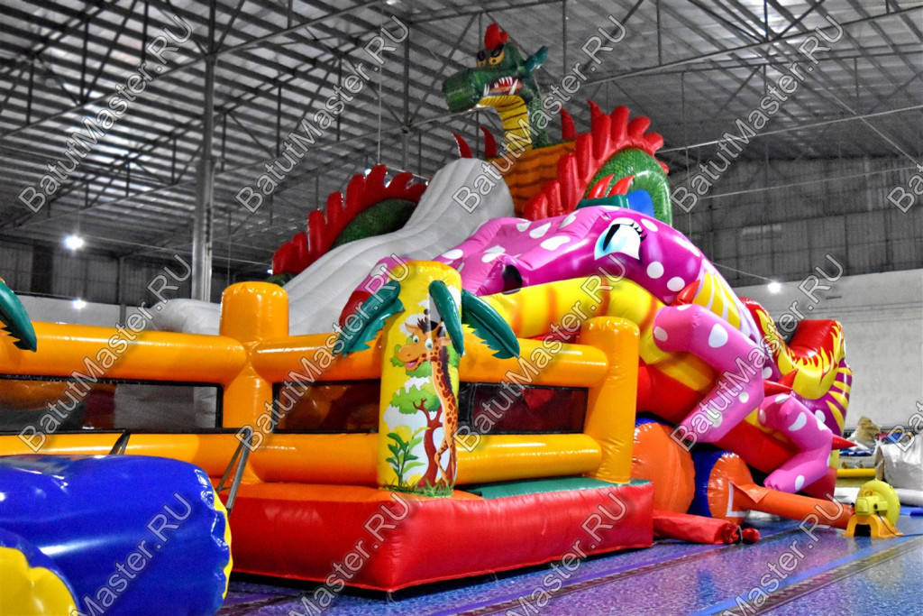 Детям любого возраста трудно представить другое животное, даже вымышленное, чем наш известный трехглавый Змей Горыныч. Именно он стал главным украшением яркого батута, но разместился у самой задней стенки. Средняя голова расположилась на самой верхушке, а правая и левая уложились вдоль боковых сторон. Еще один забавный элемент коммерческого батута – розовая пятнистая жаба с робот-пастью. Это самый свежий элемент из надувных разработок, позволяющий всему аттракциону быть в несколько раз прибыльнее обычного.