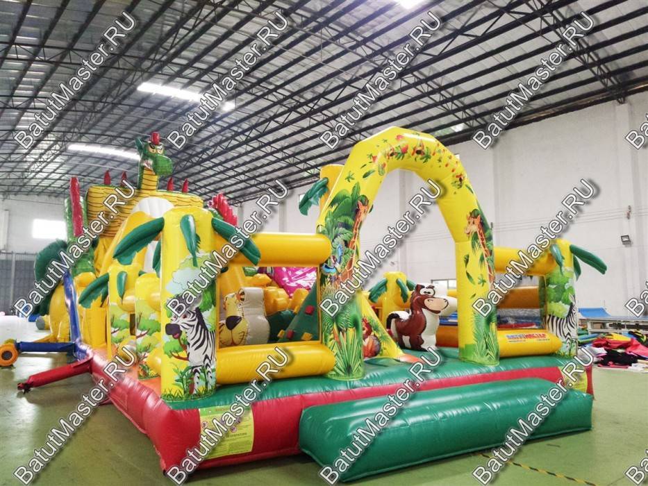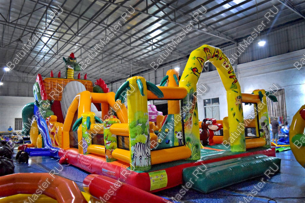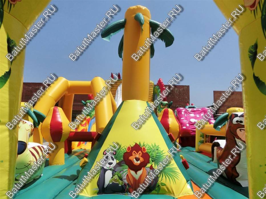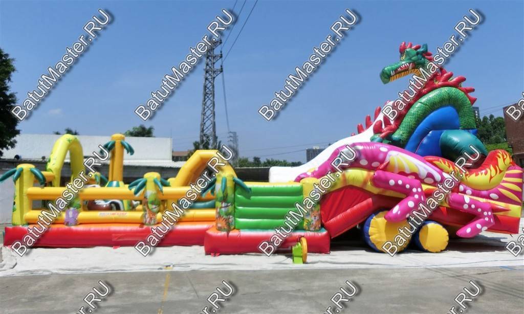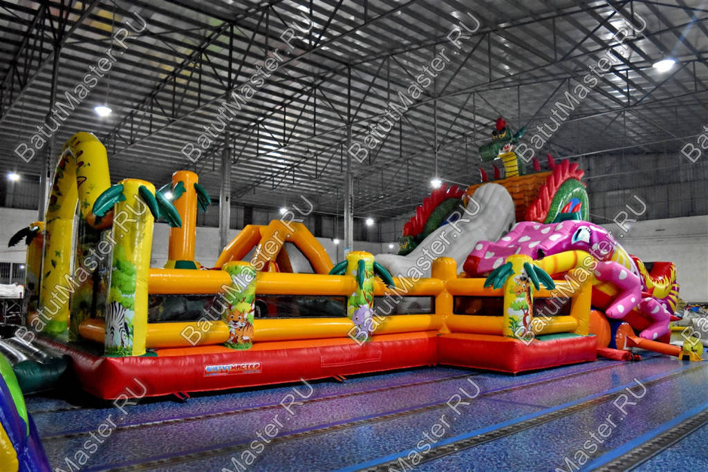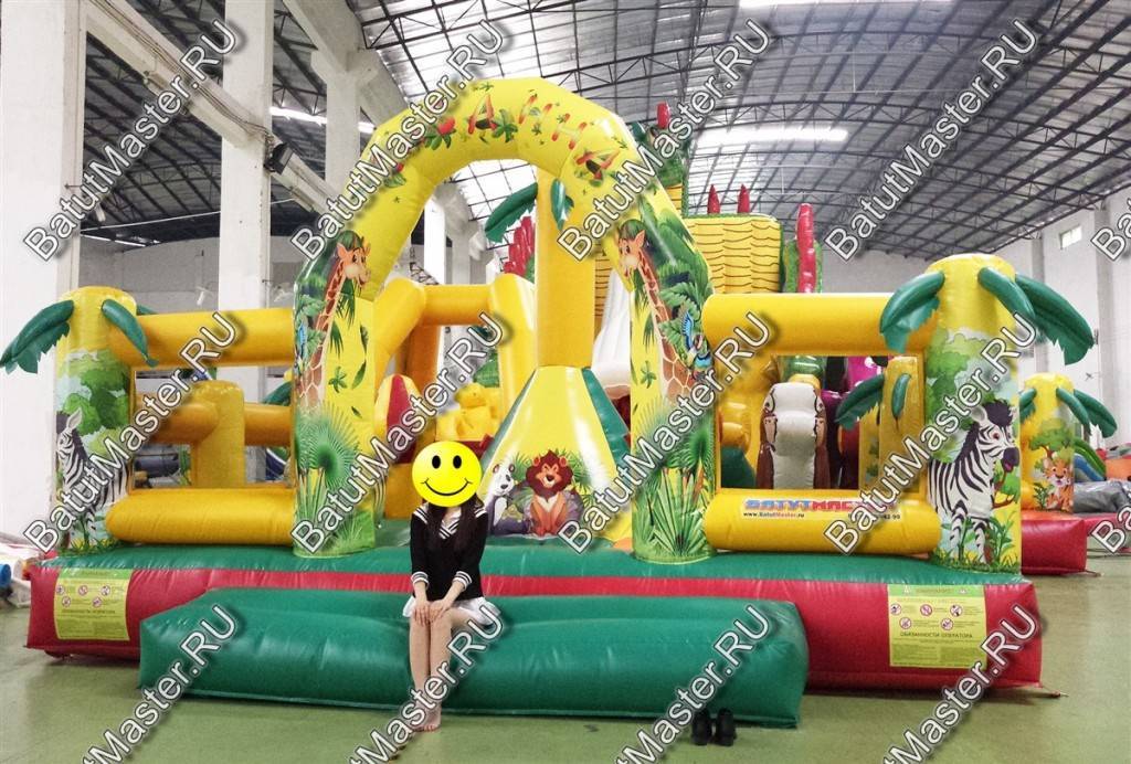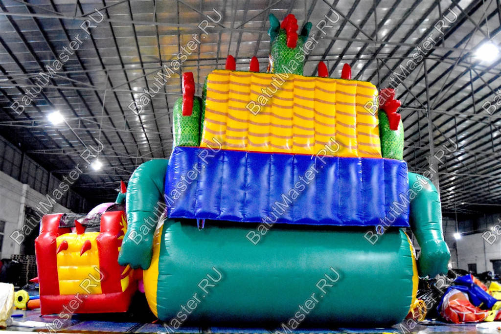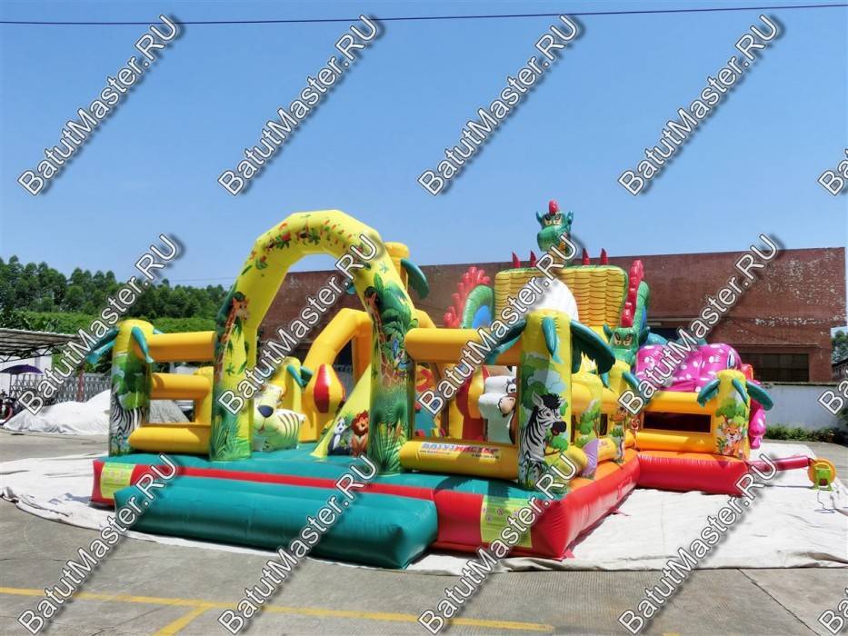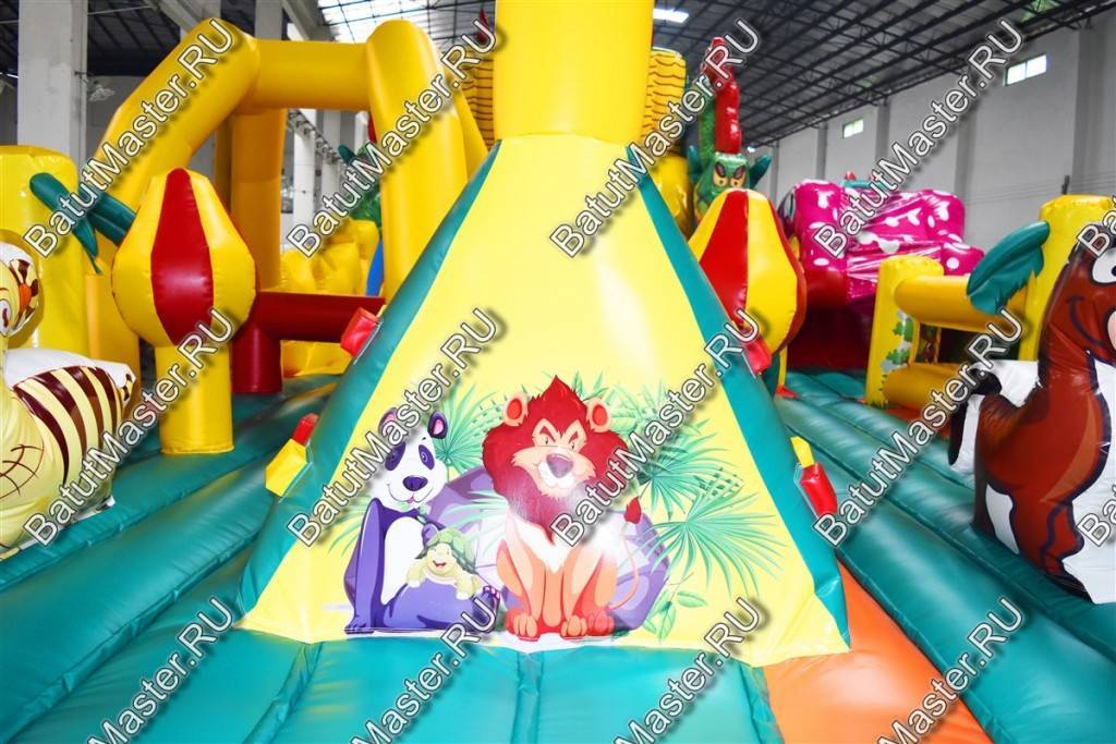 Детям любого возраста трудно представить другое животное, даже вымышленное, чем наш известный трехглавый Змей Горыныч. Именно он стал главным украшением яркого батута, но разместился у самой задней стенки. Средняя голова расположилась на самой верхушке, а правая и левая уложились вдоль боковых сторон. Еще один забавный элемент коммерческого батута – розовая пятнистая жаба с робот-пастью. Это самый свежий элемент из надувных разработок, позволяющий всему аттракциону быть в несколько раз прибыльнее обычного.