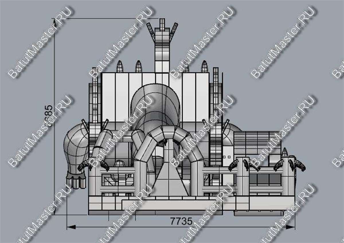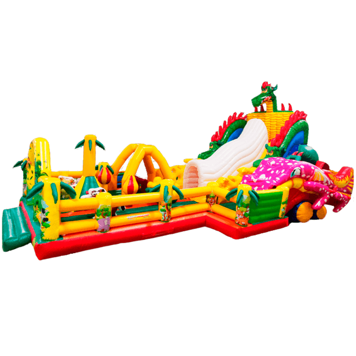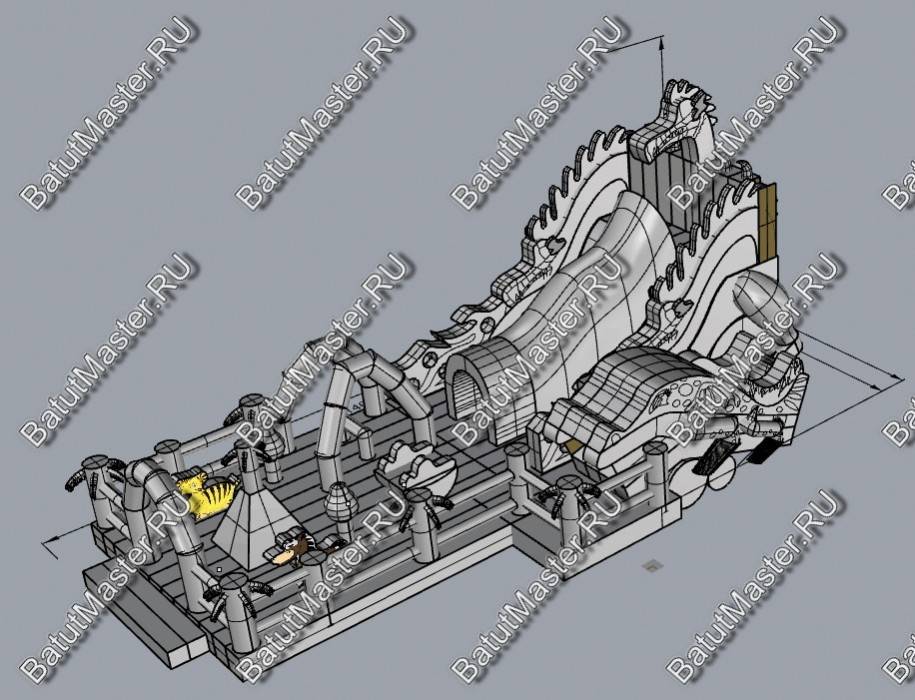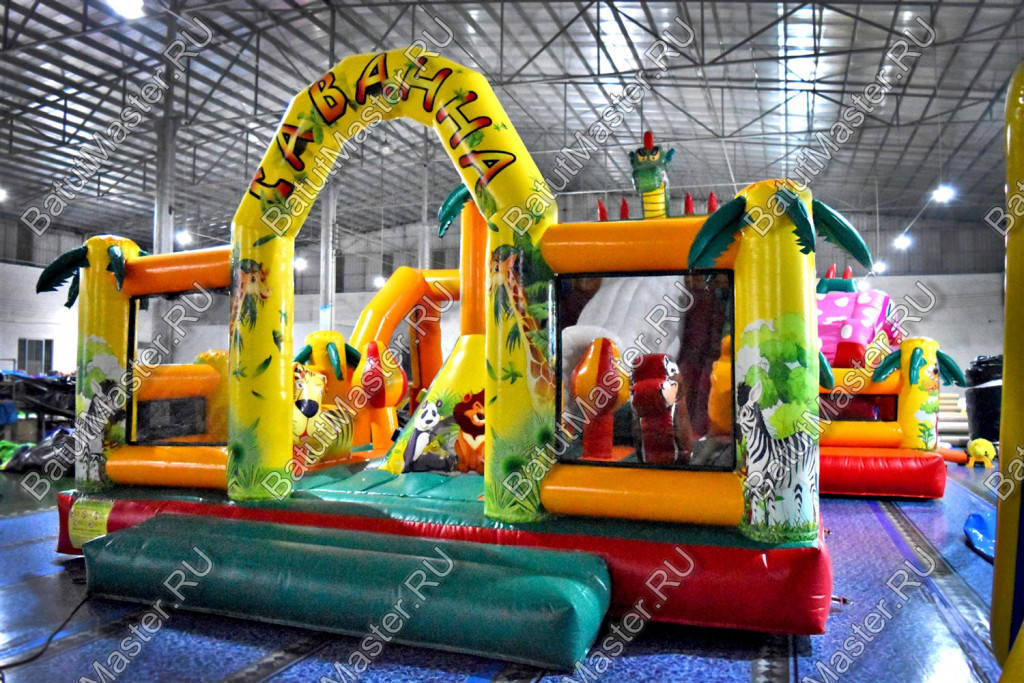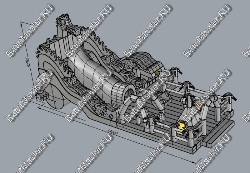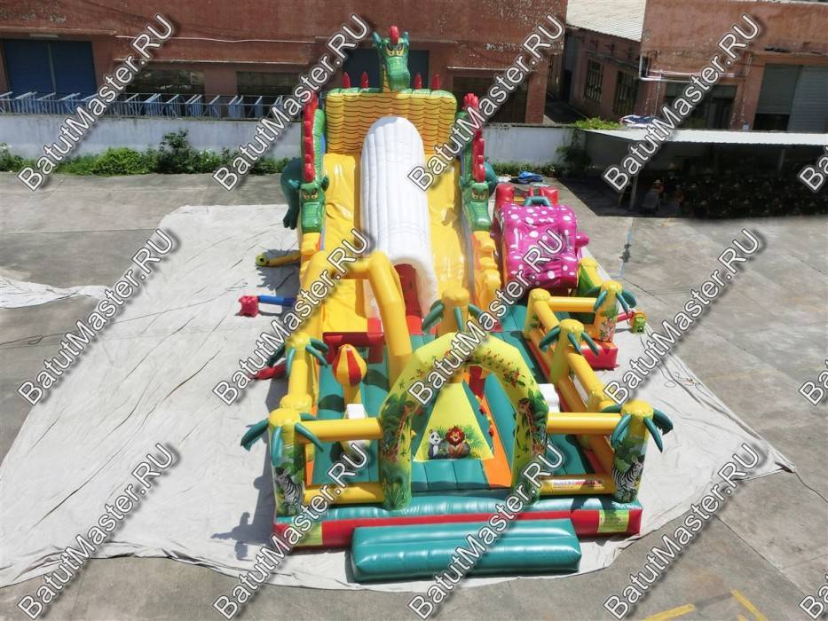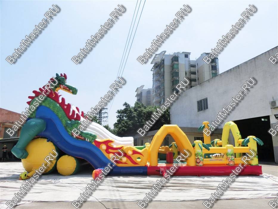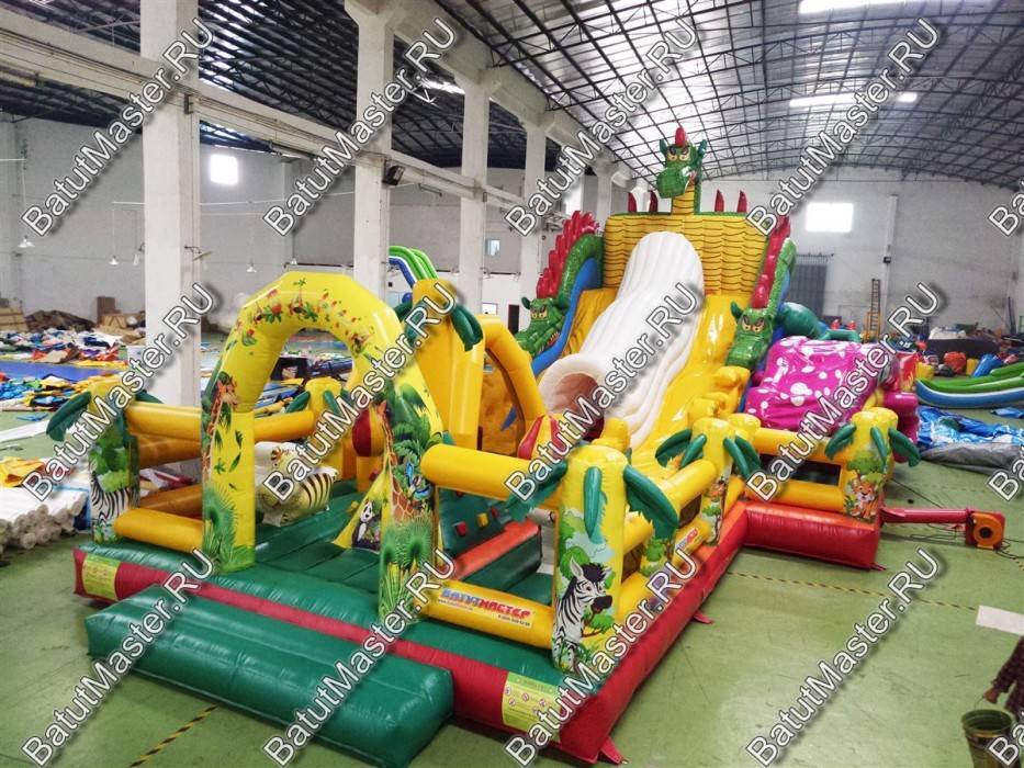 Детям любого возраста трудно представить другое животное, даже вымышленное, чем наш известный трехглавый Змей Горыныч. Именно он стал главным украшением яркого батута, но разместился у самой задней стенки. Средняя голова расположилась на самой верхушке, а правая и левая уложились вдоль боковых сторон. Еще один забавный элемент коммерческого батута – розовая пятнистая жаба с робот-пастью. Это самый свежий элемент из надувных разработок, позволяющий всему аттракциону быть в несколько раз прибыльнее обычного.