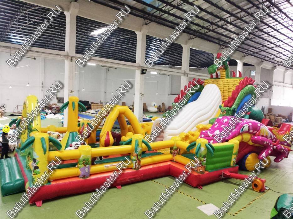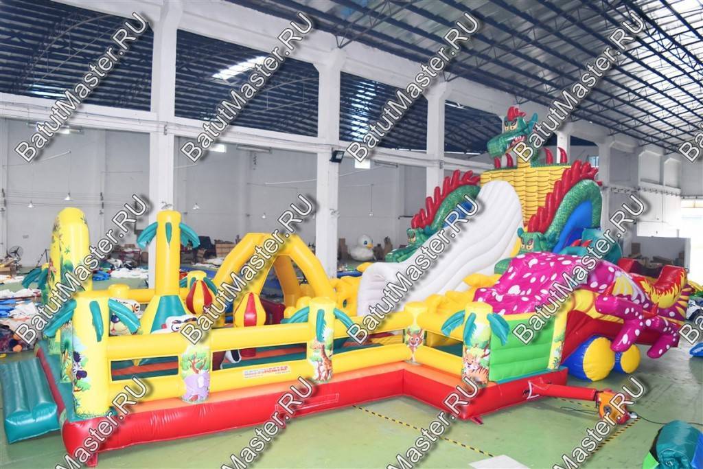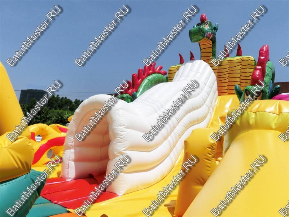 Взобраться к Змею Горынычу и его высокой горке можно, если подняться по белому закрытому тоннелю, напоминающему тело чудовища. Нижняя площадка, расположенная сразу после входа, такая же увлекательная и интересная. Она переполнена надувными игровыми элементами из желтого ПВХ, в которых можно рассмотреть пальмы, лапы дракона и просто башни. Полупрозрачное ограждение из двух желтых мягких стволов дает возможность ребенку держаться во время прыжков, а родителям – контролировать детей.