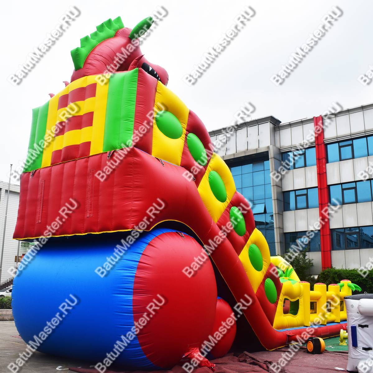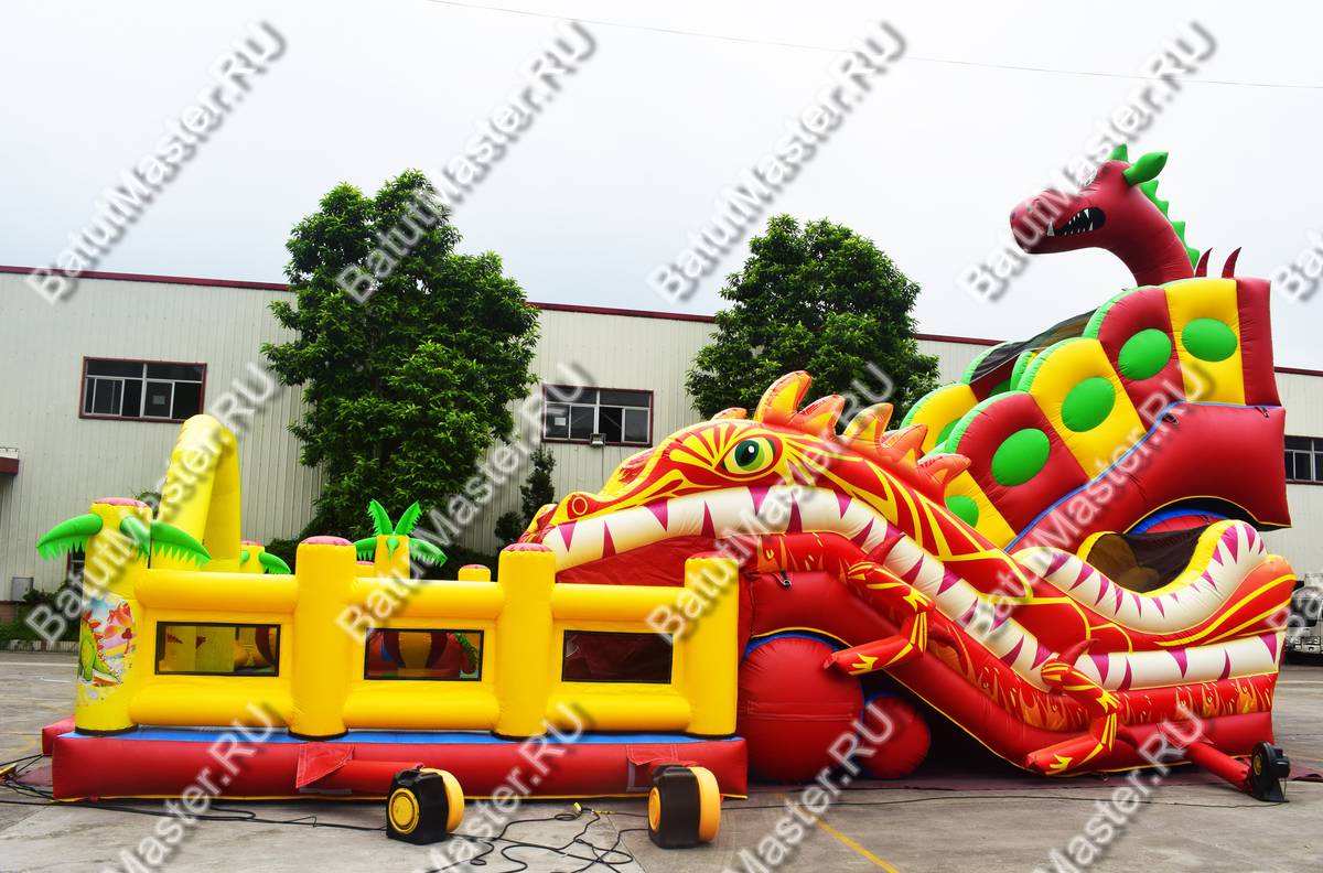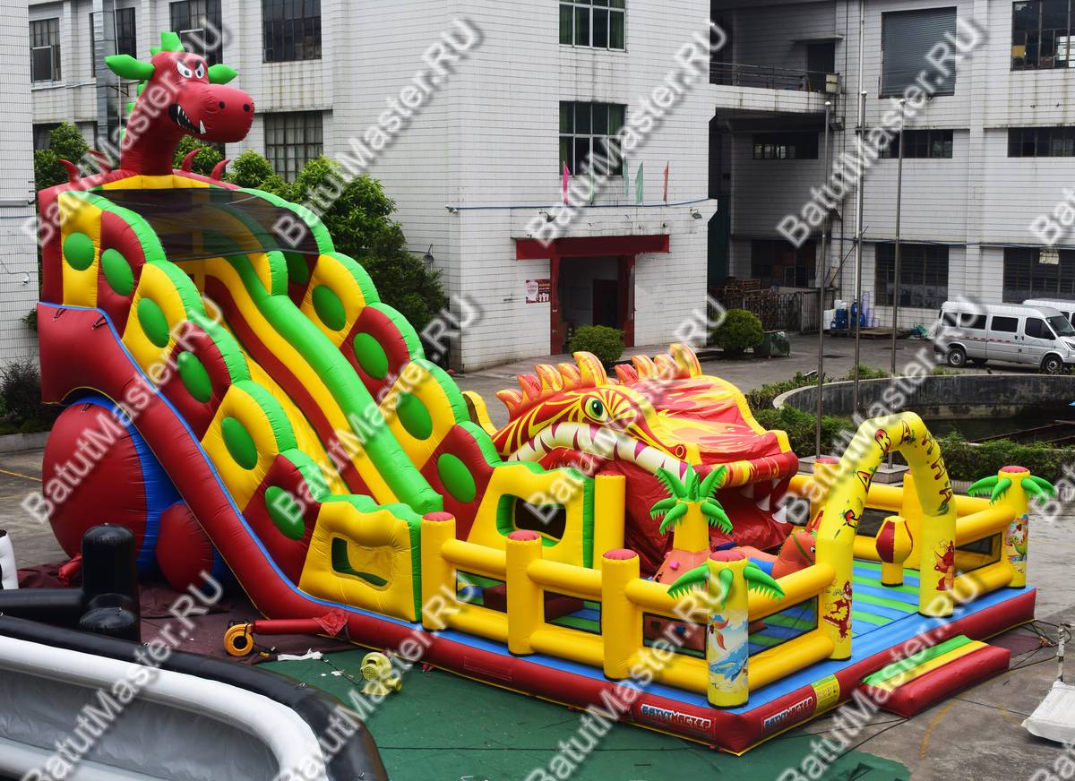 Животные саванны с нетерпением ждут юных первооткрывателей на арене веселых приключений. Здесь дети получат массу положительных эмоций и незабываемых впечатлений. Большой надувной батут вместил в себе все самые интересные и современные модули. Главным атрибутом комплекса является большой дракон, в пасть которого можно забраться и спуститься вниз. Здесь есть скалодром, горка, а на горке возвышается забавный маленький дракоша. Вместительное поле для прыжков по достоинству оценят мальчишки и девчонки. На нем можно весело кувыркаться, бегать и сколько угодно прыгать. Снаружи батут украшают надувные пальмы. Здесь все вокруг так интересно и хочется веселиться и искать приключения. Яркие детали и современное наполнение батута подарит радость. Коммерческий батут выполнен из особо прочного, ламинированного поливинилхлорида. Такой материал не боится солнечных лучей и минусовой температуры. Рассчитан на длительную эксплуатацию. Это отличный вариант для бизнеса. Предпринимателям можно установить его как в помещении, так и на открытом воздухе и начать зарабатывать без дополнительных вложений. Он украсит территорию развлекательного комплекса, парка, гостиницы.