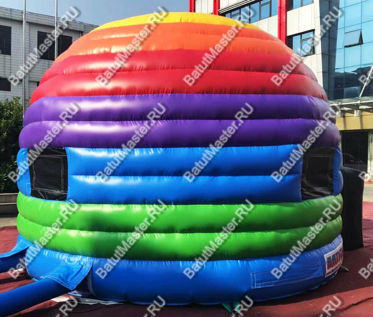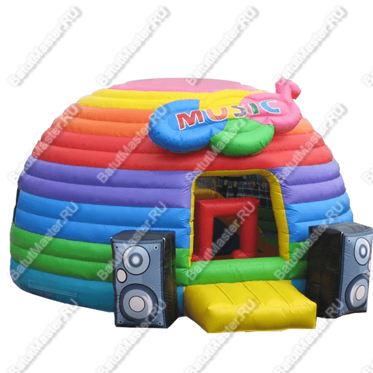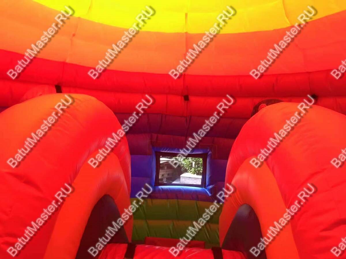 Несомненно, это красочный батут, шатер из радужных мягких полос, а у входа имеются даже 2 огромные колонки, еще раз подтверждающие, что впереди детвору ждет настоящее веселье. Внутри расположены препятствия, они сделают игры еще активнее и забавнее. Такой крытый батут можно расположить на любой поверхности, хоть под открытым небом и не бояться дождя или ветра.