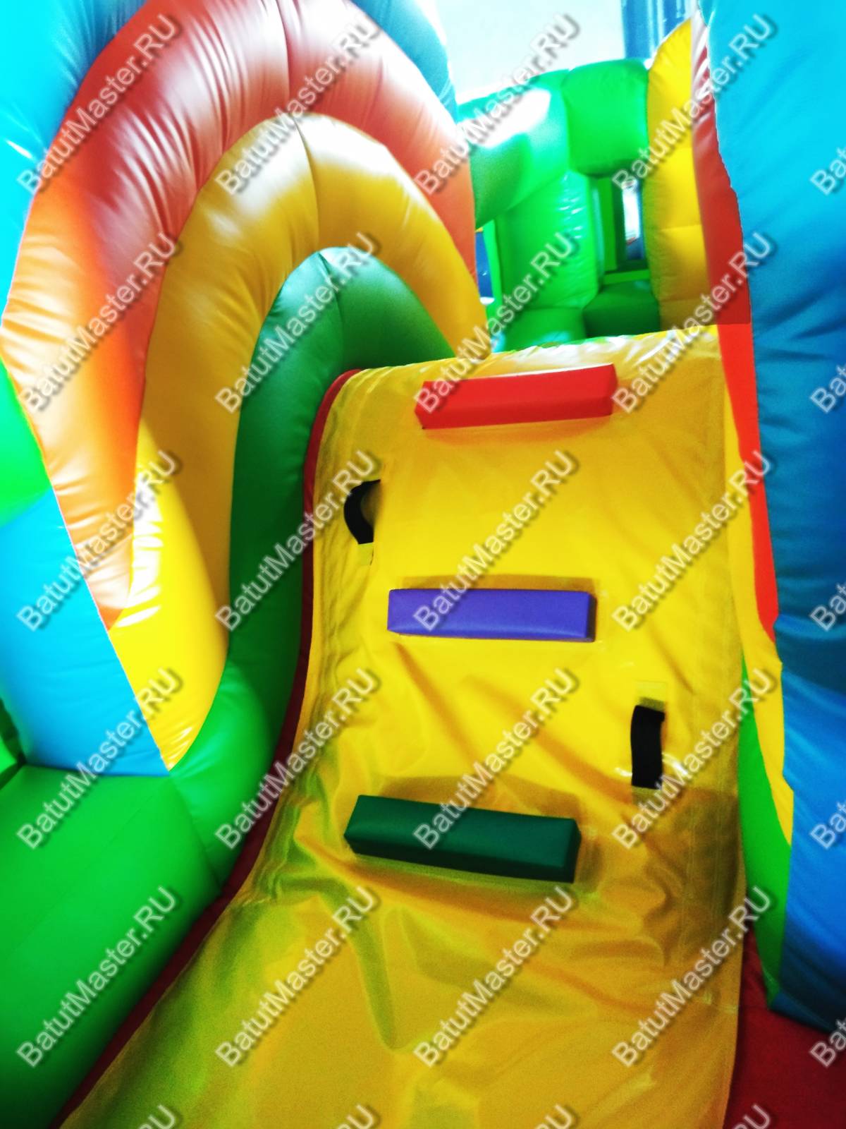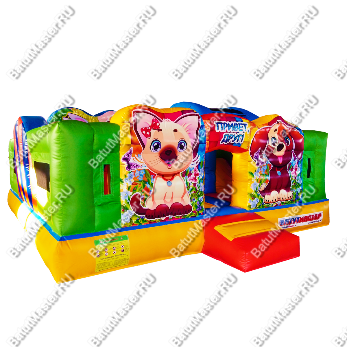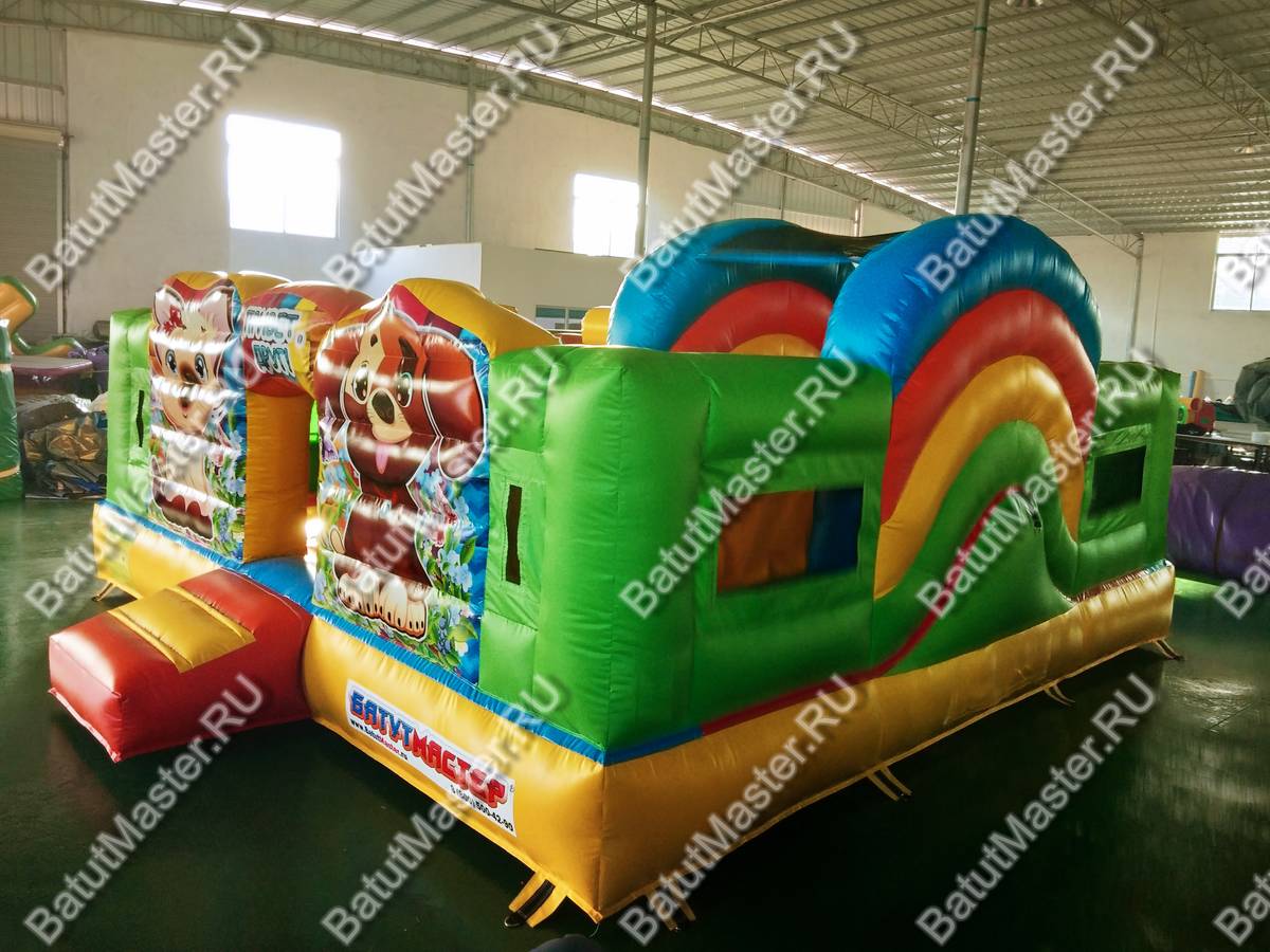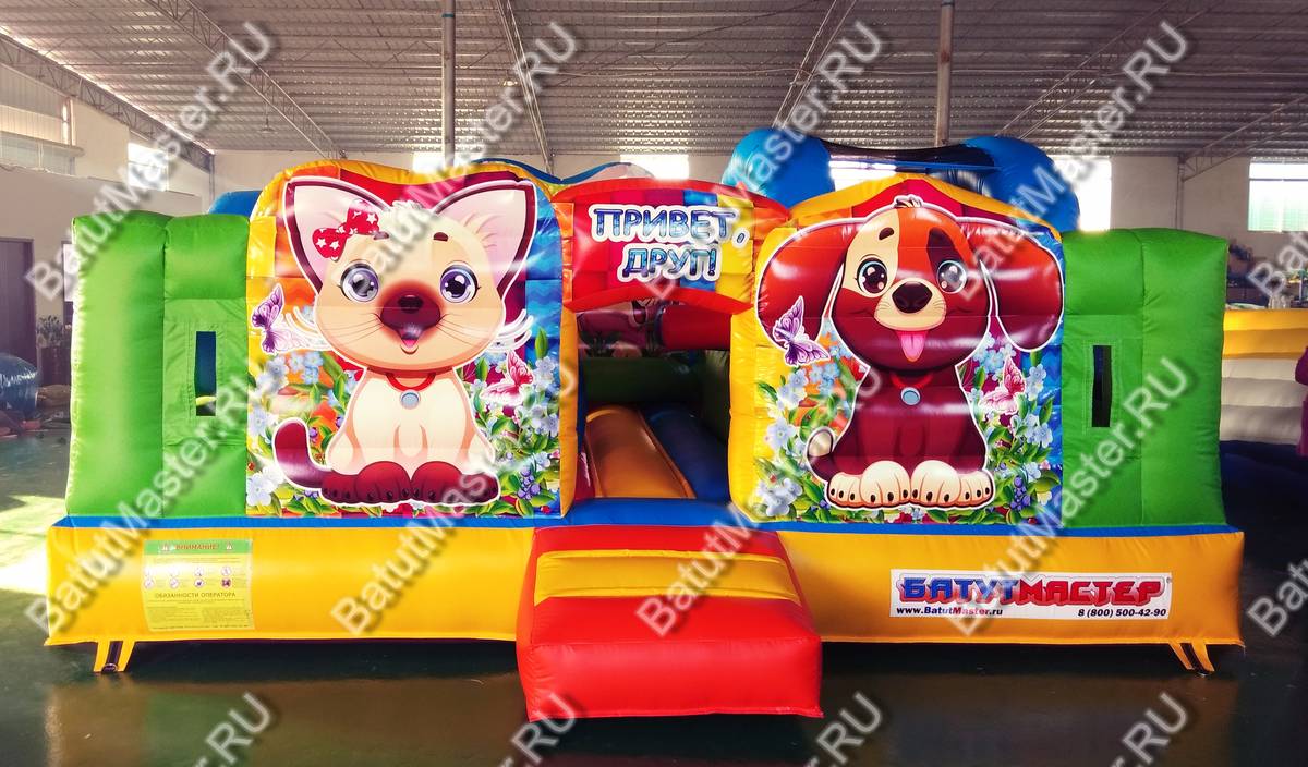 На входе ребят встречают котёнок и щенок, нарисованных рядом с аркой, на которой написано «Привет, друг!». Пройдя внутрь аттракциона, дети увидят множество надувных фигур, небольшие препятствия, через которые нужно будет проползти, зону для отдыха, а также маленькую горку. Горка небольшая, чтобы малышам быстро нестрашно с неё прокатиться.