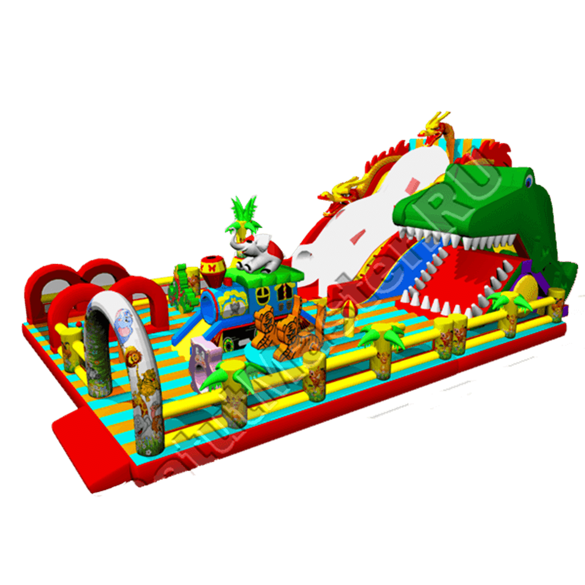 Надувной батут «Змей Горыныч новый» выполнен в размерах 17х10х9 м. По внешнему периметру аттракцион огражден рядом желтых надувных столбиков и пальм, которые внутри себя создают полностью просматриваемое пространство из сетки. Войти внутрь коммерческой площадки модно через арку, установленную справа. Уже внутри дети попадают в игровой круговорот, начинающийся с яркого паровозика, в который можно залезть, чтобы дальше спуститься из него по горке. Кроме этого на площадке установлены надувные игровые формы животных и зверей из ПВХ.