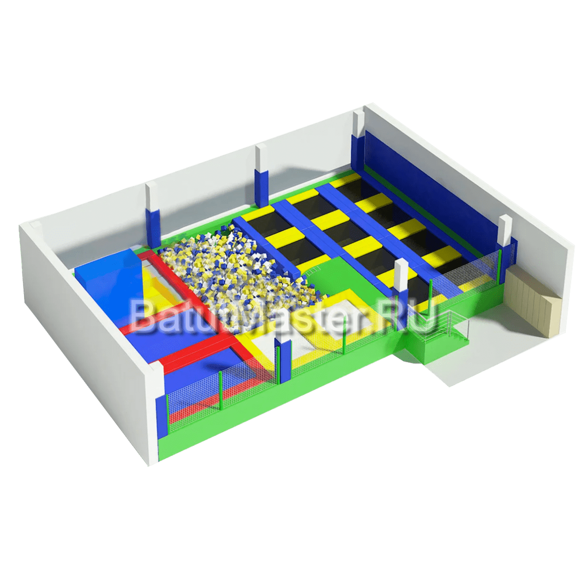 Здесь найдутся батутные дорожки, прыжковые зоны, зона для прыжков в поролоновую яму, а также специальные зоны с наклонными стенками. Всё это — для создания насыщенного и безопасного игрового опыта.