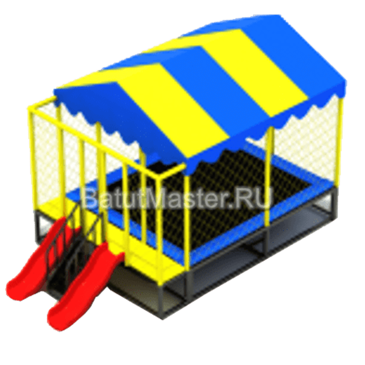 Батутную арену в этой комплектации можно считать многофункциональным аттракционом для бизнеса. В первую очередь это вместительное развлекательное пространство прямоугольной формы и со стартовой площадкой. Главным защитным элементом батутной арены является крыша из ПВХ. Она отлично справляется с отражением солнечных лучей, не дает влаге проникнуть внутри аттракциона, но может похвастаться своим небольшим весом и объемом в сложенном виде.