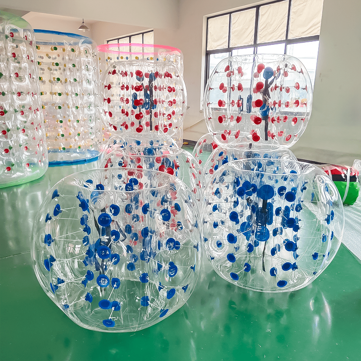 - 8 бамперболов (диаметр 1,2 м) – надувные шары, выполненные из прочного термополиуретанового материала (ТПУ). Эти шары гарантируют безопасность игроков, так как они не только мягкие, но и устойчивые к повреждениям.