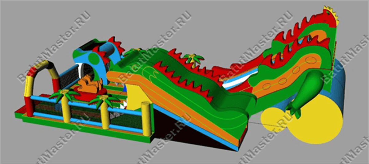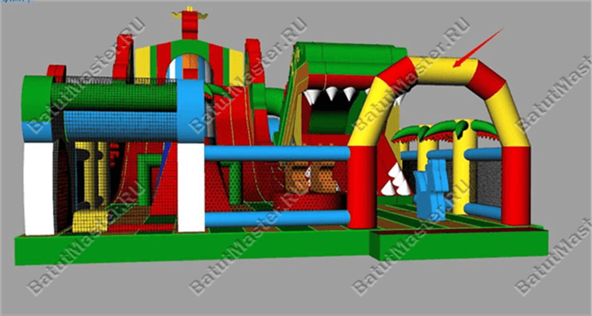 Вход внутрь справа, попав на прыгательную плоскость, впереди можно увидеть необычного надувного робота в виде головы страшного чудища. Свободное пространство занято симметрично расположенными спортивными деталями для прыгания, лазания и кувырков, посередине установлена своеобразная качалка.