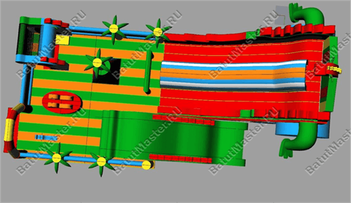 Основным украшением данного батута считается высокая горка, она выполнена в виде спусковой полосы, закрытой сверху туннелем, и двух лестничных полос по обеим сторонам от спуска. Перед основанием горки расположены игровые элементы, замедляющие тормозной путь при сильном разгоне. С передним бортом левой стороны комплекса граничит сухой бассейн с шариками - место для самых маленьких посетителей. Эта зона дополнительно ограничена сетчатыми стенами для безопасности малышей.