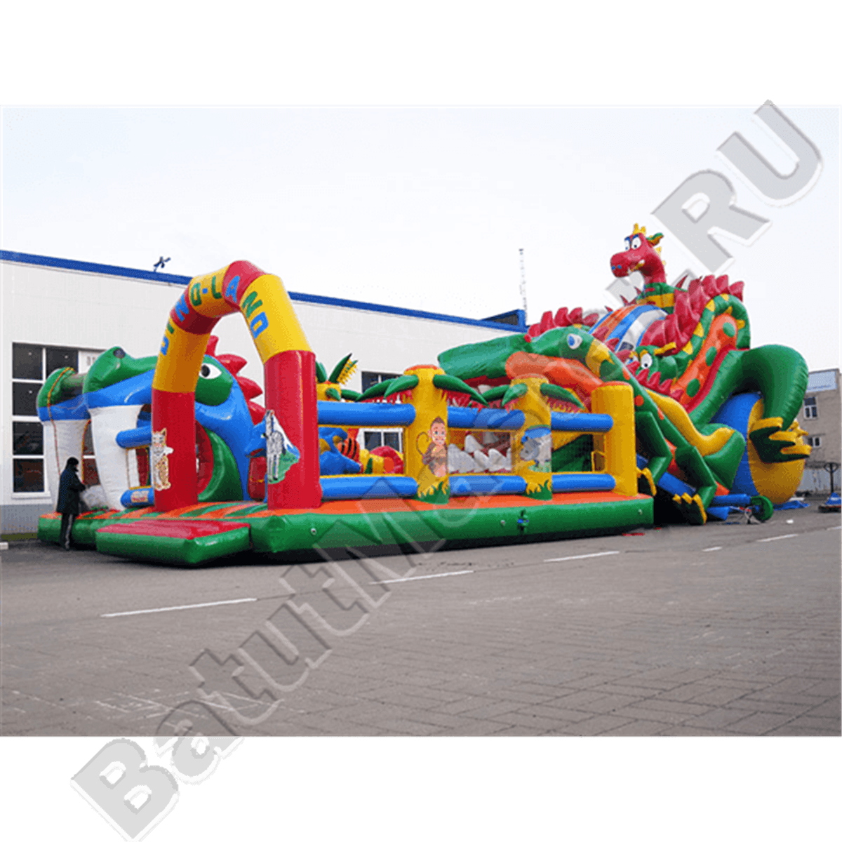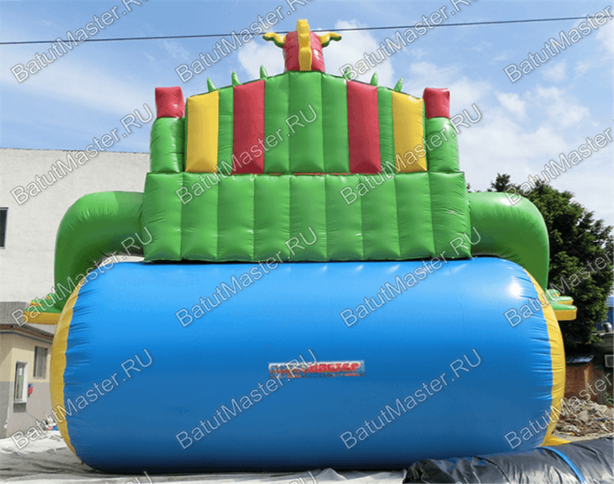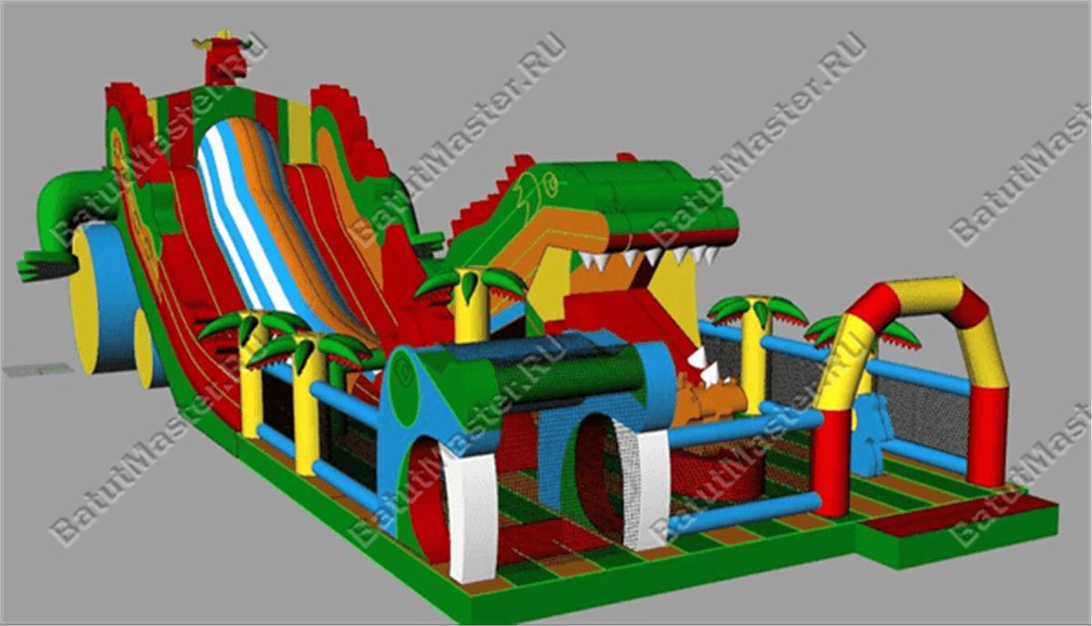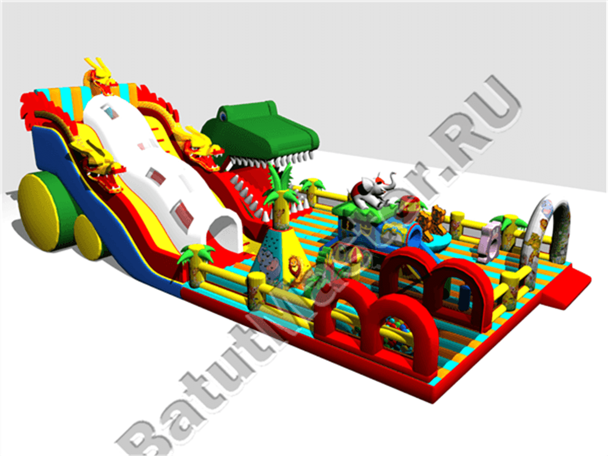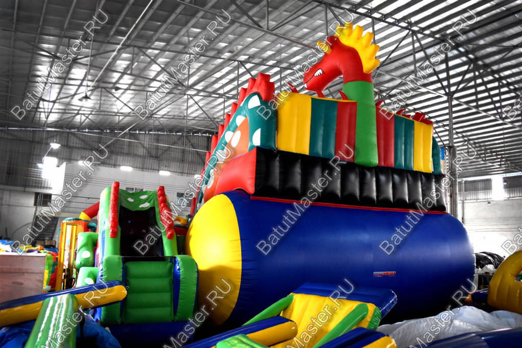 Но самая увлекательная и развлекательная зона батута размещается в его задней части. Здесь можно найти высокую горку, состоящую из трех склизов: справа – лестница, слева – горка, по центру – еще одна горка, но проходящая внутри тоннеля. Своей конструкцией тоннель напоминает туловище дракона, так как является продолжением яркой головы, установленной на общей стартовой площадке с высотой 5 м. В дальнем правом углу батута оборудована яркая зеленая робот-пасть, напоминающая настоящую пасть дракона. Остальная территория площадки вмещает в себе целое множество небольших надувных фигур, с которыми ребятам будет интересно подружиться и поиграть.