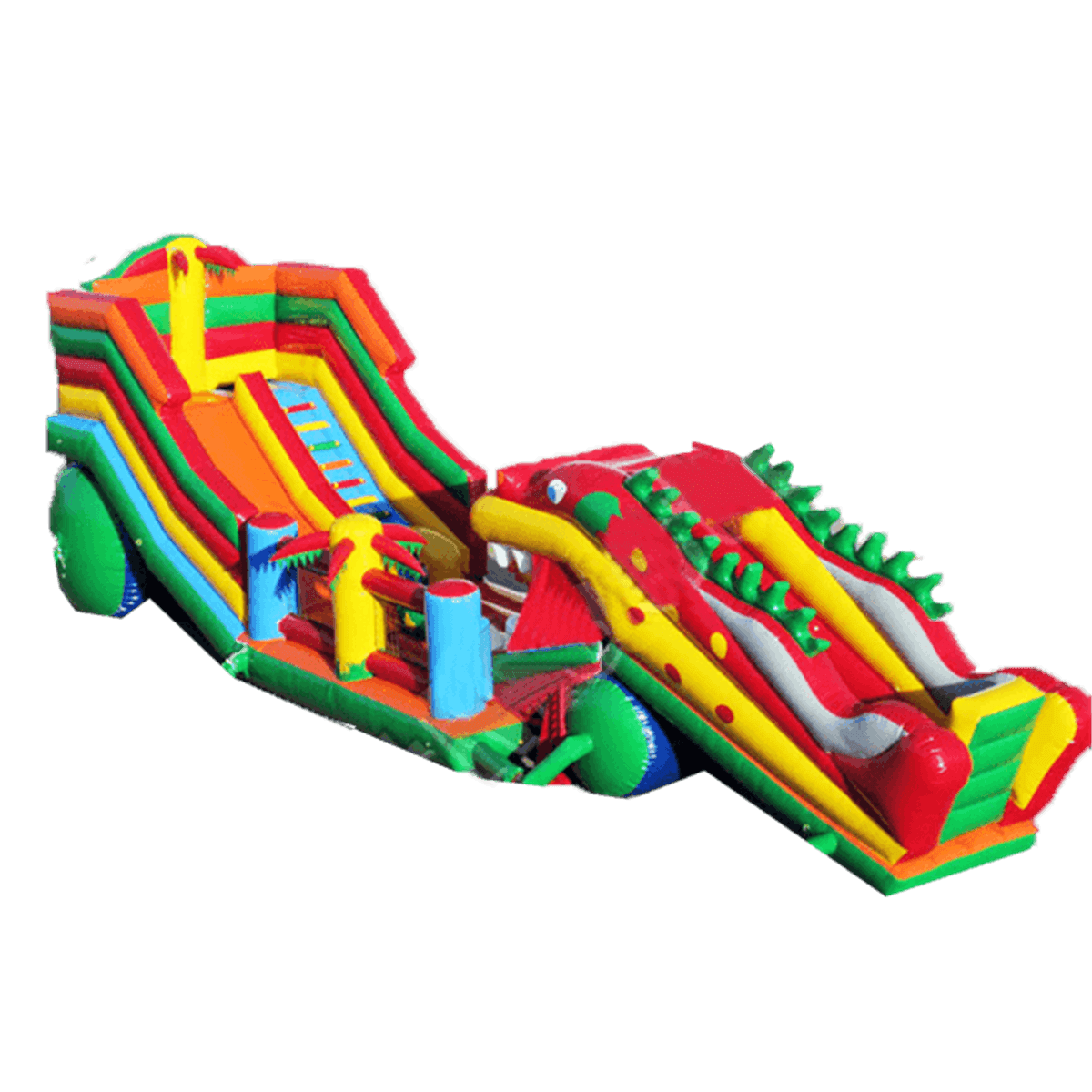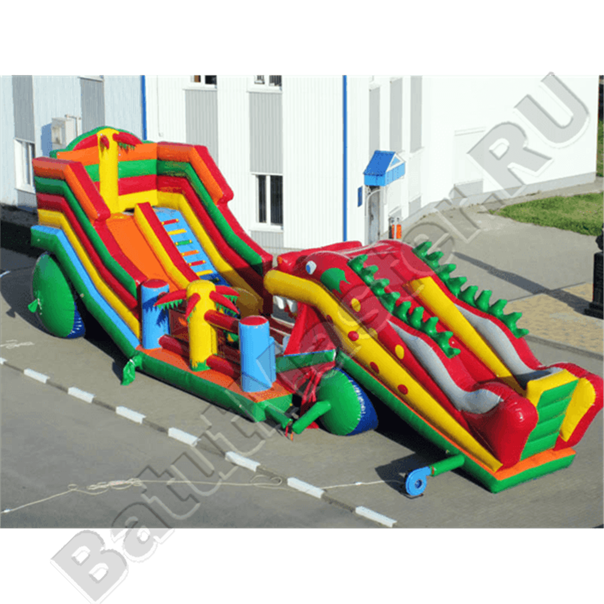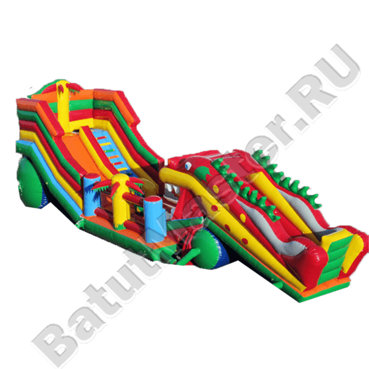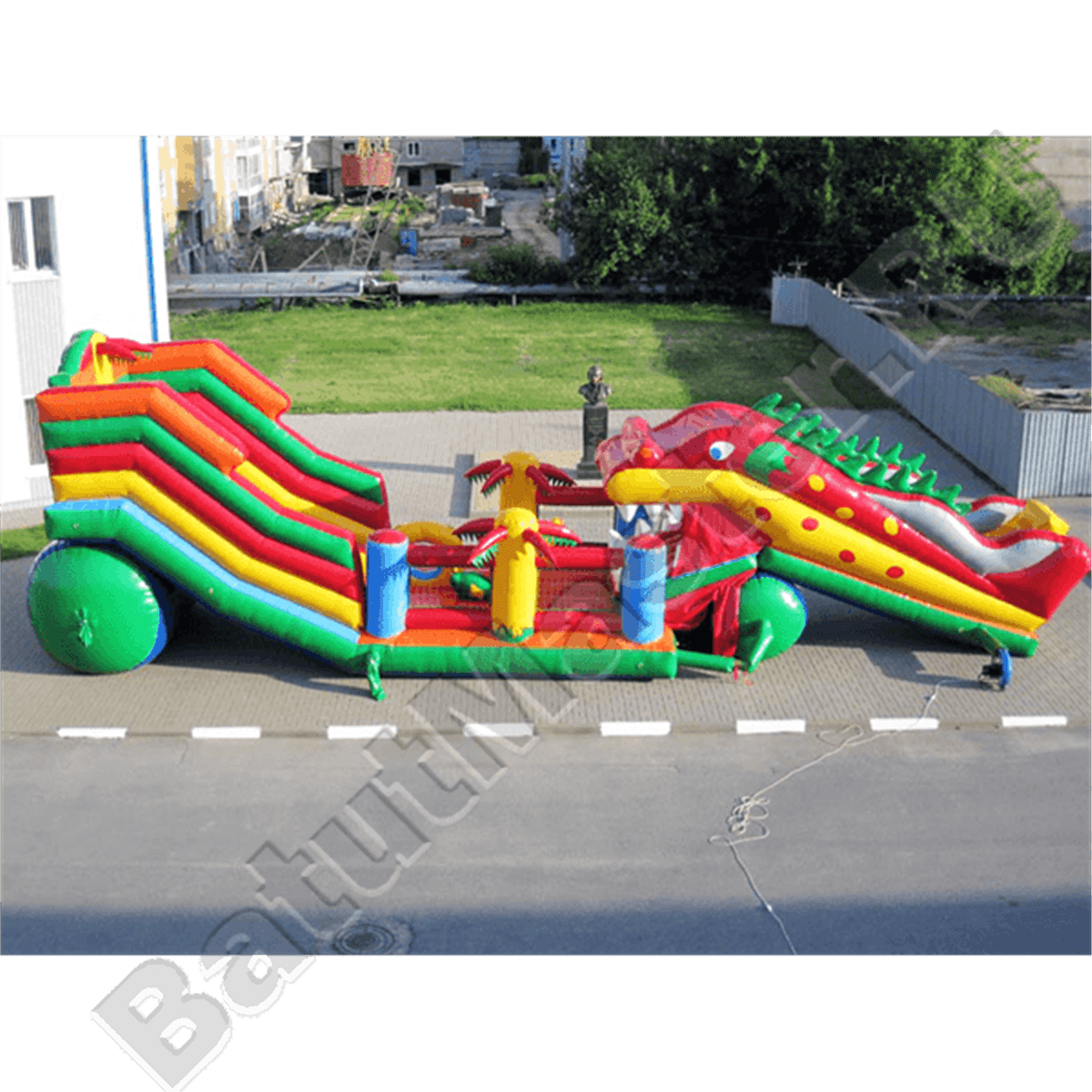 И без того яркий батут дополнен тематическими элементами в виде пальм по бокам стенок. Помимо горки и дракона-робота в нижней части батута имеется несколько спортивных снарядов для лазания и прыжков, поэтому такой большой батут станет уместным для любой детской площадки.