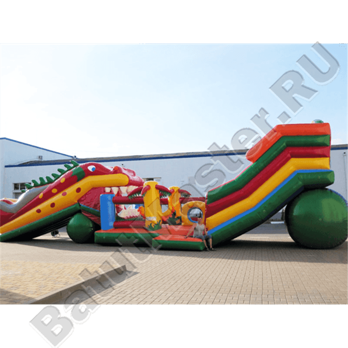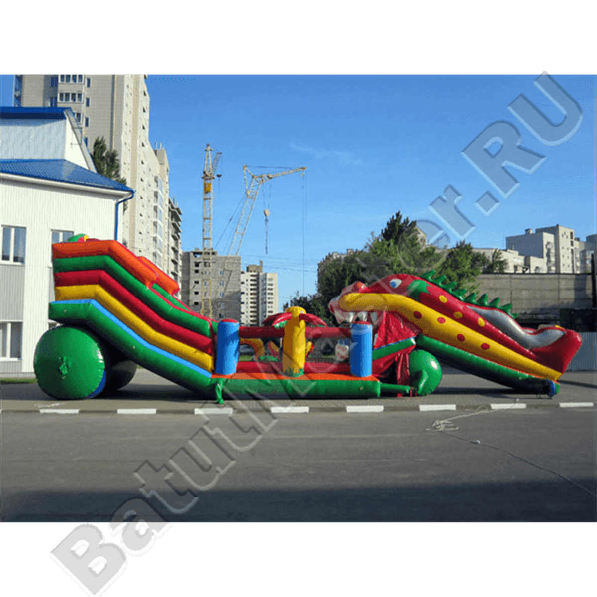 Батут «Дракоша» выполнен в необычном стиле. Это массивная продолговатая конструкция с горкой с одной стороны и ярким батутом-роботом с другой. Яркое оформление комплекса придает габаритной конструкции легкости и добавляет ей популярности.