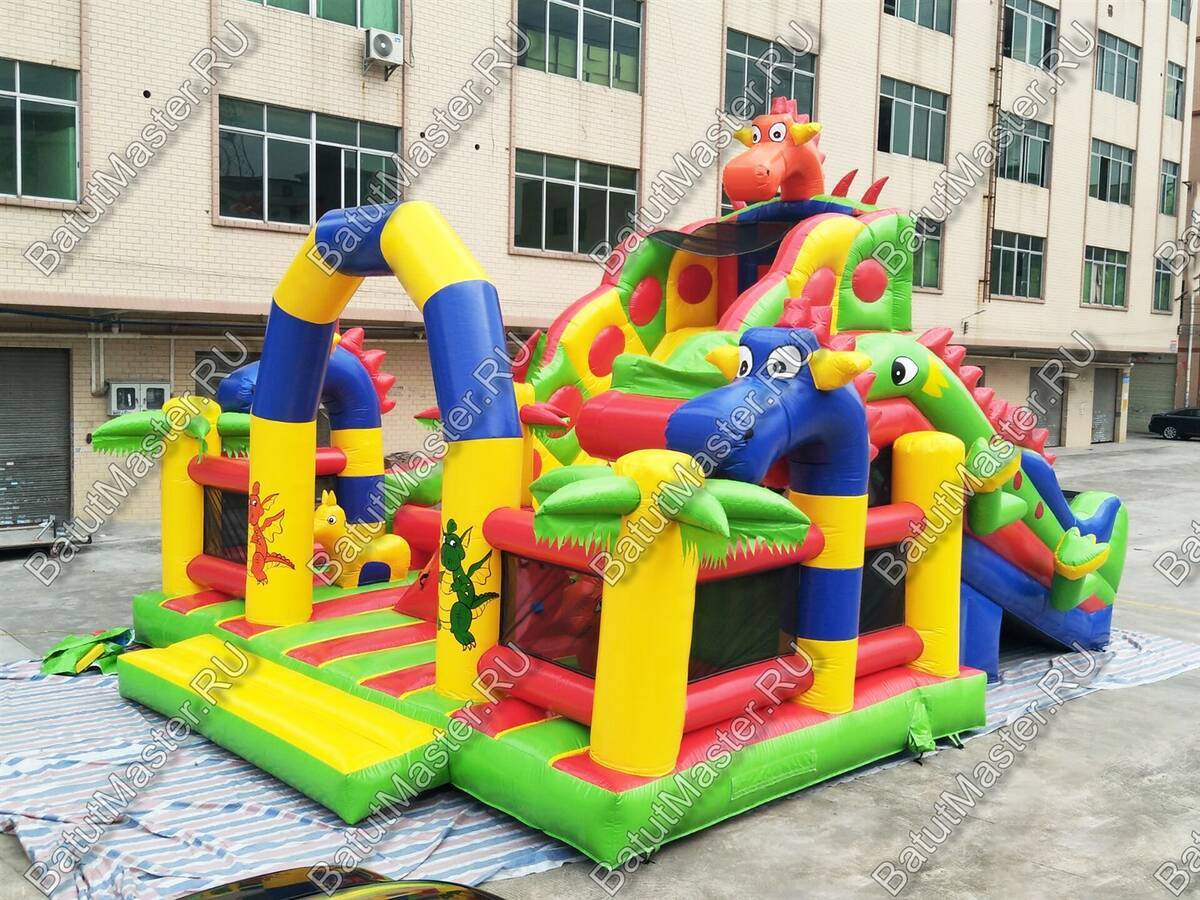 Надувная горка «Три дракона» привлечет внимание детей разного возраста. Это не просто надувной батут, это целая арена для невероятных приключений, где дети получат незабываемые эмоции. Наличие небольших надувных модулей в виде собачки, лягушки, котенка понравится маленьким непоседам, ведь на них можно забираться и весело падать на мягкую основу батута. Здесь также есть небольшой скалодром, а внутрь одного большого дракона можно даже забраться. Второй дракон украшает комплекс слева, а третий возвышается над горкой. Все вокруг цветное и яркое, везде хочется полазать и попрыгать.