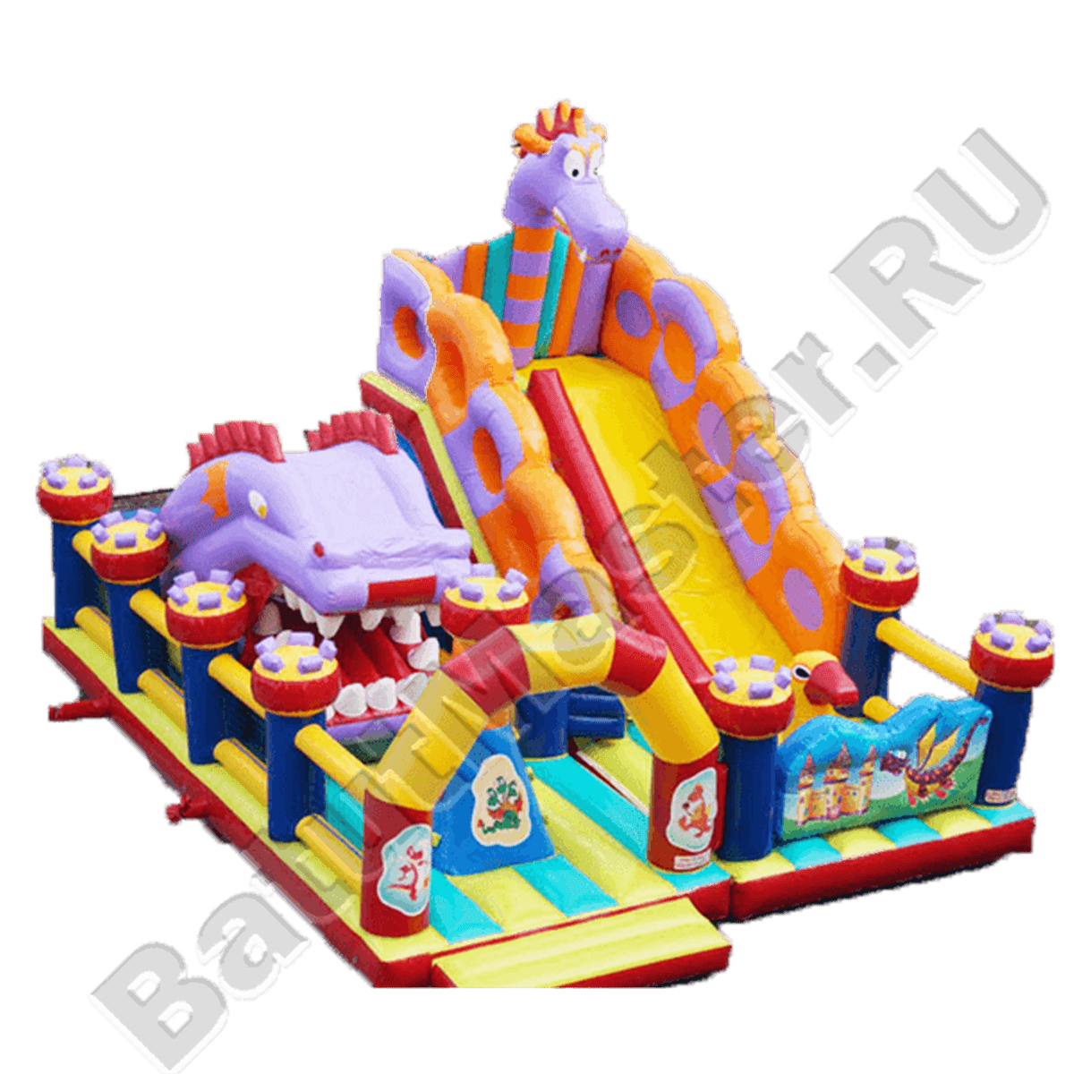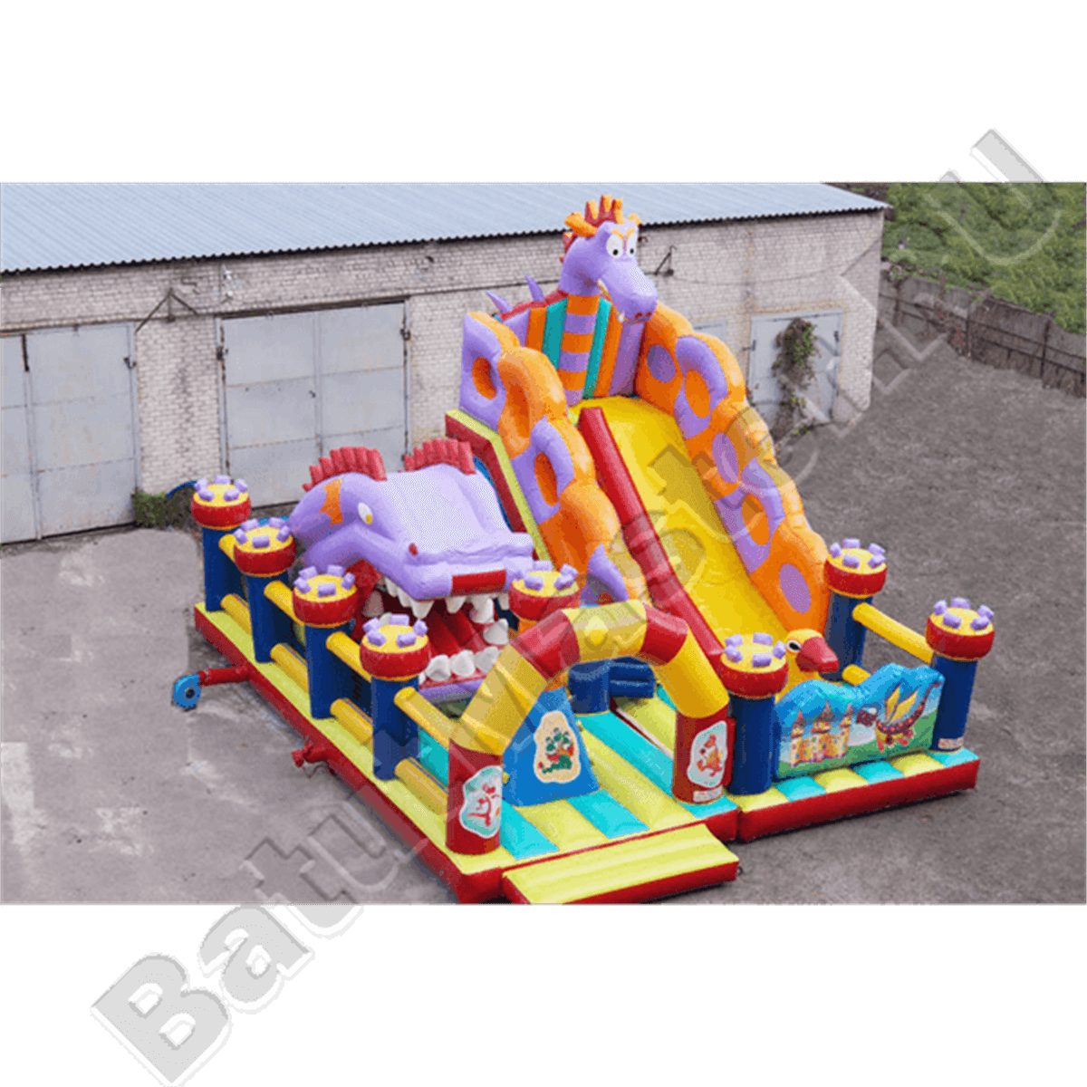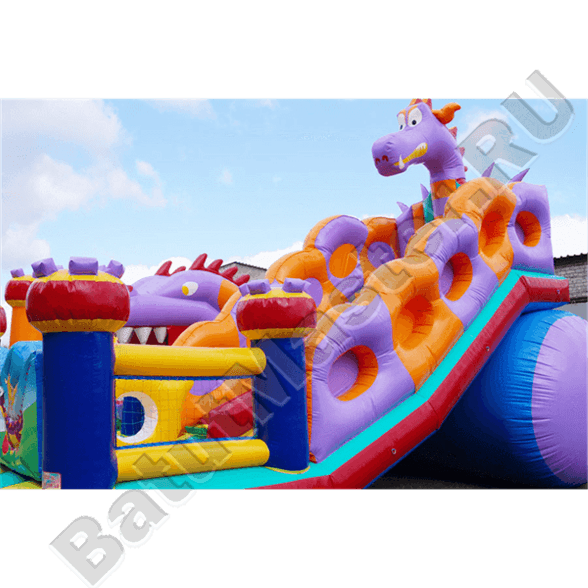 Вход внутрь комплекса представлен в виде арочной перекладины, сразу на входе расположен скалодром, далее установлен своеобразный робот в виде головы ящера с раскрывающимся ртом. Внутри головы малыши могут прятаться и прыгать. Правую сторону огромного аттракциона занимает высокая горка с надувной фигурой дракона на верхней площадке. Подняться туда можно посредством мягкой лестницы с прочными ступенями из добротного ПВХ. Скатиться с высокой горки могут малыши всех возрастов, поскольку полотно выполнено из качественного практичного материала.
