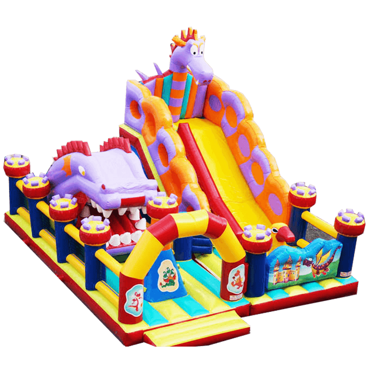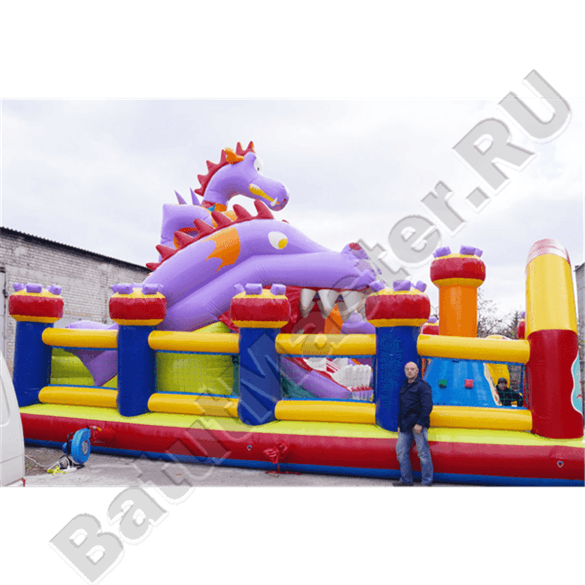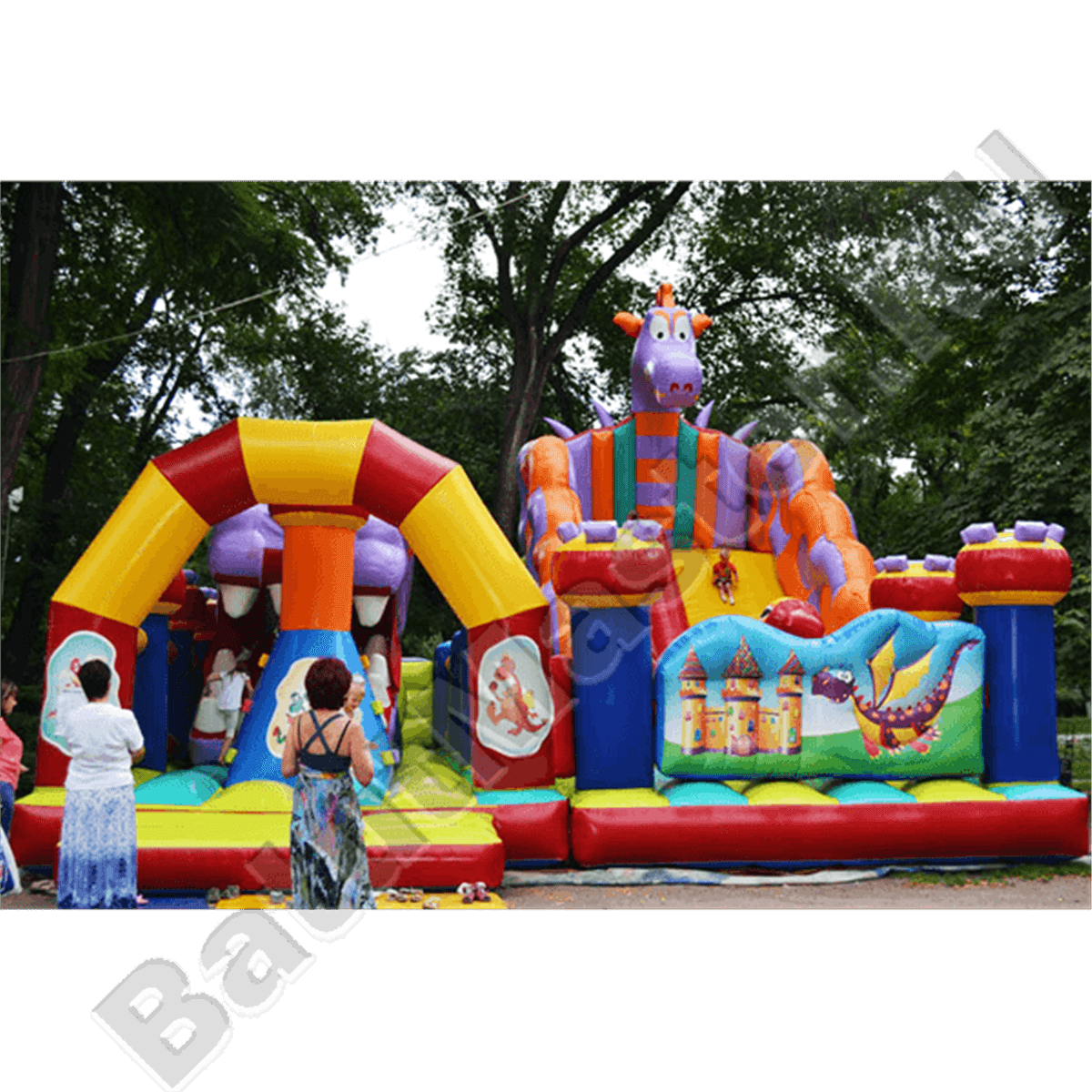 Вход внутрь комплекса представлен в виде арочной перекладины, сразу на входе расположен скалодром, далее установлен своеобразный робот в виде головы ящера с раскрывающимся ртом. Внутри головы малыши могут прятаться и прыгать. Правую сторону огромного аттракциона занимает высокая горка с надувной фигурой дракона на верхней площадке. Подняться туда можно посредством мягкой лестницы с прочными ступенями из добротного ПВХ. Скатиться с высокой горки могут малыши всех возрастов, поскольку полотно выполнено из качественного практичного материала.