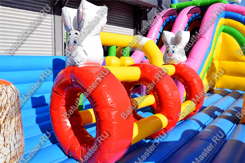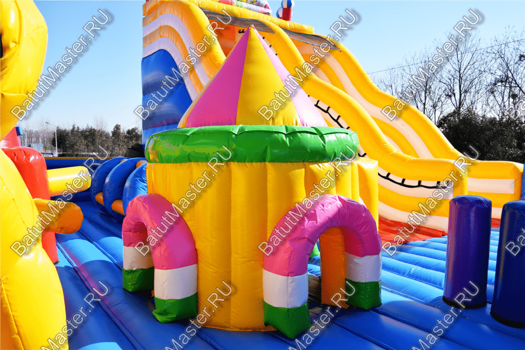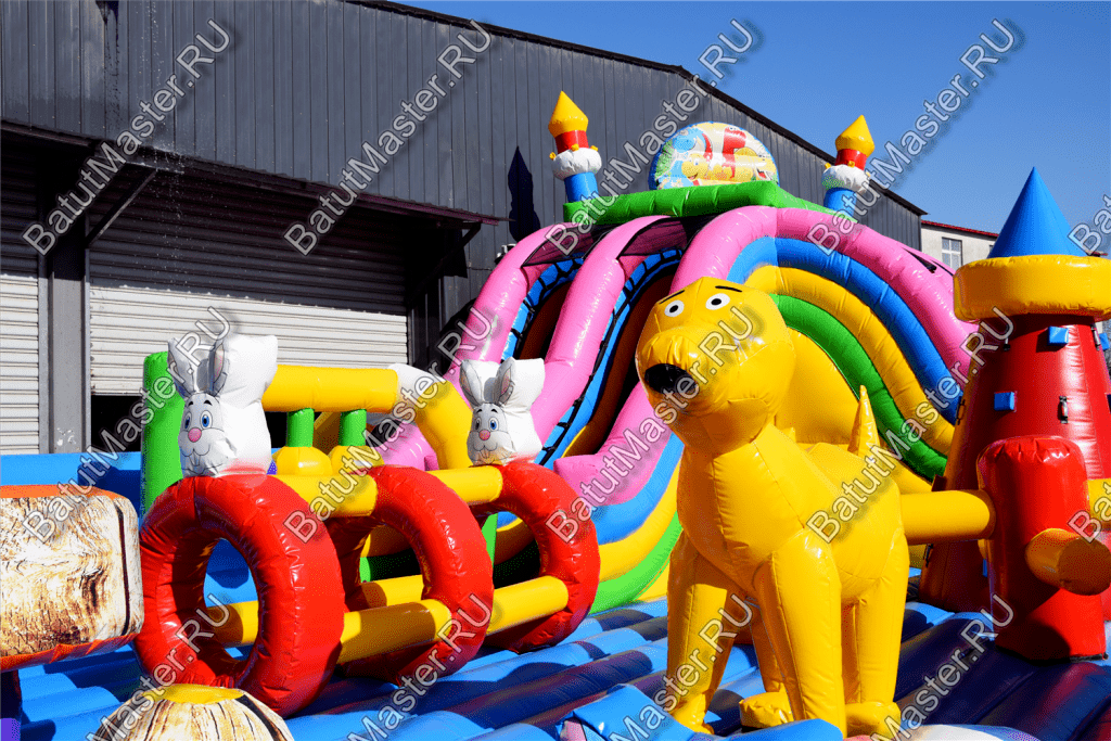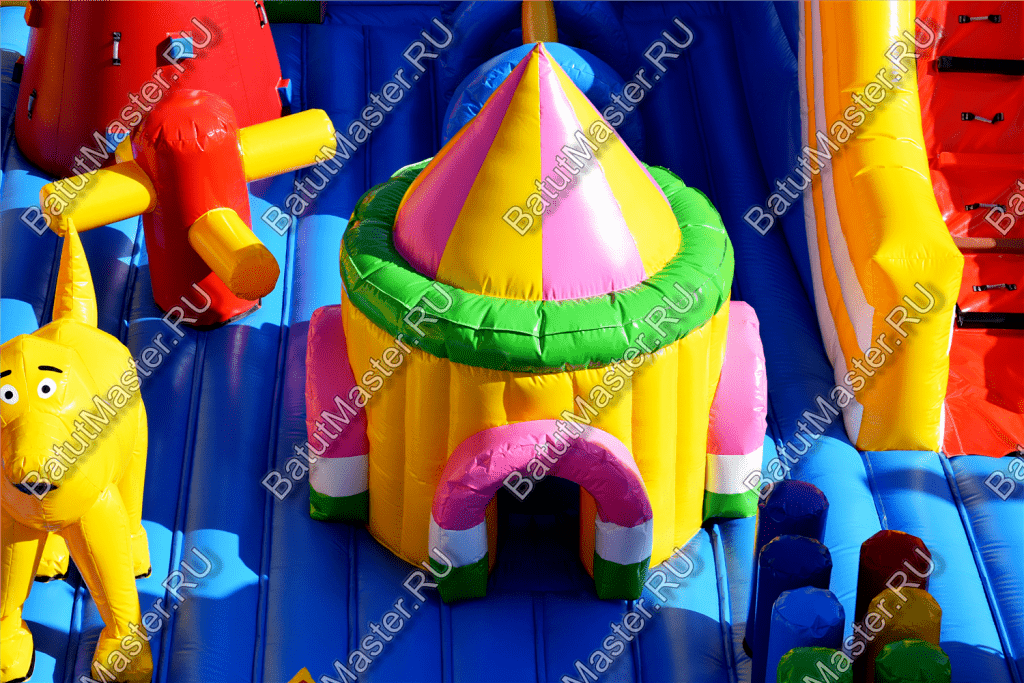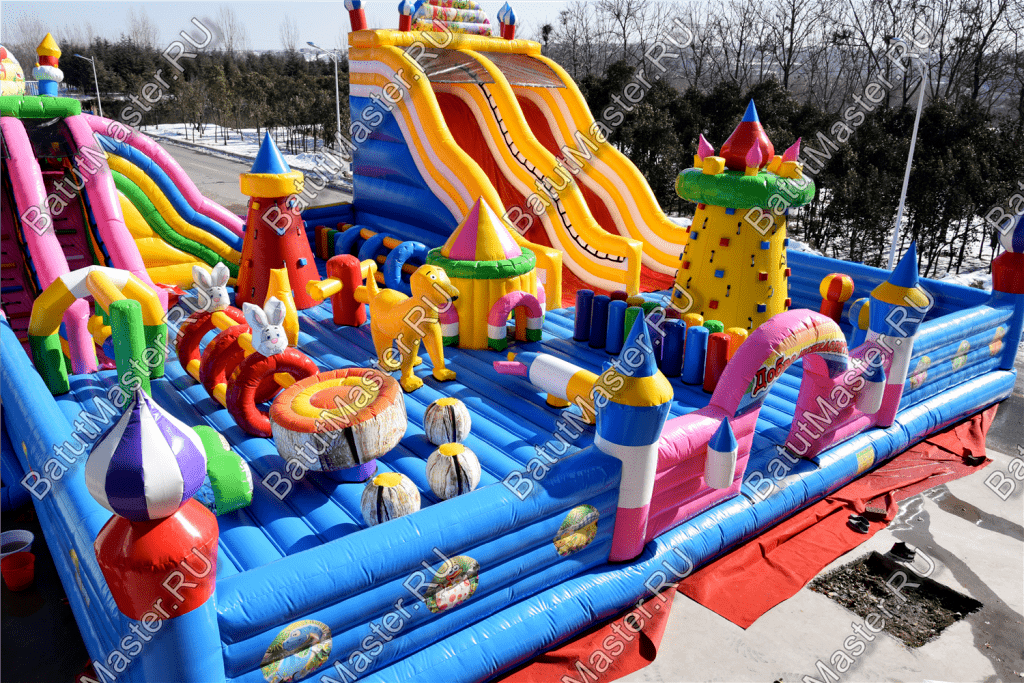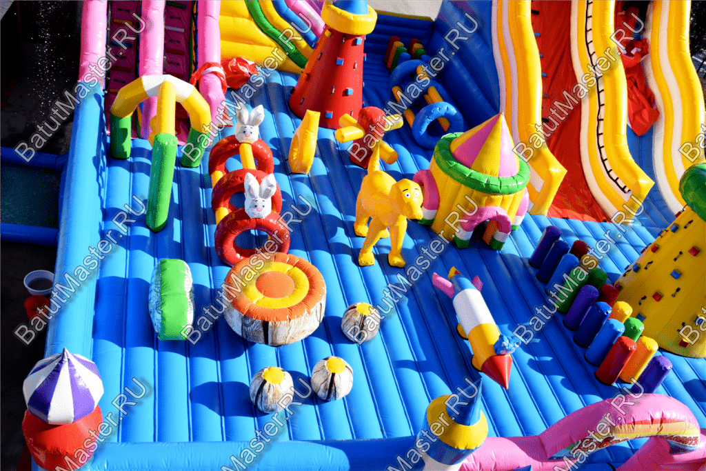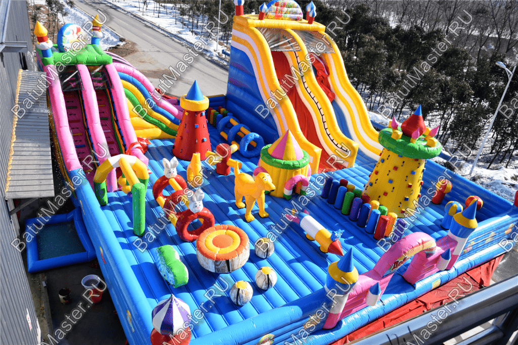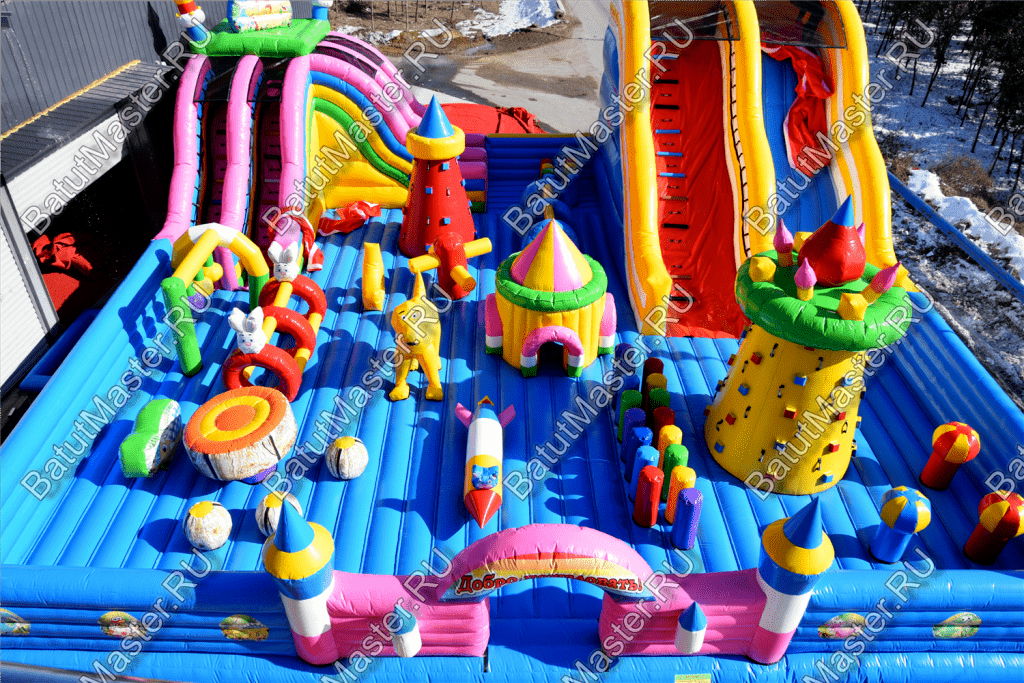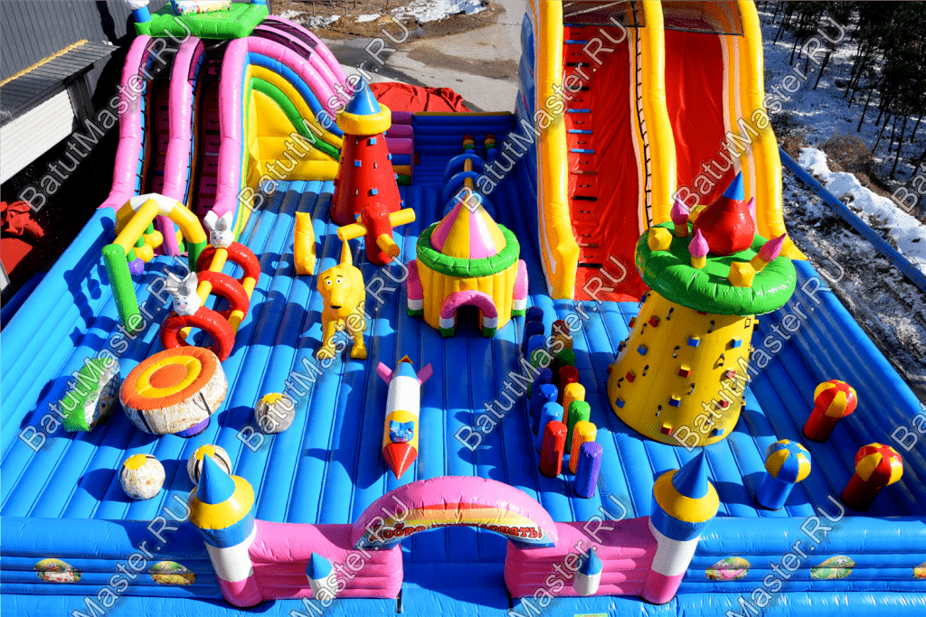 Ребят встретят надувные зверята, небольшой жёлто-розовый замок, несколько горок, красочные фигурки и скалодромы. Есть две зоны: одна для малышей, вторая для ребят постарше. У малышей есть своя небольшая горка, скалодром и полоса препятствий. То же самое есть и у второй группы детей. Они могут вдоволь накататься, при этом, не мешая друг другу. Если кто-то устанет и захочет отдохнуть, то может спрятаться в небольшом замке, укрывшись ото всех остальных.
