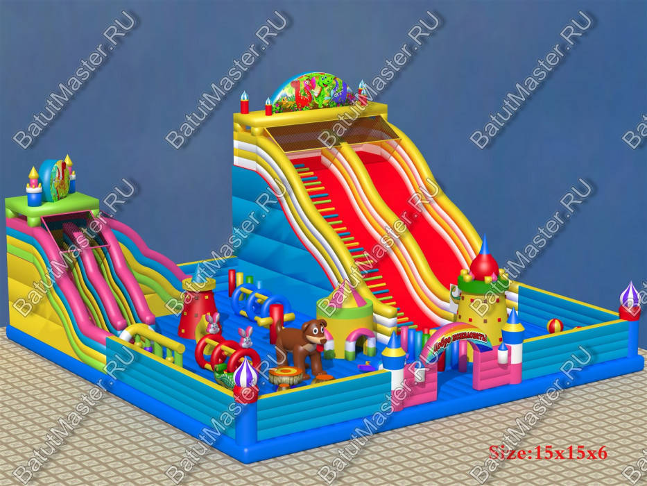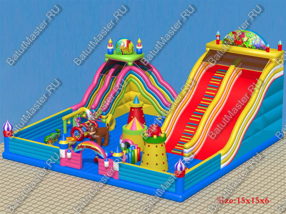Коммерческий надувной батут «Дино-городок» полностью отражает своё название. Ребёнок и в самом деле очутится в настоящем игровом городке с динозаврами, где находится очень много развлечений на любой вкус. На входе ребёнка сразу встречает большой динозавр, стоящий верхом на горке. Двойная горка является центром площадки, а вокруг располагаются различные игровые зоны.