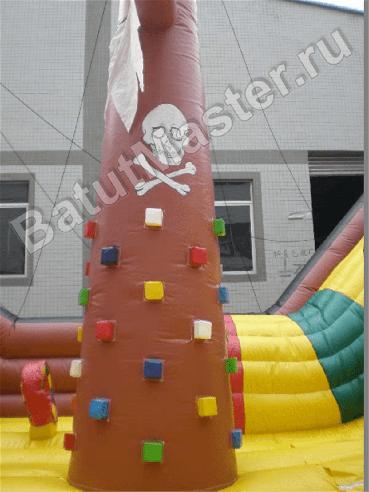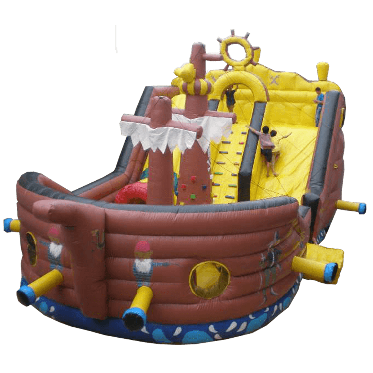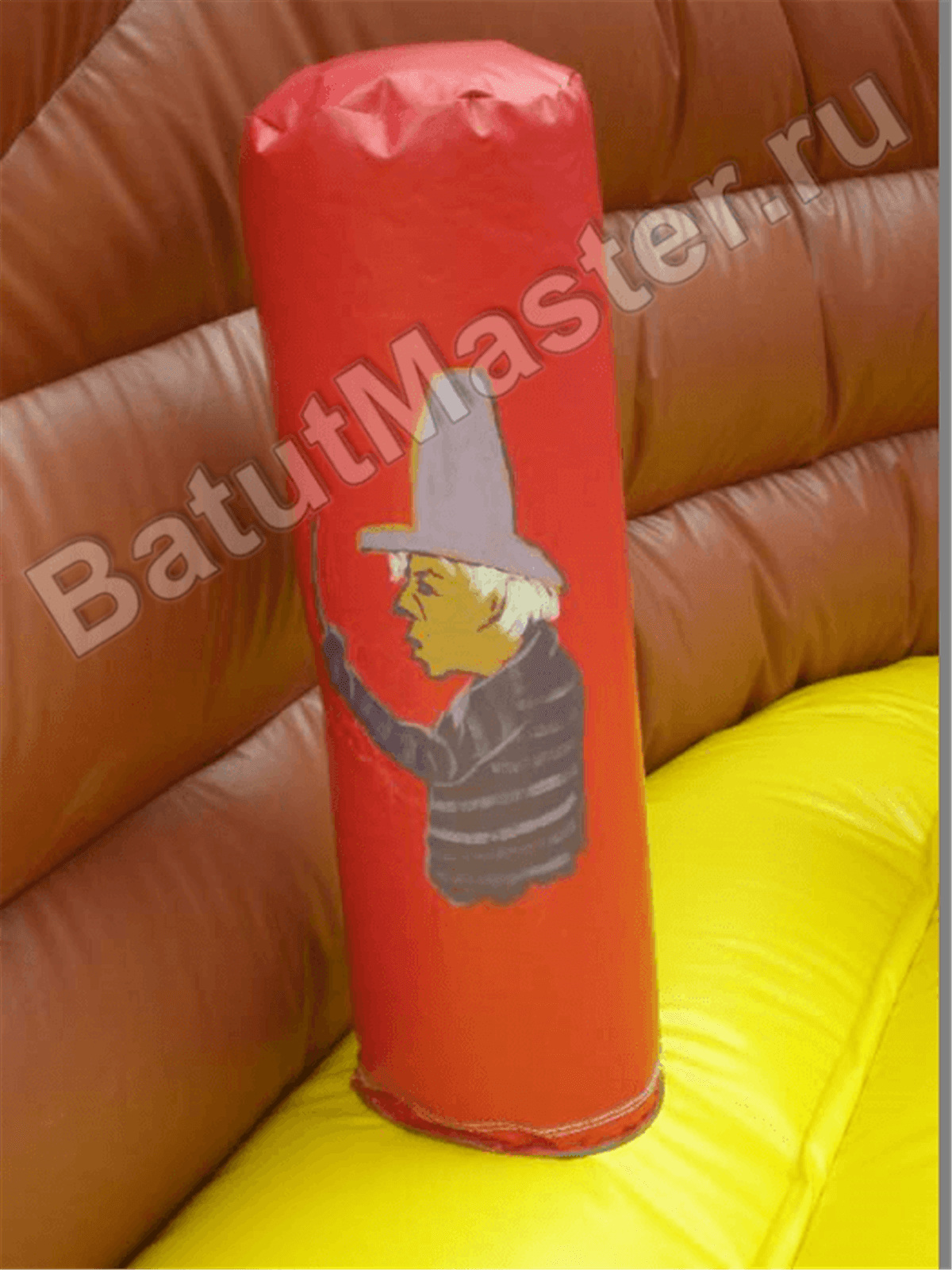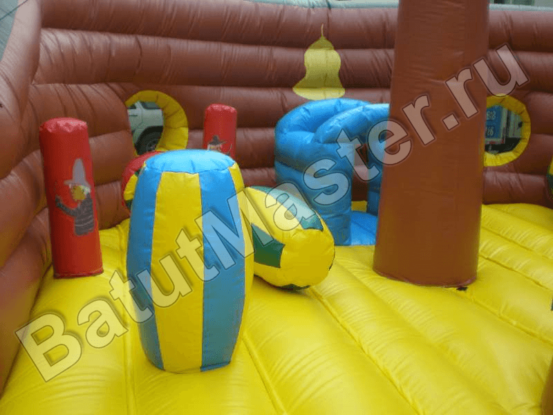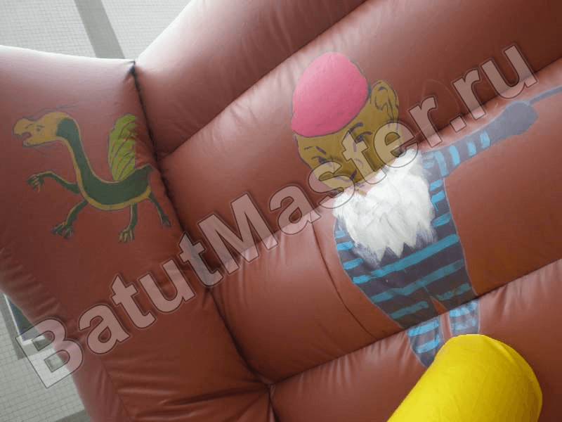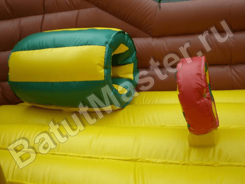 Большой надувной аттракцион «Фрегат» - это высокий батут-горка ярко коричневого цвета с насыщенными деталями солнечного оттенка. Игровой комплекс выполнен в форме настоящего корабля, передняя часть аттракциона представлена игровой плоскостью с разнообразными игровыми элементами. На прыгательной зоне установлены мягкие столбы, скала с мягкими кирпичами для лазания, цилиндры и различные игровые фигуры, преграды и трамплины.