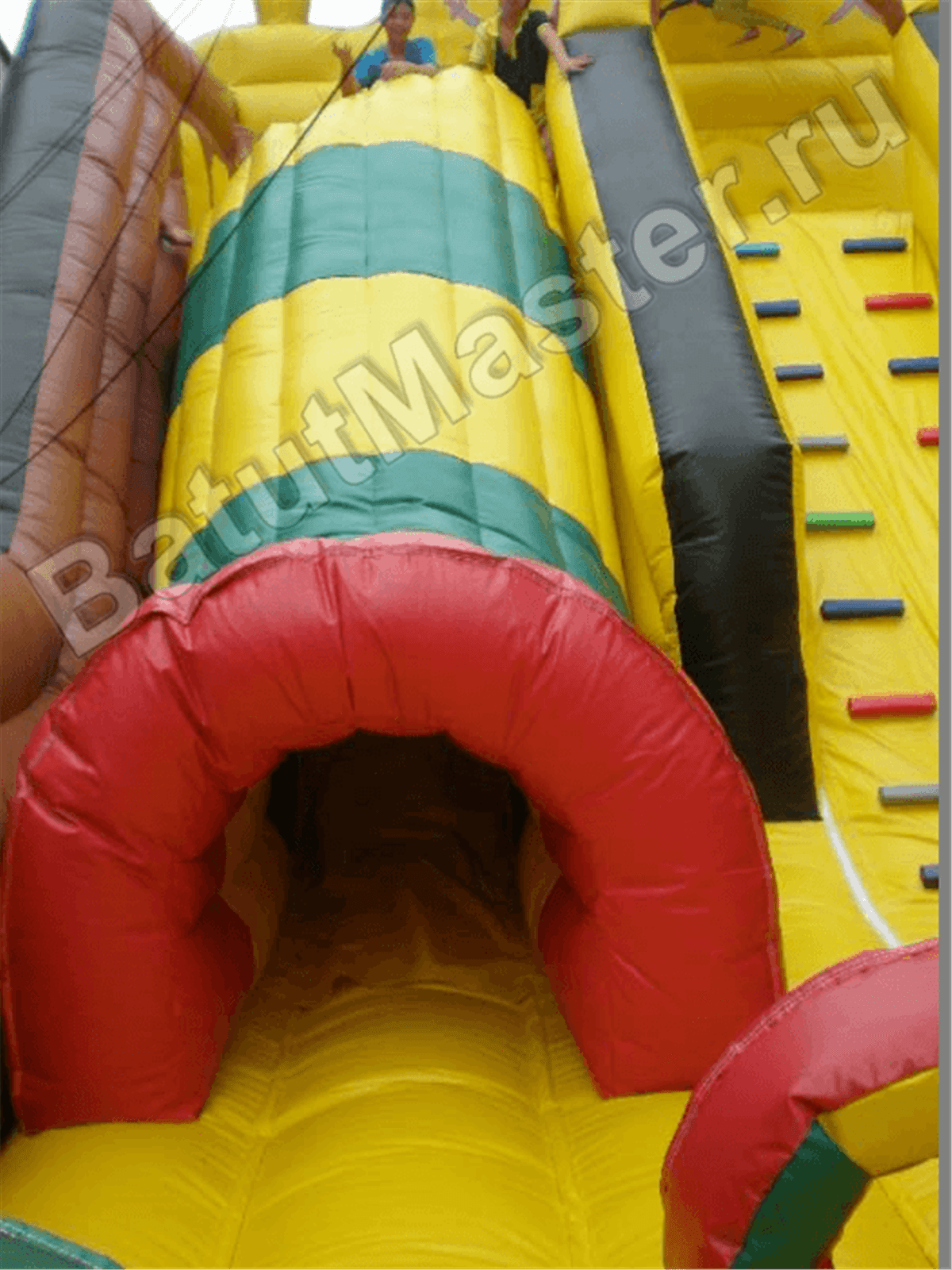 Внутренняя зона батута – это мягкая и упругая горка. Середина наклонной плоскости изготовлена в форме своеобразной лестницы с мягкими ступенями, по ним можно забраться наверх. Спуск с верхней площадки можно производить с двух сторон – правая часть сделана в виде гладкого спускового полотна, а левая выполнена в форме гладкой ленты с навесным тоннелем сверху.
